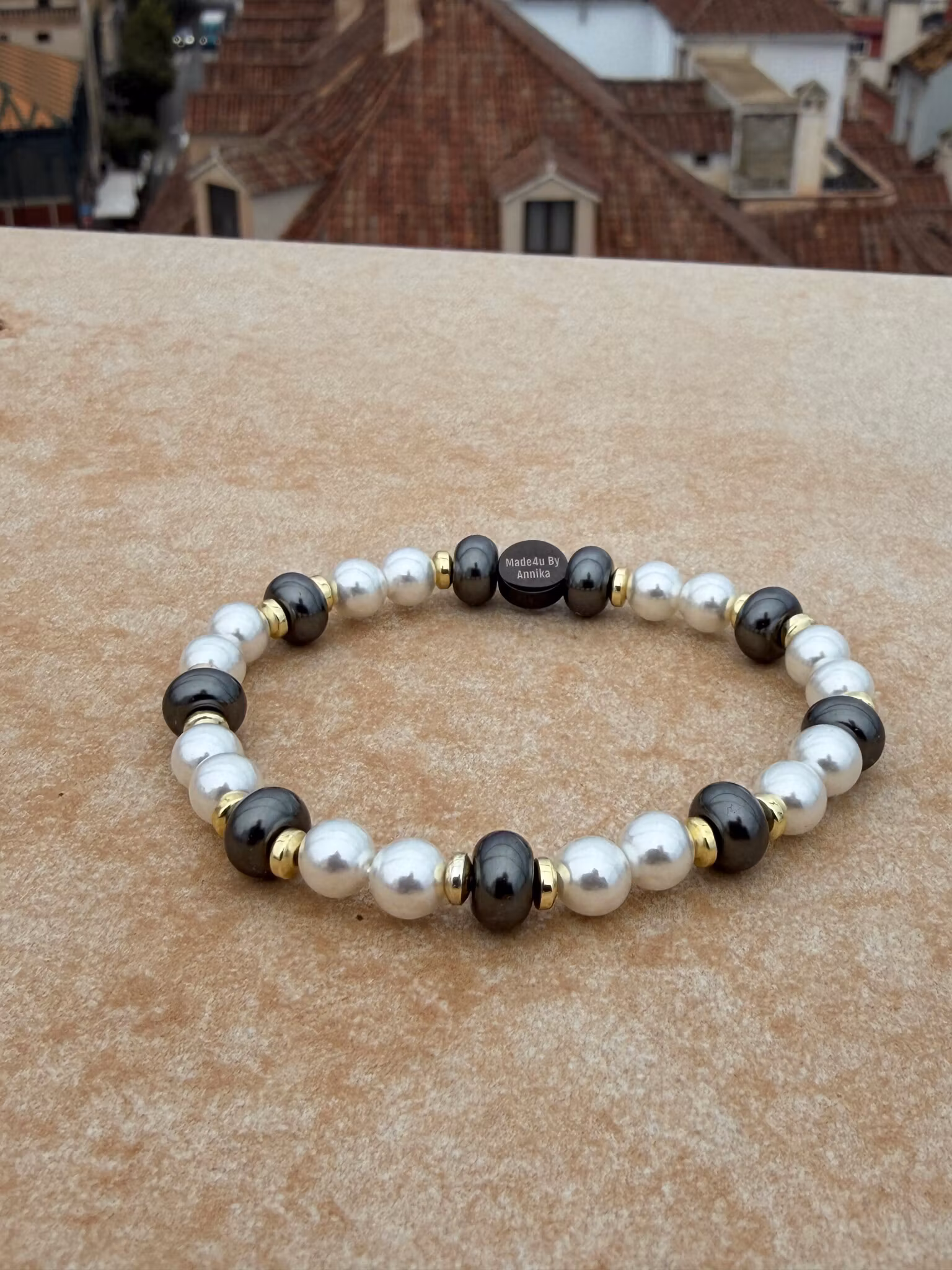 Ett vackert och stilrent armband med en elegant kombination av vita, högblanka glaspärlor, djupgrön hematit och 18K-pläterade hematitpärlor. De olika materialen samspelar i en harmonisk balans som ger smycket ett sofistikerat och tidlöst uttryck.