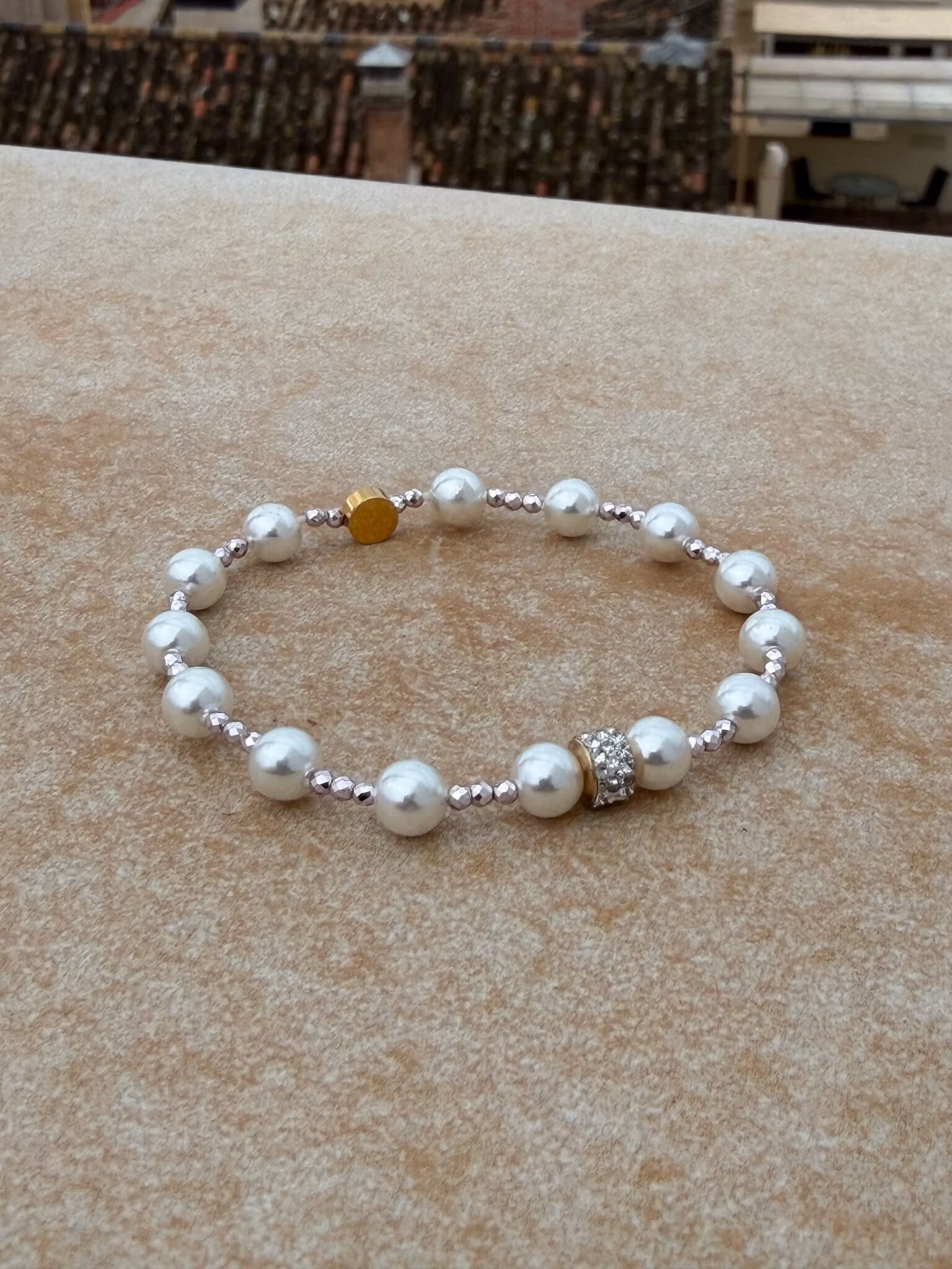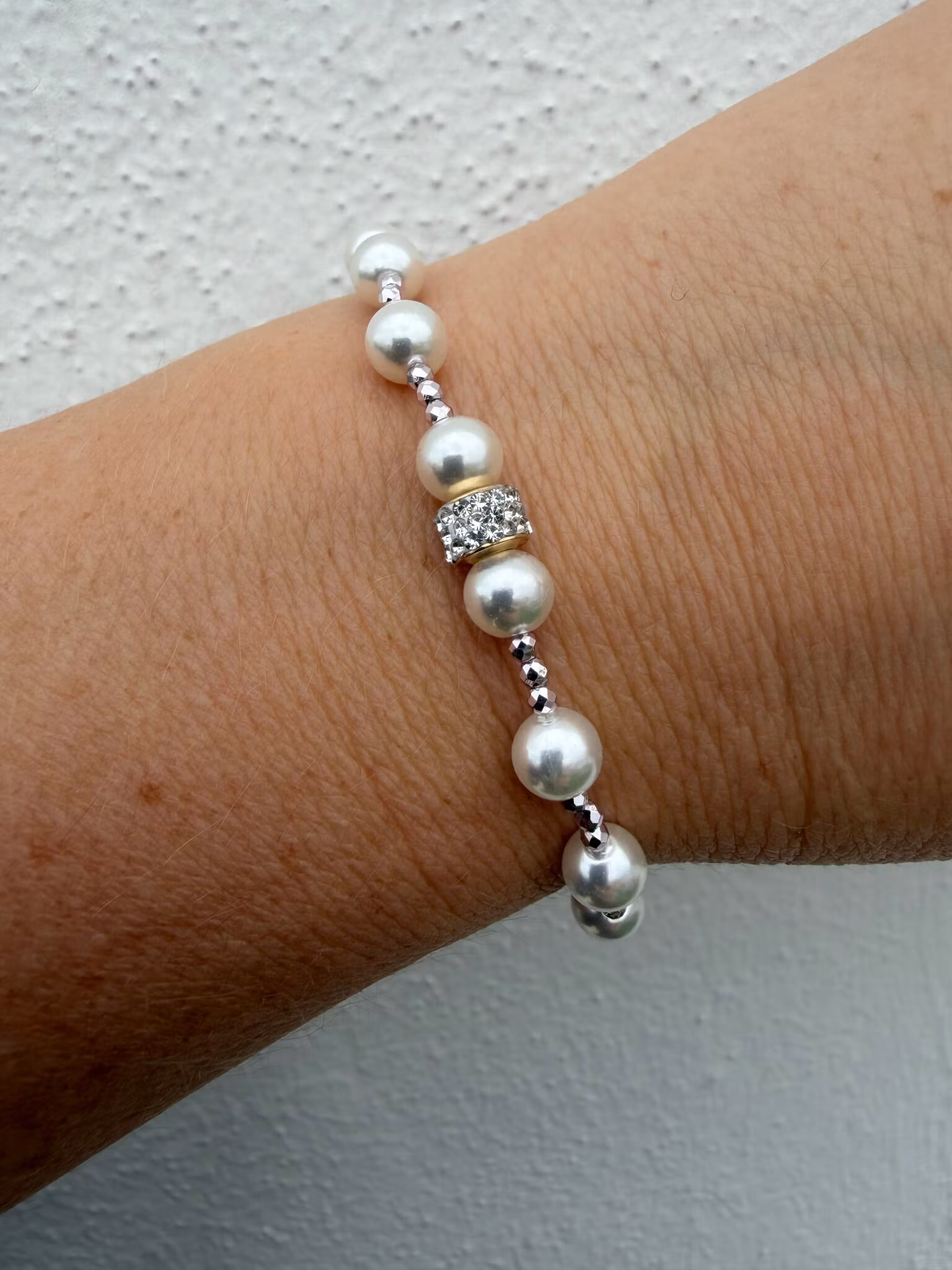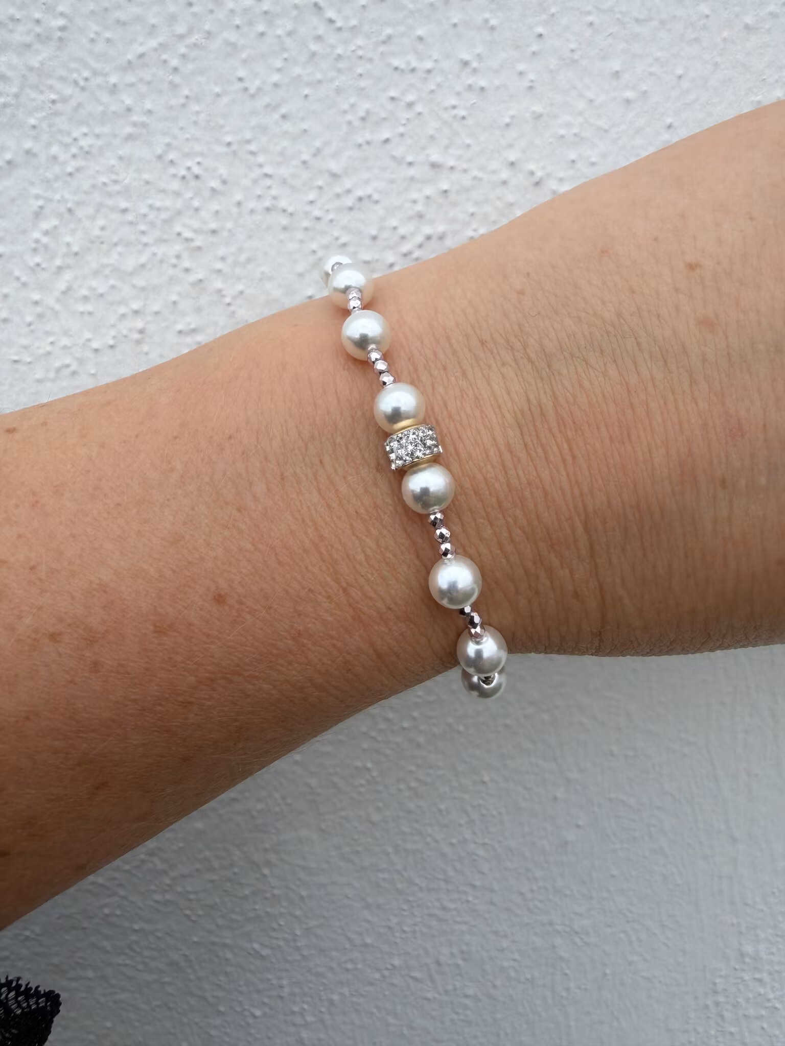 Ett vackert och sött pärlarmband med en elegant kombination av vita, högblanka glaspärlor och små, svagt lila, spegelblanka glaskristallpärlor. I centrum fångar gnistrande strass blicken och ger smycket en subtil lyster. Som alltid avslutas armbandet med min signaturpärla – en unik detalj som ger ett personligt och exklusivt uttryck.