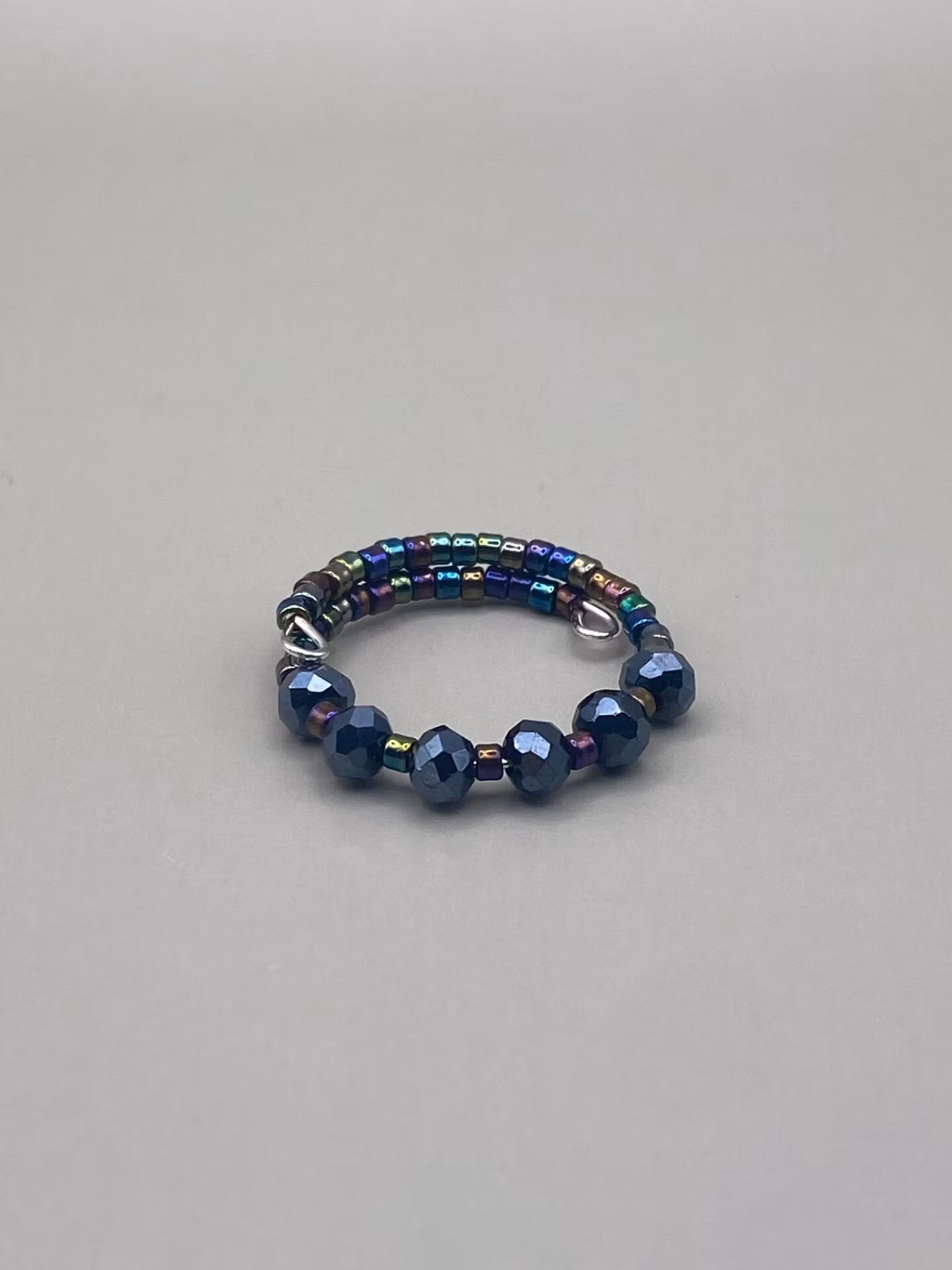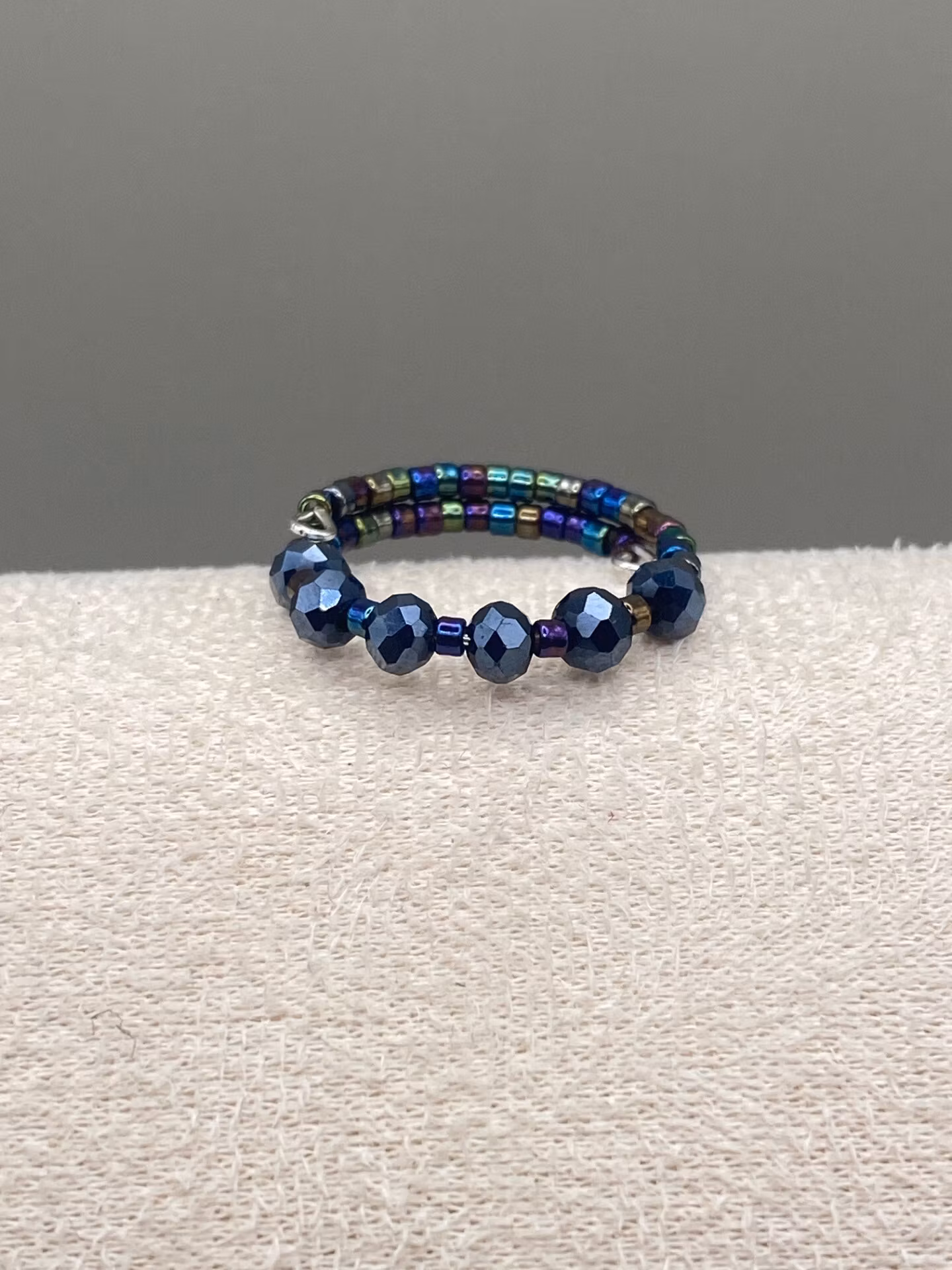 Vacker ring i enkelradigt mönster av små flerfärgadeglaspärlor runt om, facetterade midnattsblå spegelblanka glaskristallpärlor i blickfånget. Skimrar otroligt vackert på fingret.