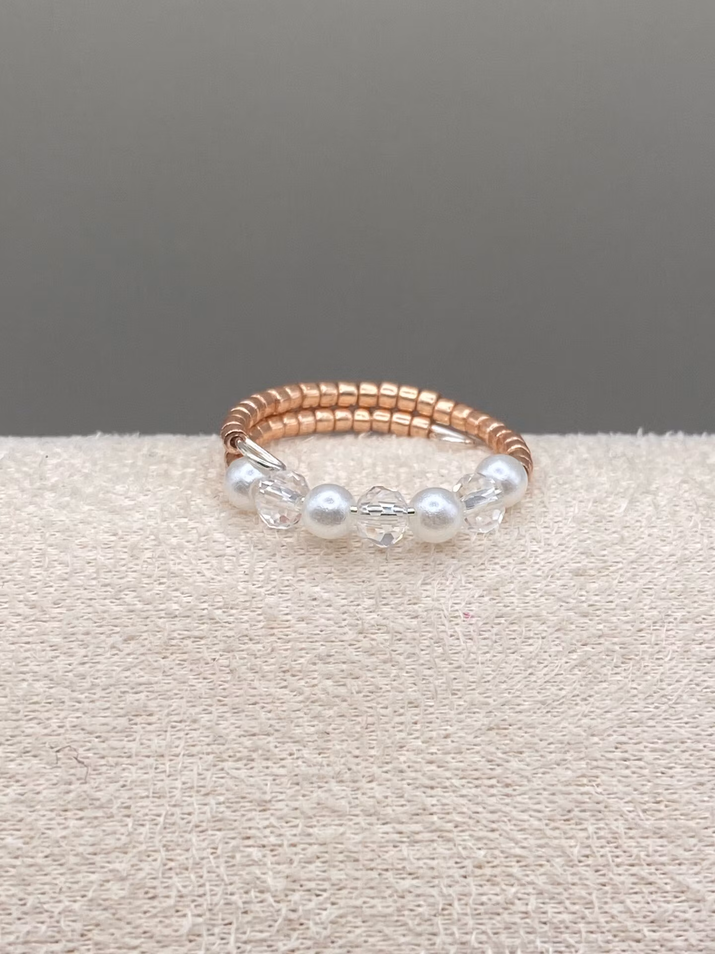 Söt ring i enradigt mönster av små roséfärgade glaspärlor runt om och i blickfånget en rad med varvatvita små runda pärlor och klara facetterade glaskristallpärlor. Superfin, stilren.