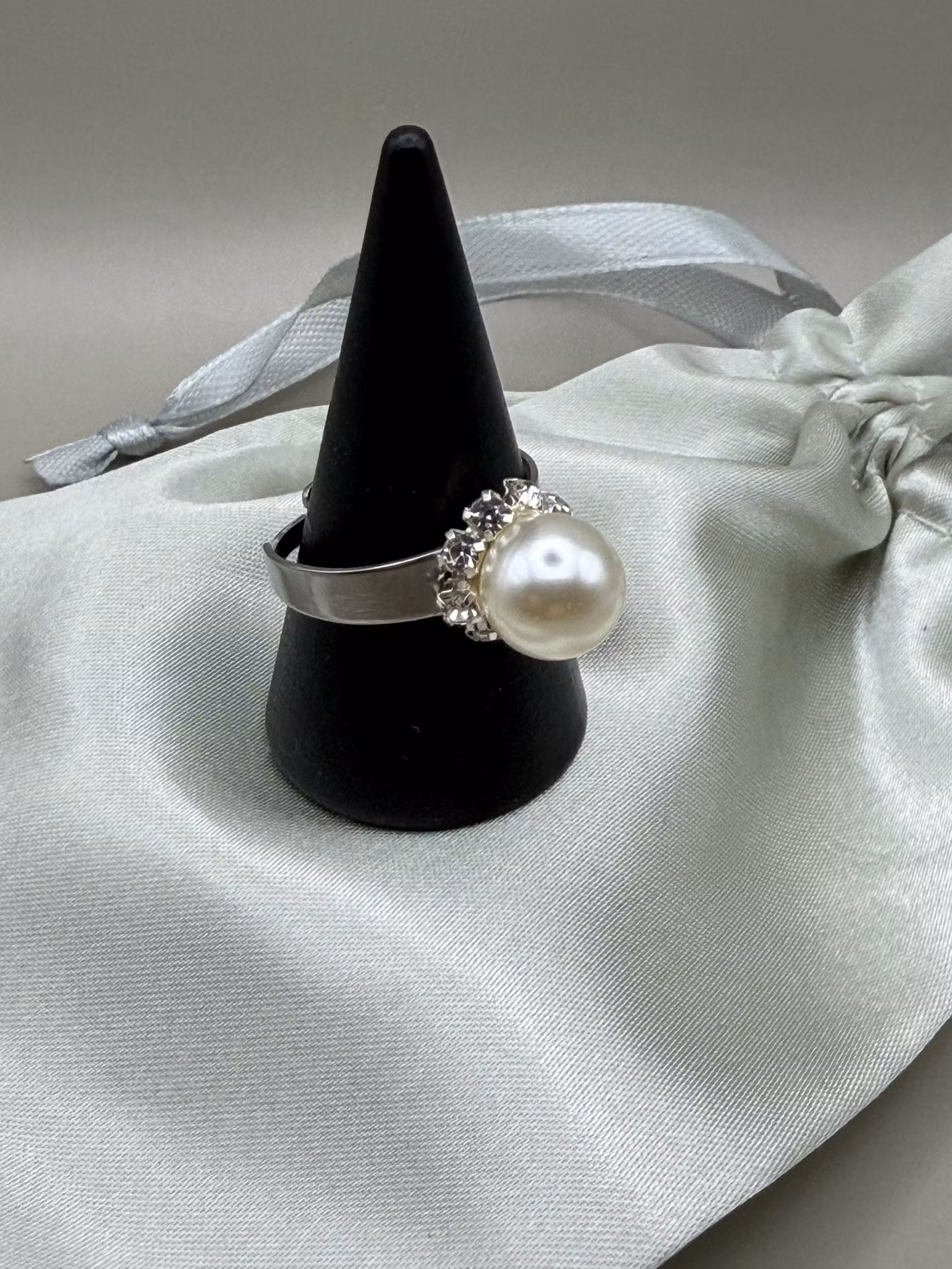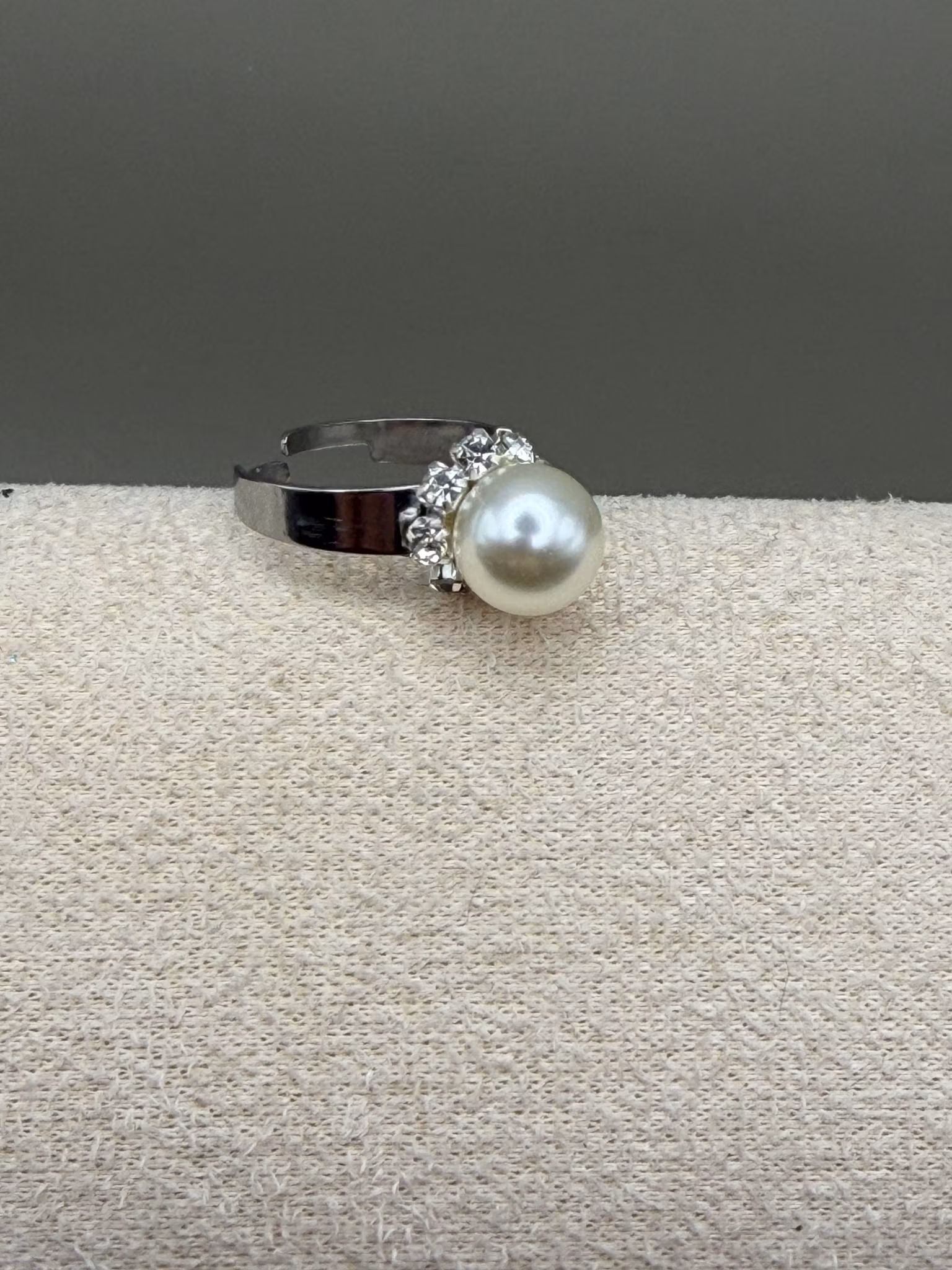 Lekfull ring med stor vit blank pärla omgiven av klar strass.
