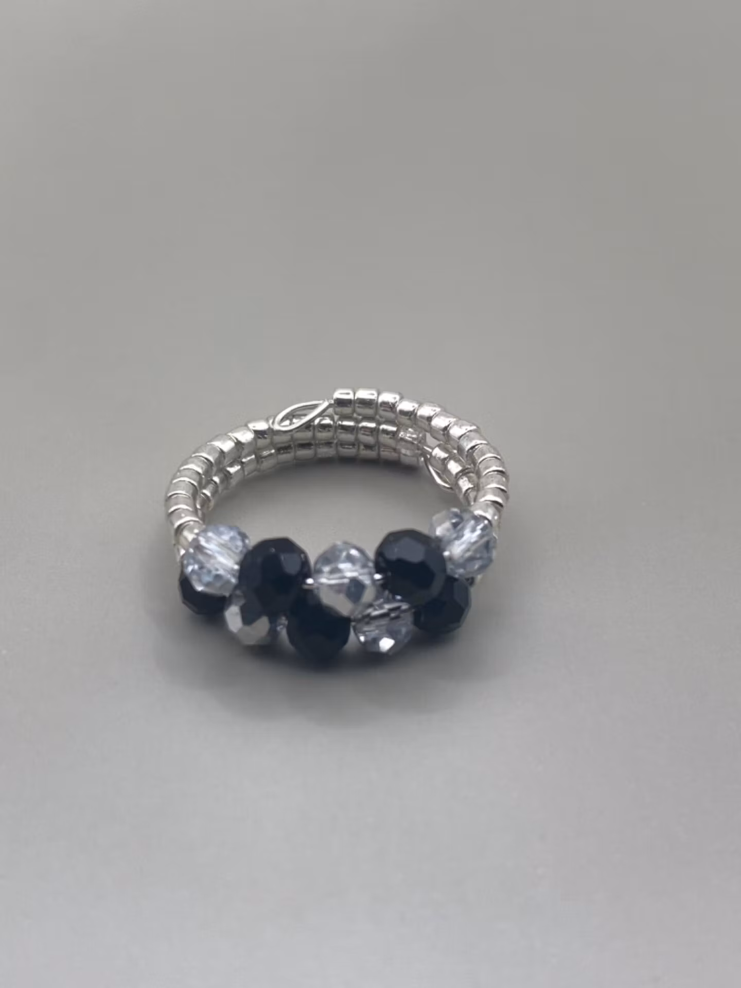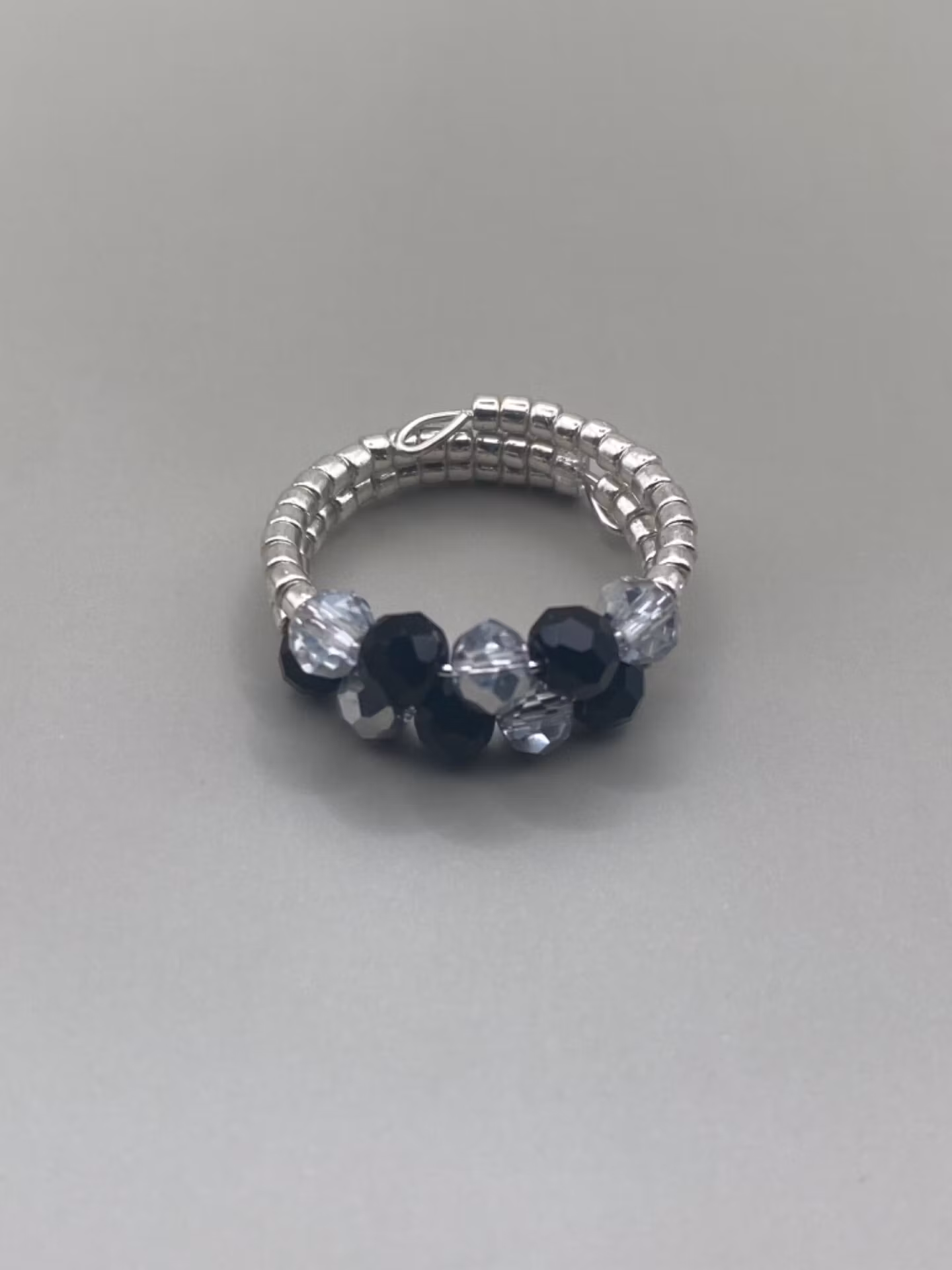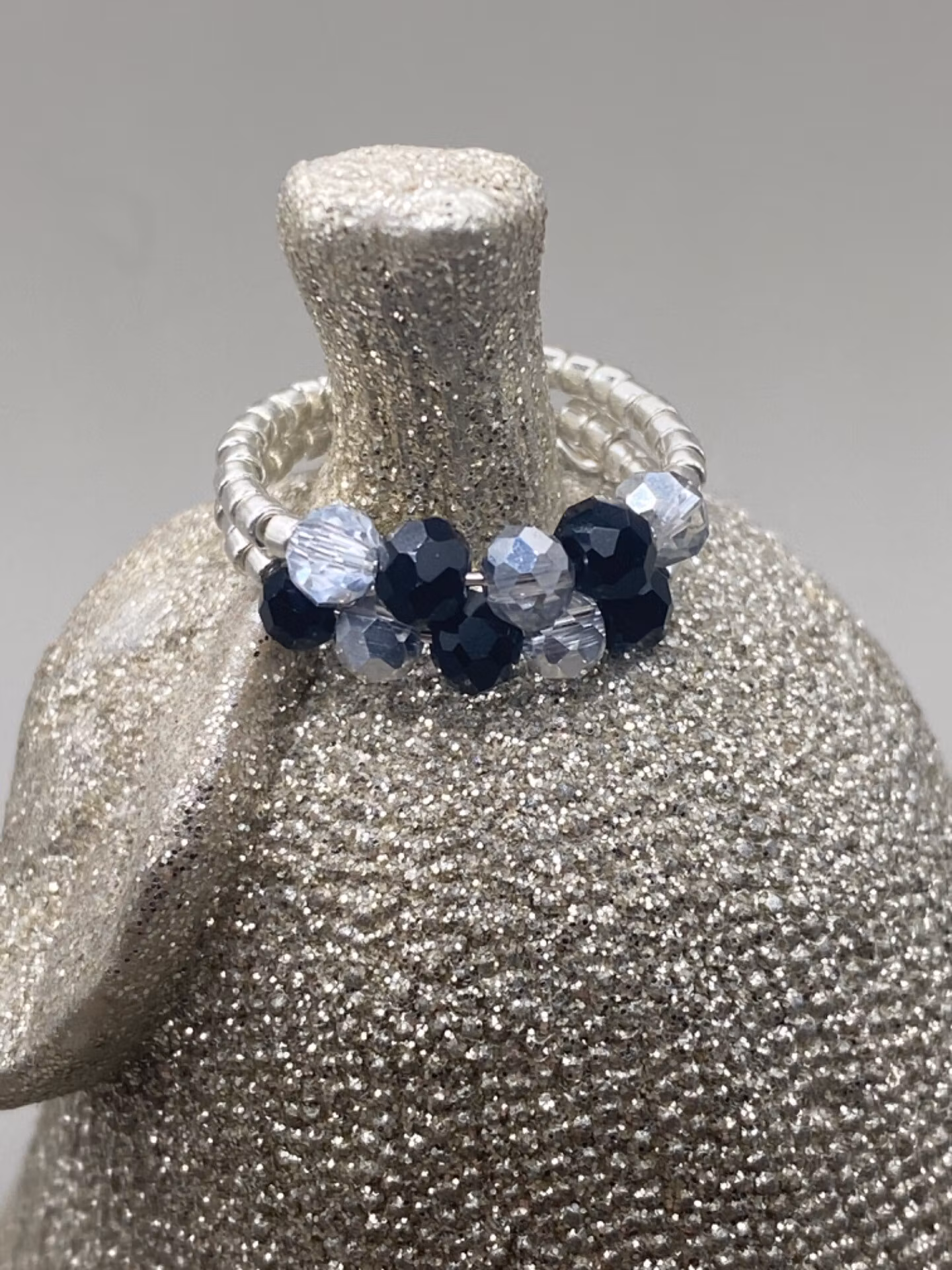 Stilig ring i tvåradigt mönster av små silverfärgade glaspärlor runt om, små svarta glaspärlor varvat med silverfärgade glaspärlor i blickfånget.