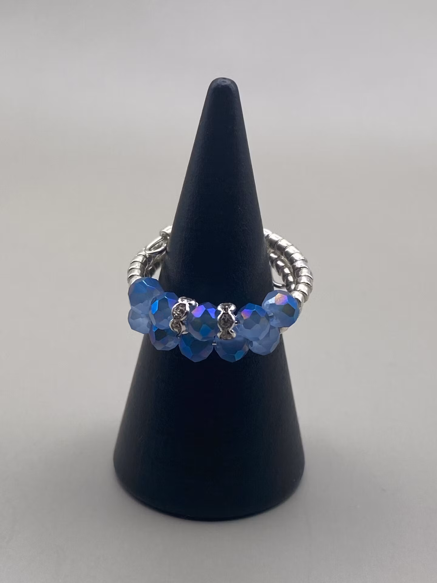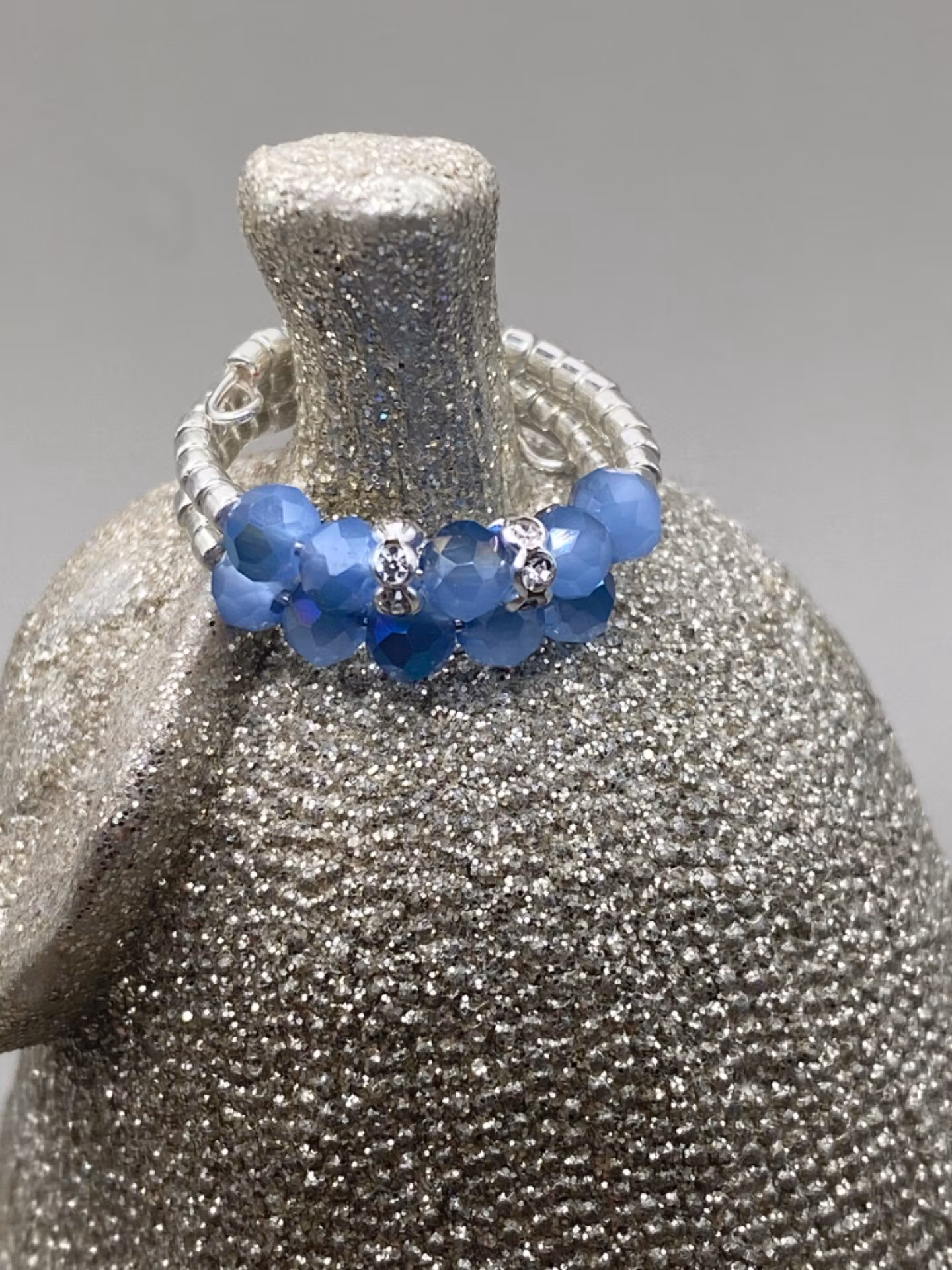Stilig ring i tvåradigt mönster av små silverfärgade glaspärlor runt om, blåmellerade glaspärlor och strassdetaljer i blickfånget.