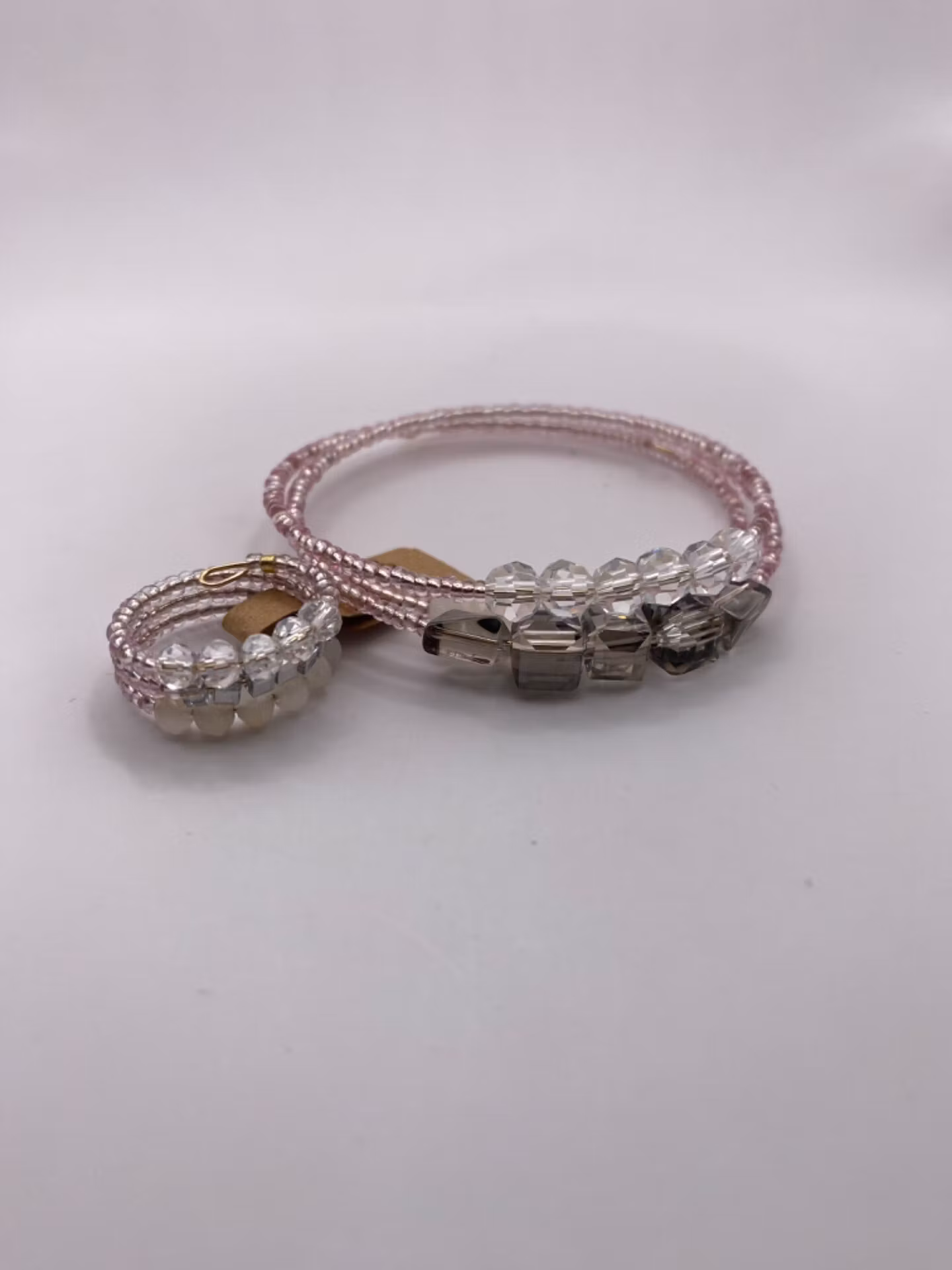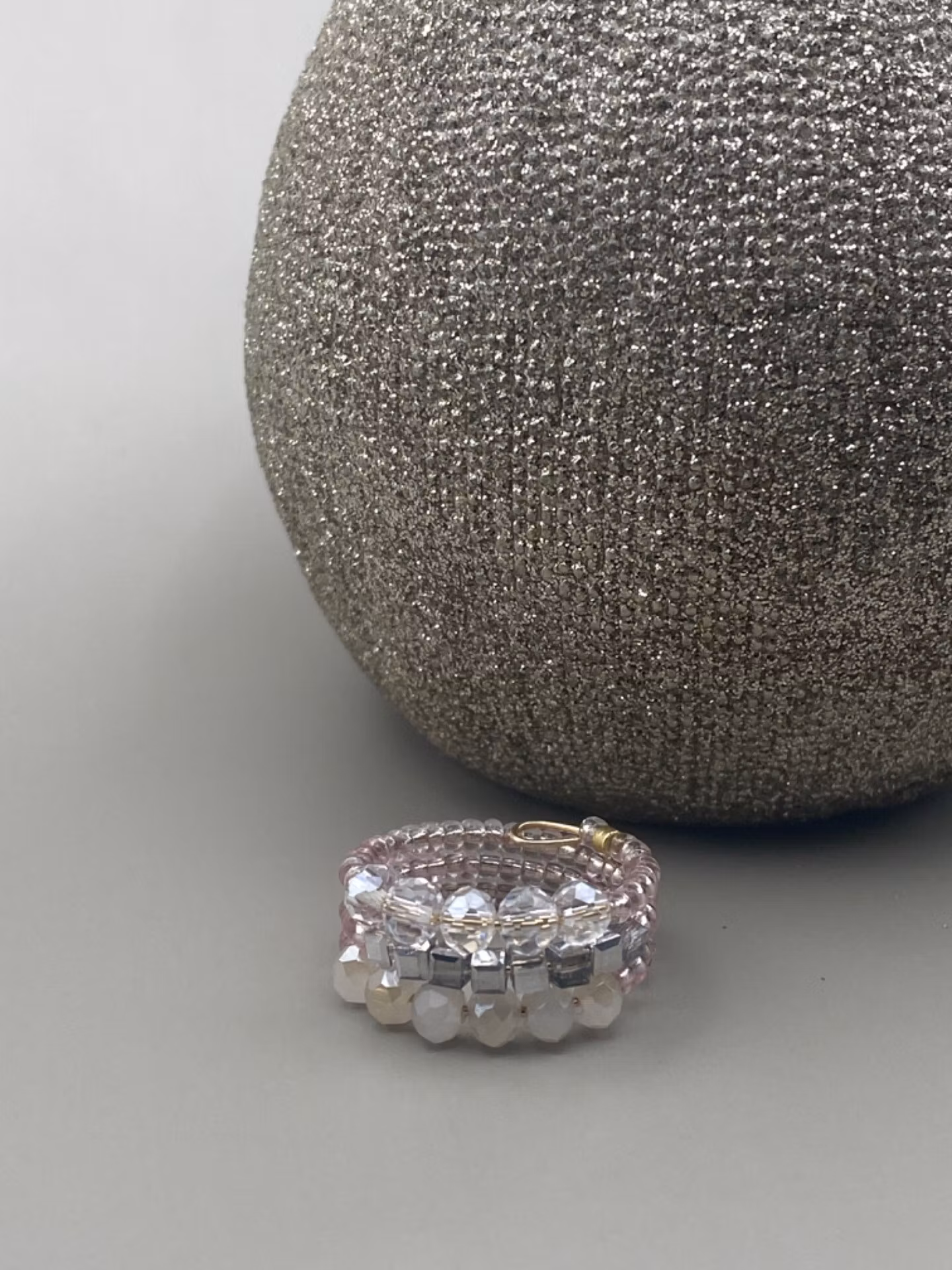 Väldigt elegant ring i treradigt mönster av små ljusrosa glaspärlor runt om, en rad med benvita frostade glaspärlor, mitten raden av silverfärgade fyrkantiga glaspärlor och tredje raden med genomskinliga glaspärlor. Otroligt vacker ring. Min favorit.