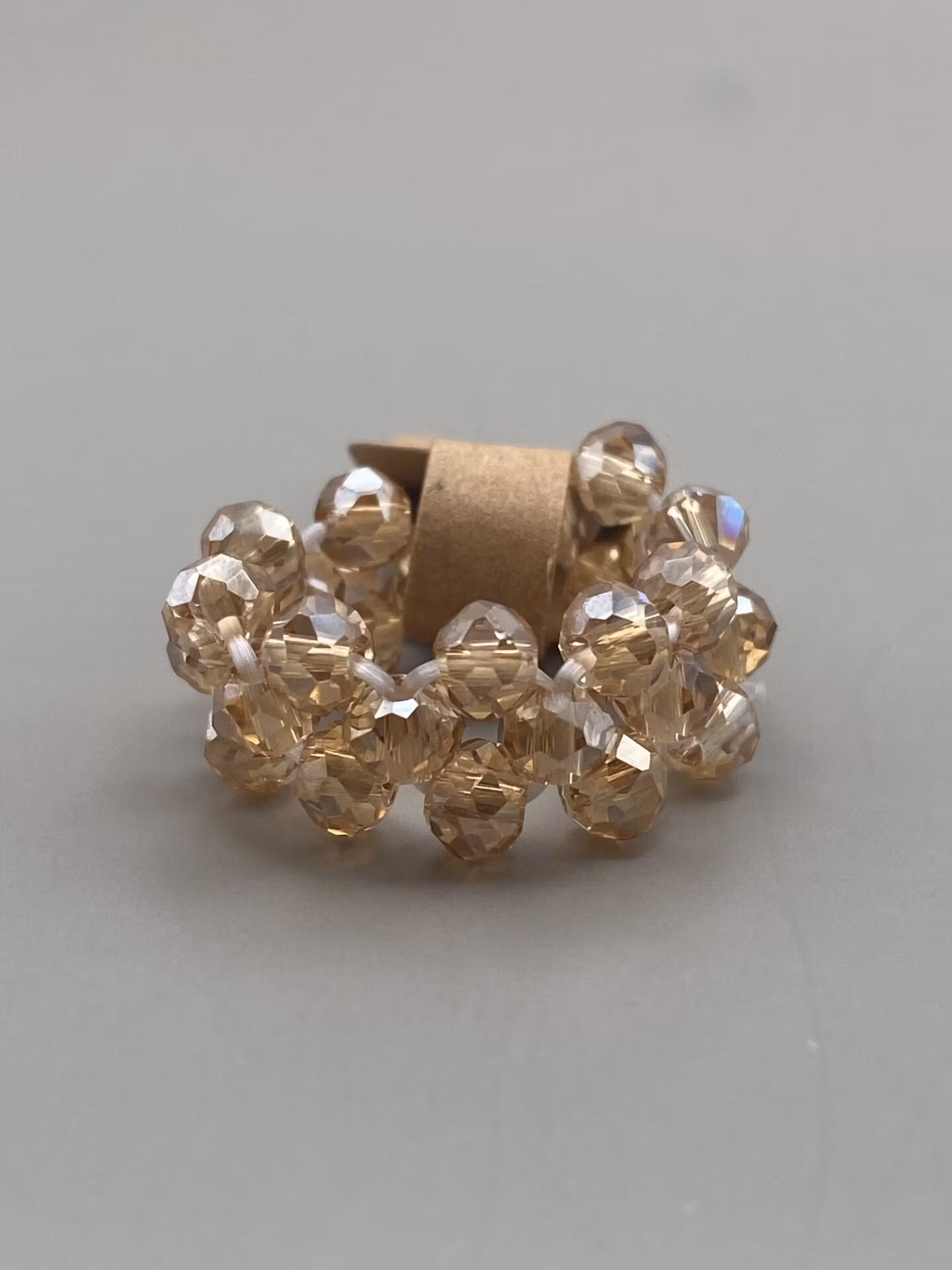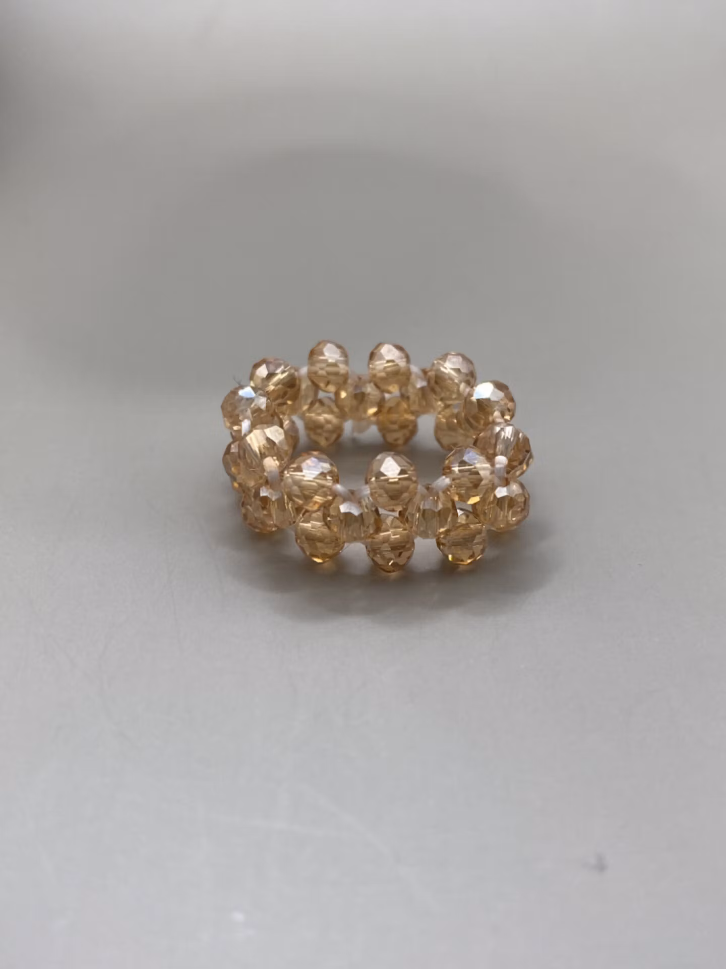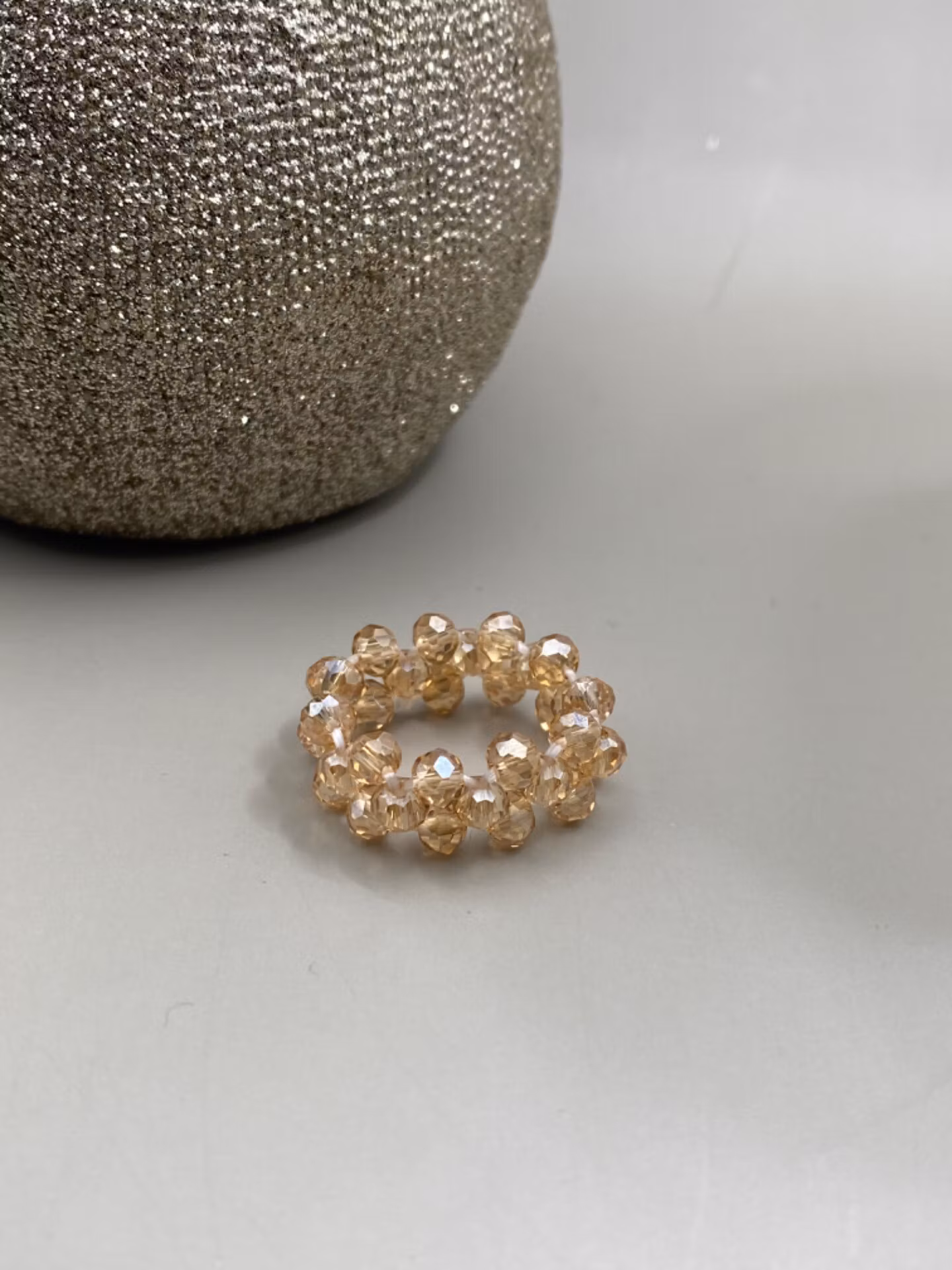 Elegant ring i vackert treradigt mönster av små champagnefärgade glaspärlor. Första ringen jag gör i den här varianten, helt i elastisk tråd och kan därmed träs på de flesta.