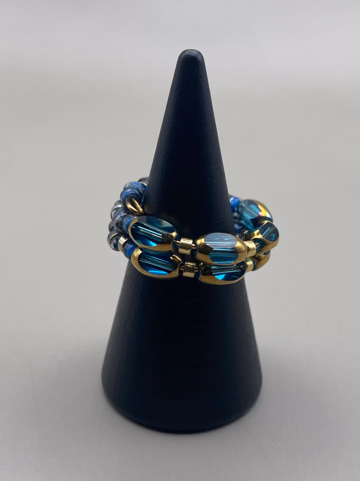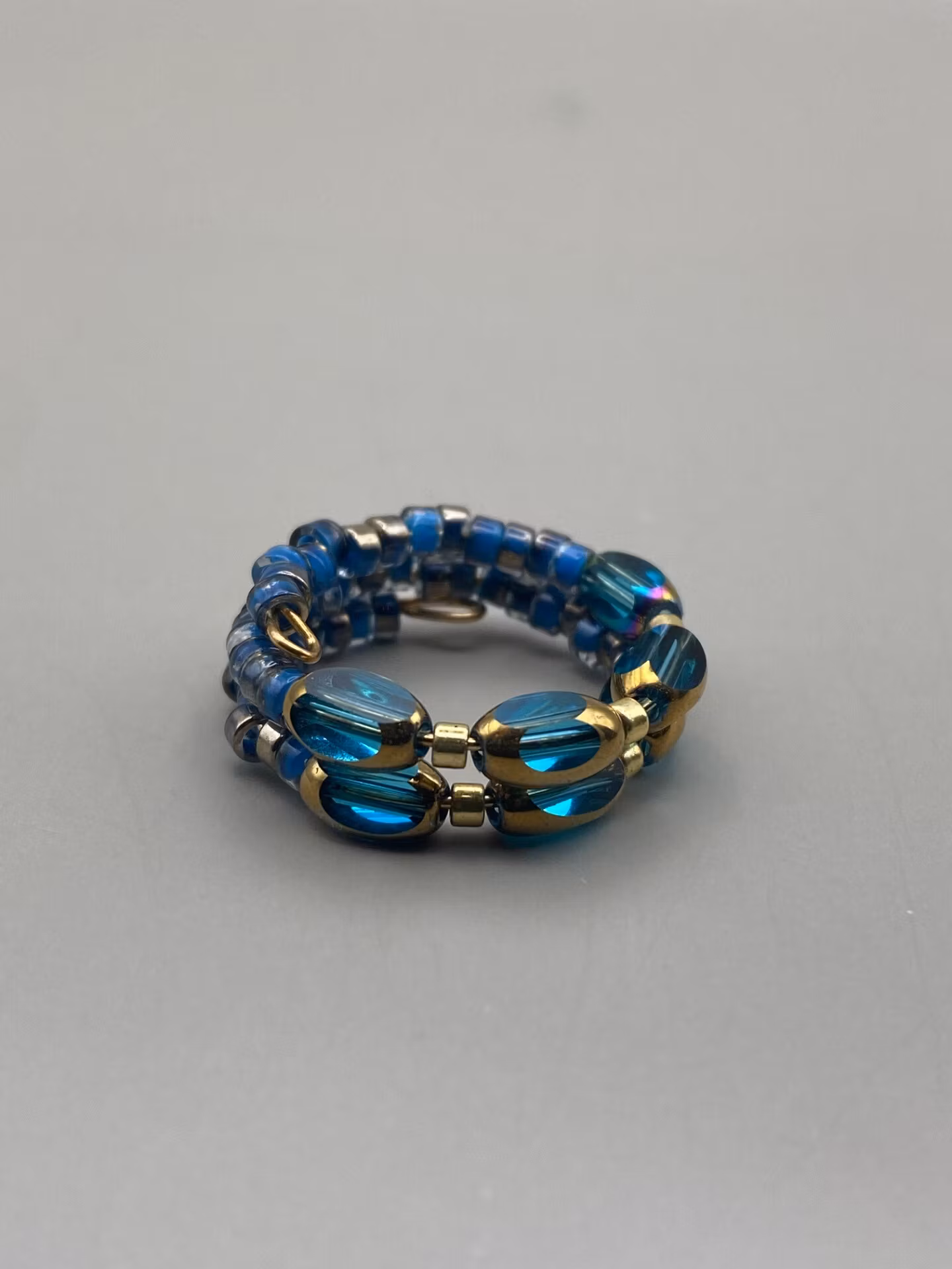 Fin ring i tvåradigt mönster av små blåmellerade glaspärlor runt om, och två fina rader i blickfånget av avlånga turkosblå/petrolfärgade pärlor.