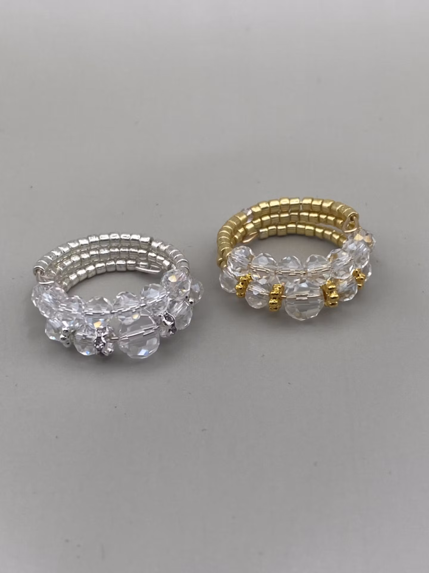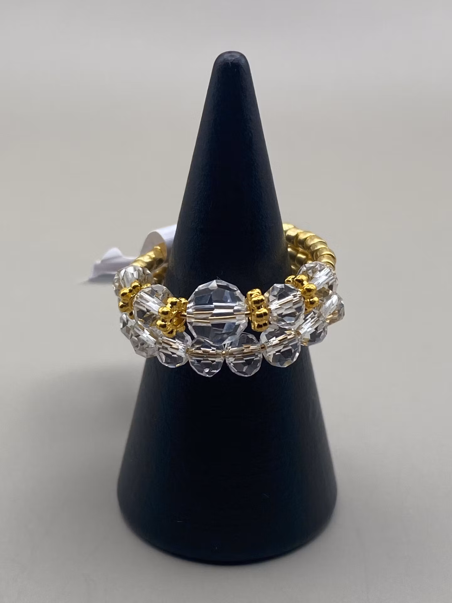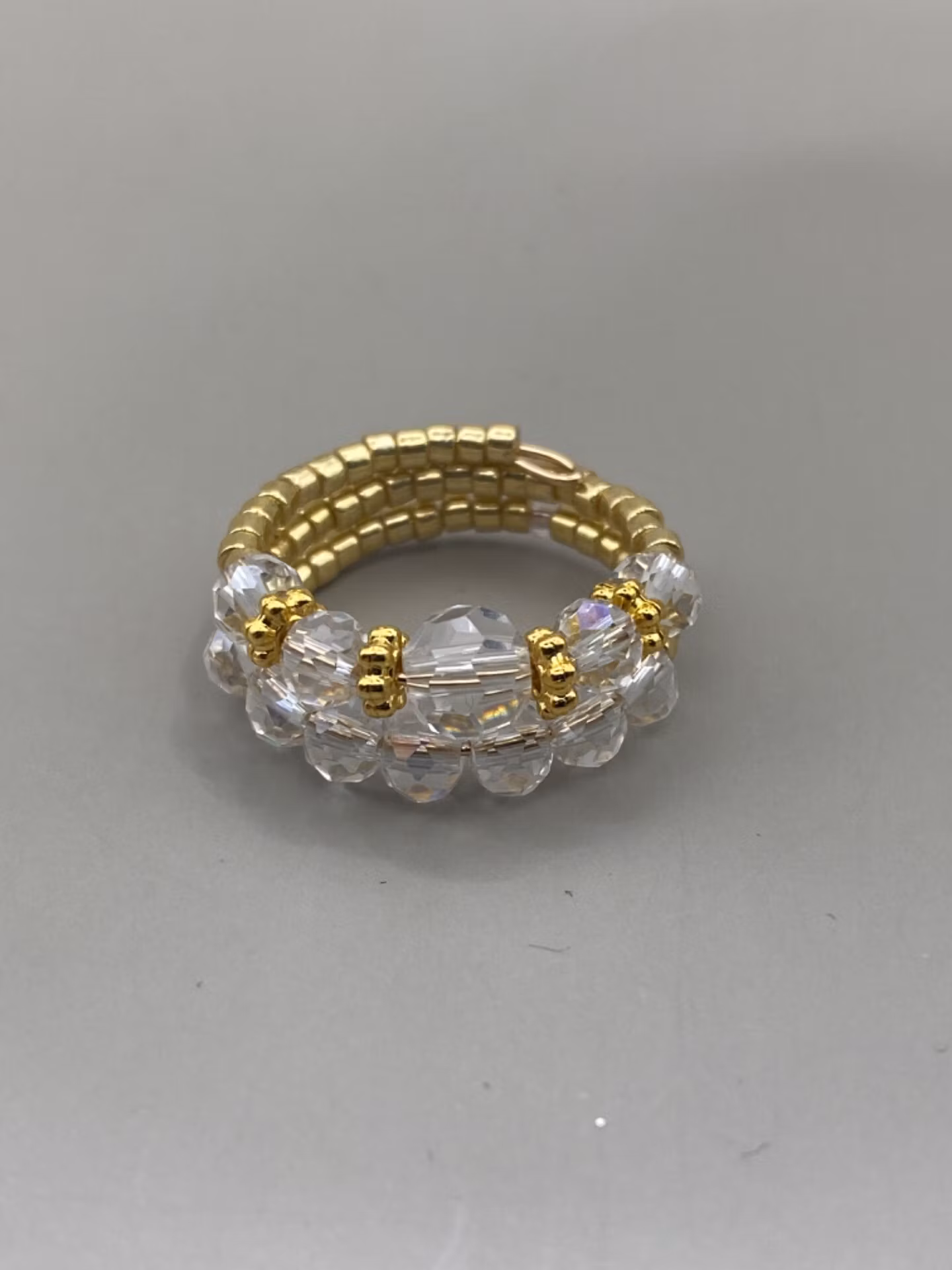 Elegant ring i tvåradigt mönster av små guldfärgade glaspärlor runt om och två rader i blickfånget av små genomskinliga små glaspärlor varav en pärla något större, varvat med guldfärgade distanser.