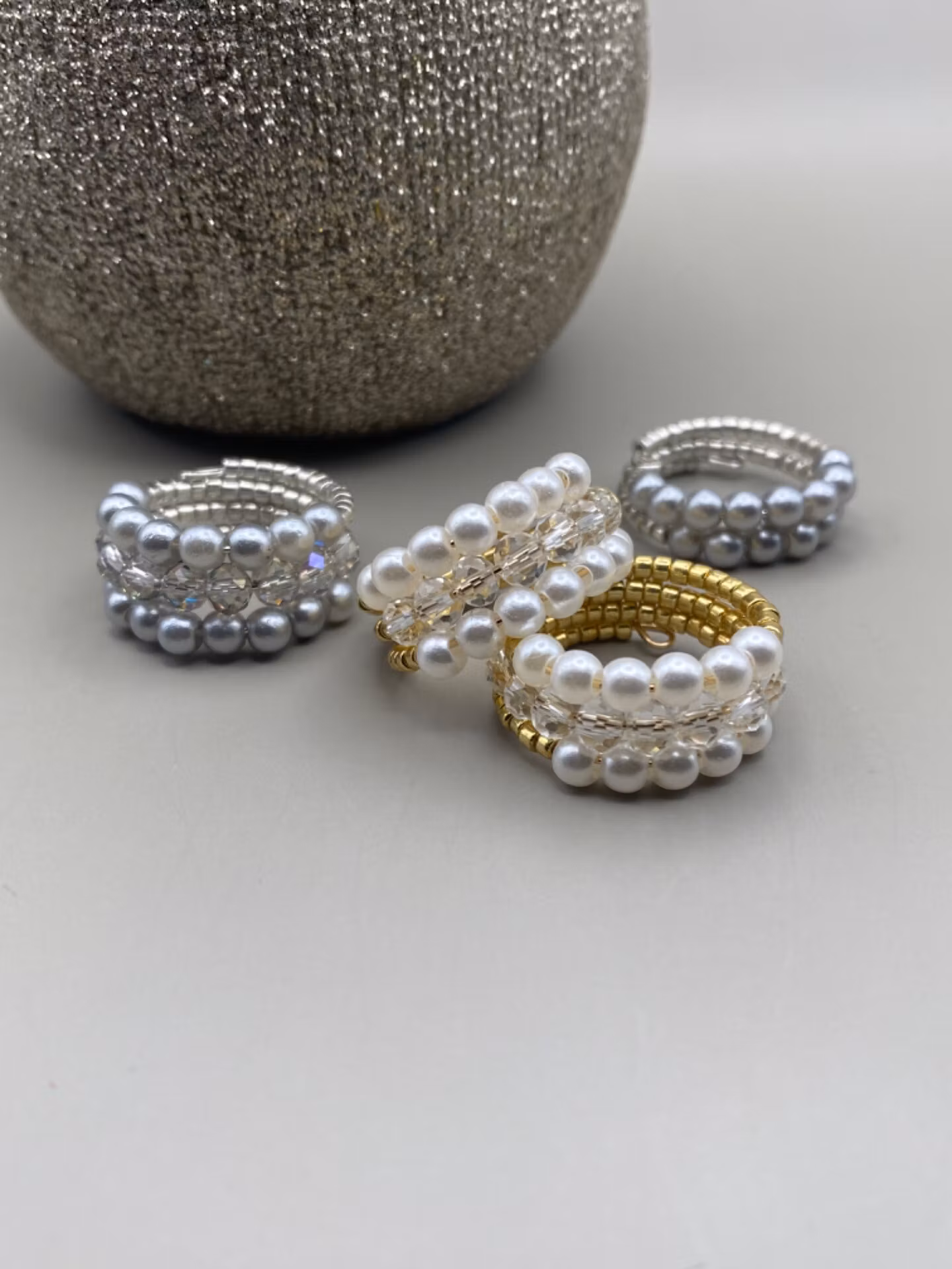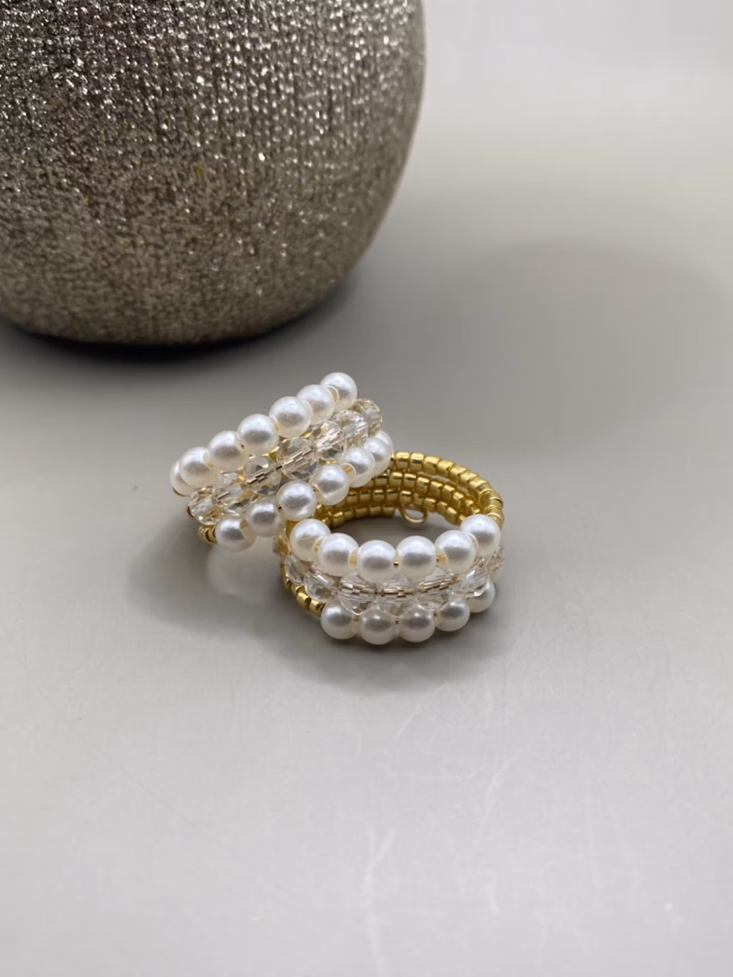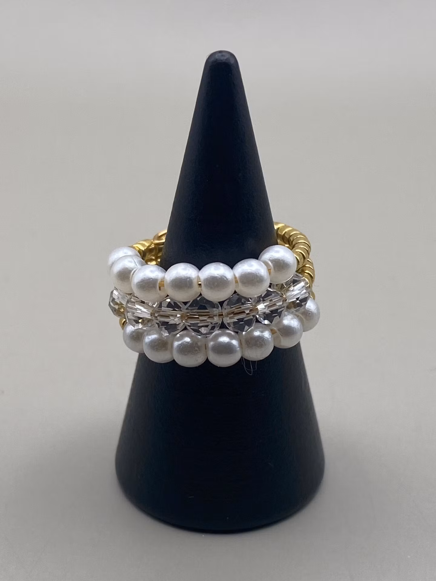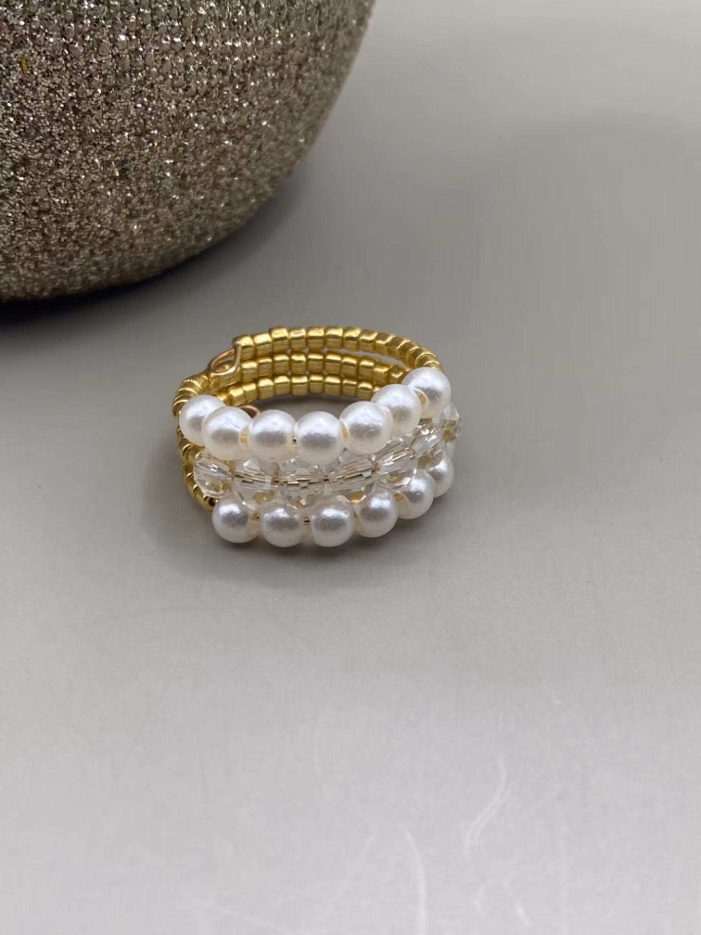 Elegant ring i treradigt mönster av små guldfärgade glaspärlor runt om och rad ett och tre i blickfånget är av små benvita pärlor medan mittenraden är små pärlor i klarglas.
