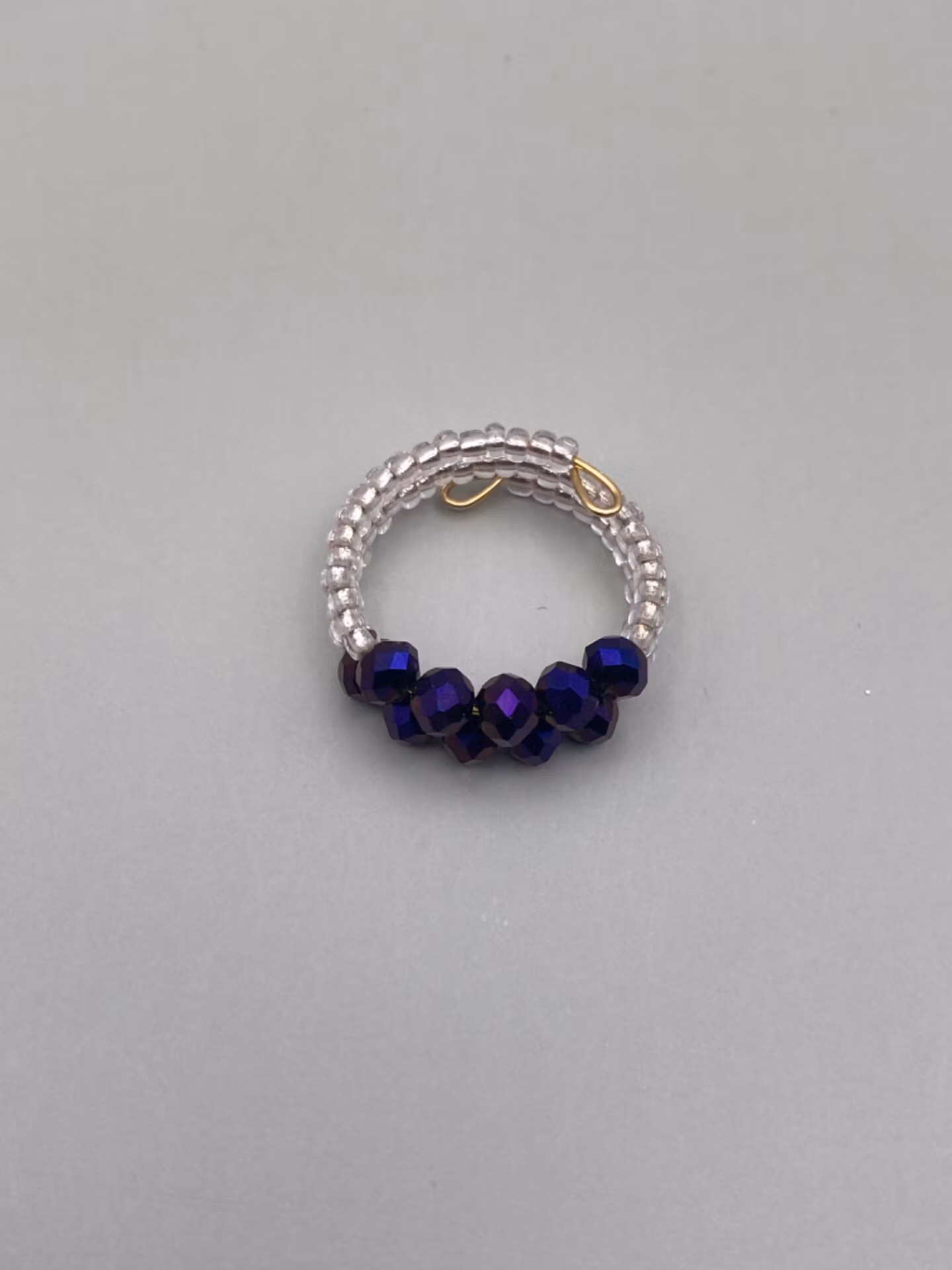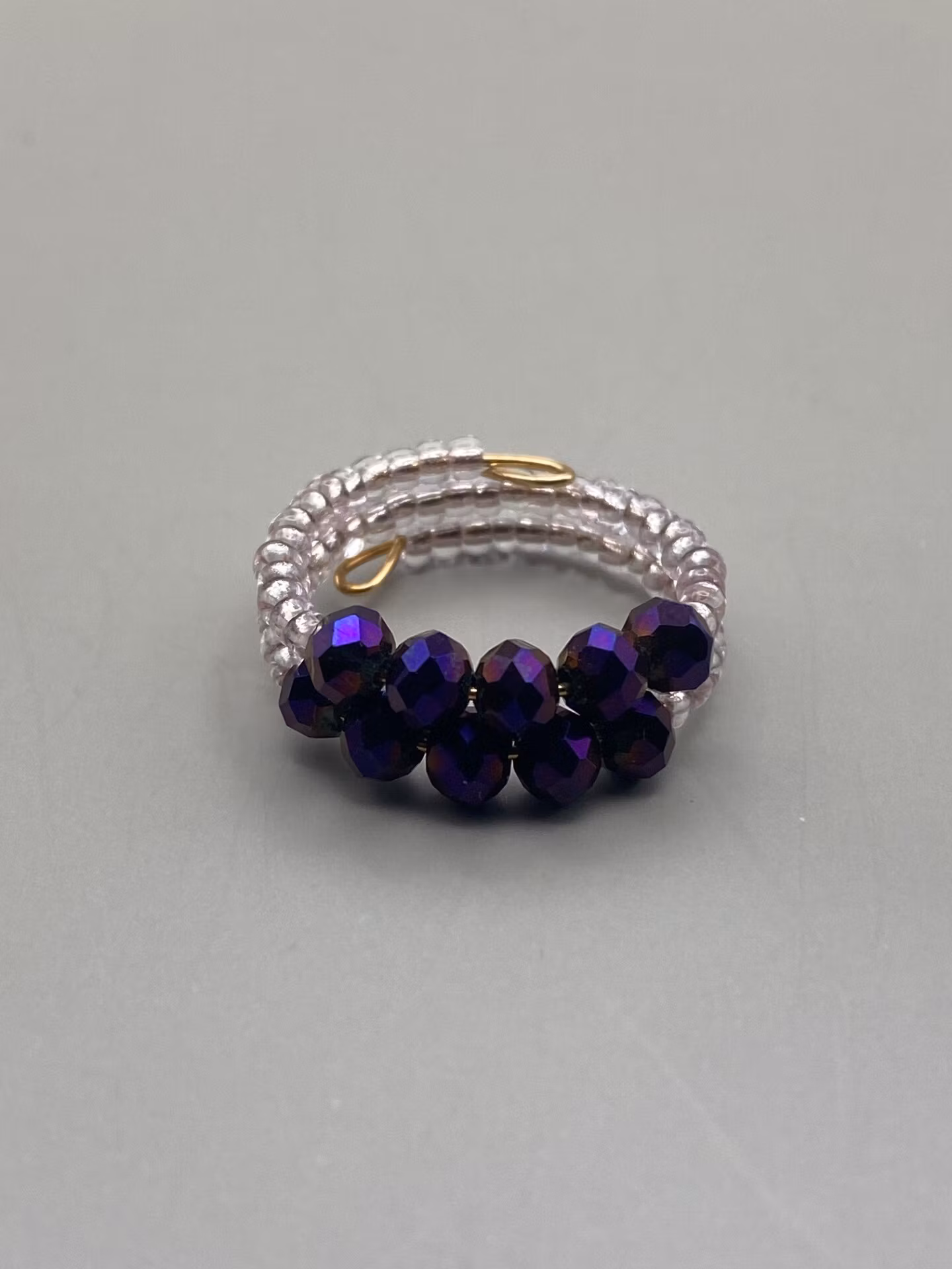 Handgjord ring i flexibel smyckestråd. Ringen har små glaspärlor runt om och vackra pärlor och detaljer i blickfånget. Ringen kan med fördel användas som stres