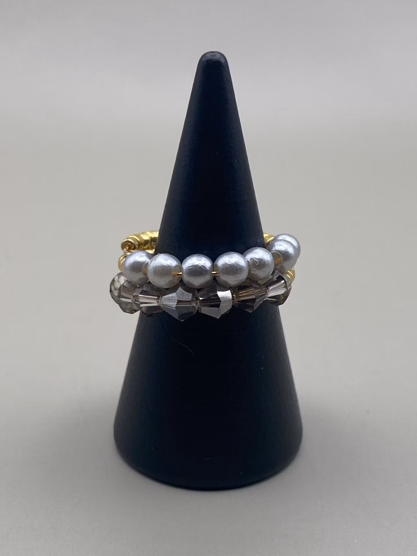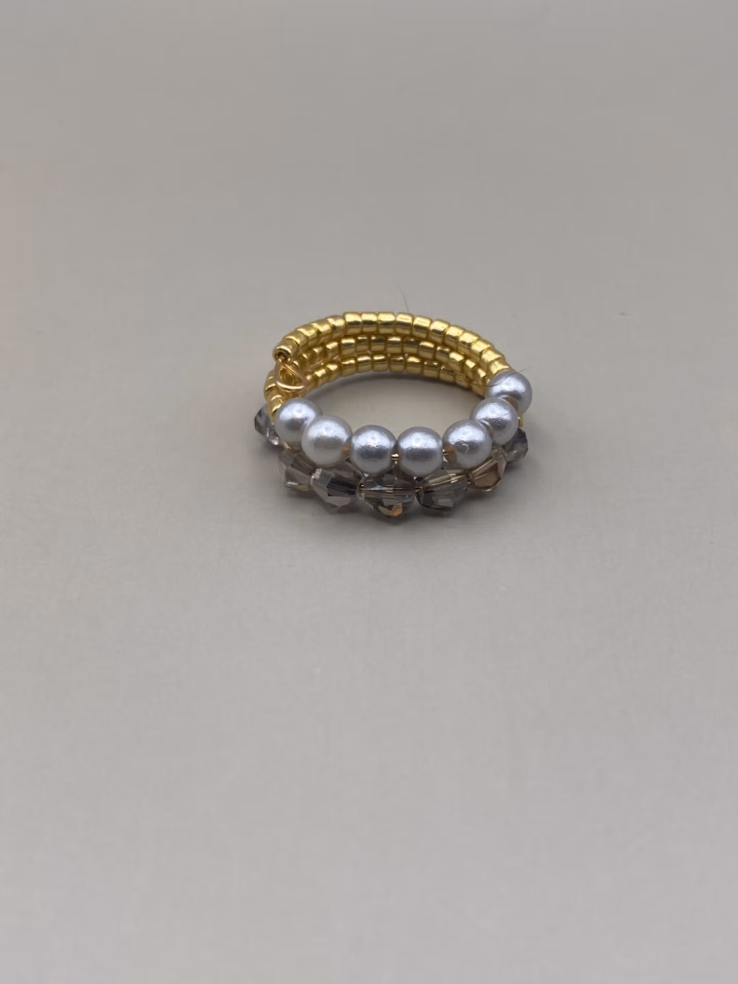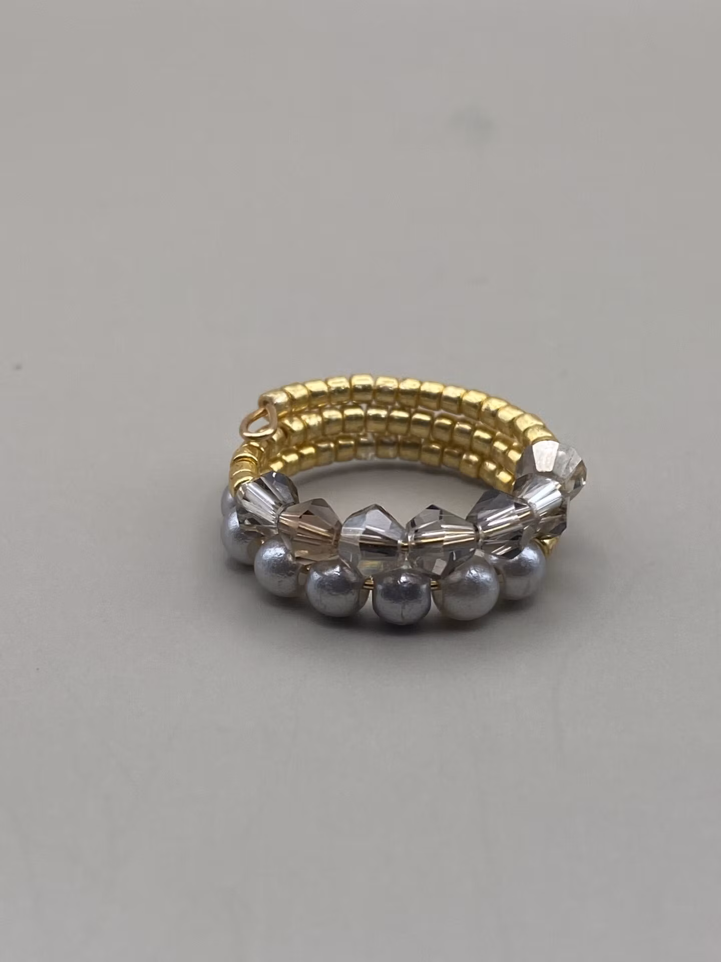 Fin ring i två radigt mönster med små guldfärgade glaspärlor runt om, en rad med ljusgrå genomskinliga glaspärlor och en rad med ljusgrå pärlor.