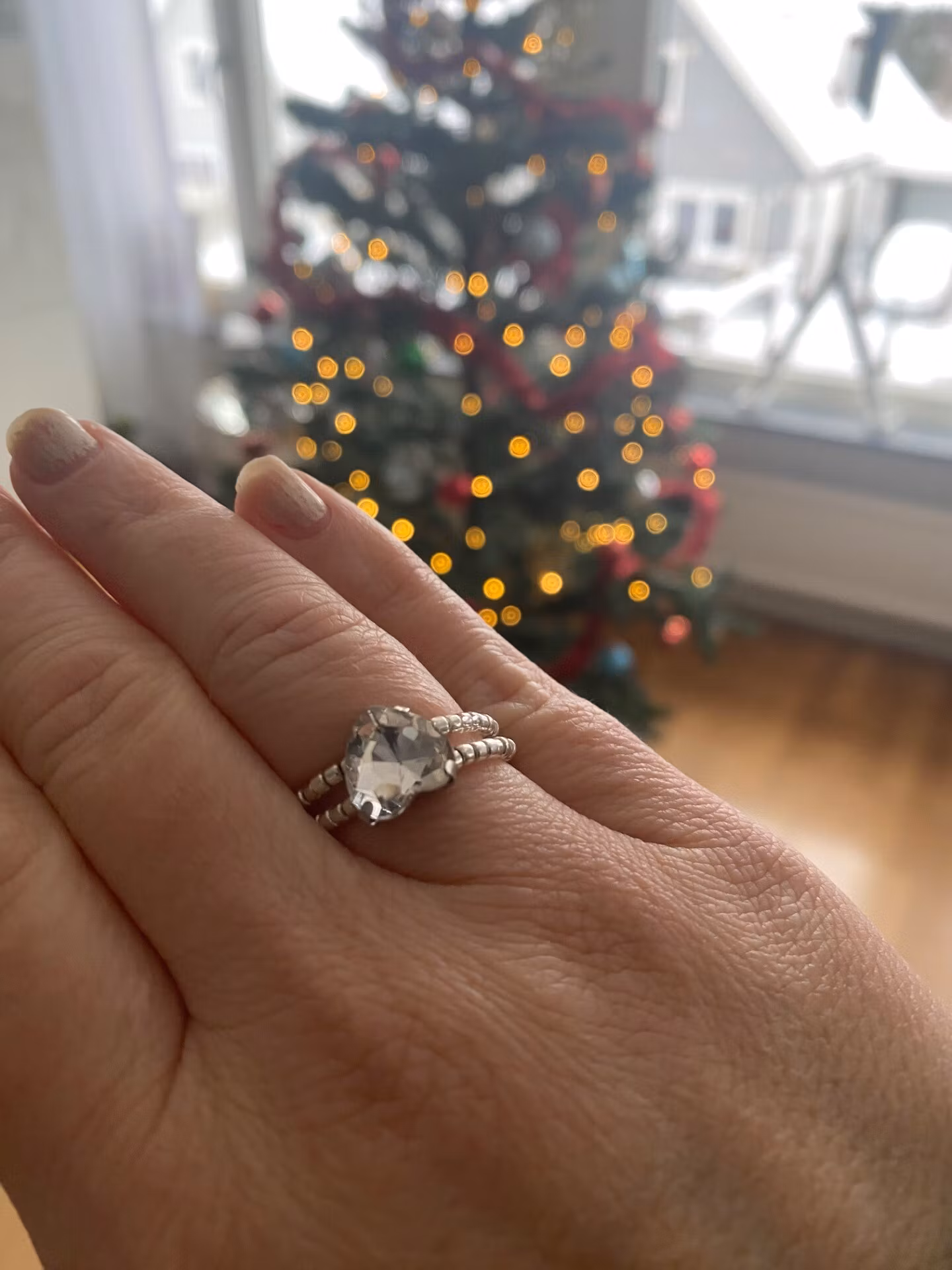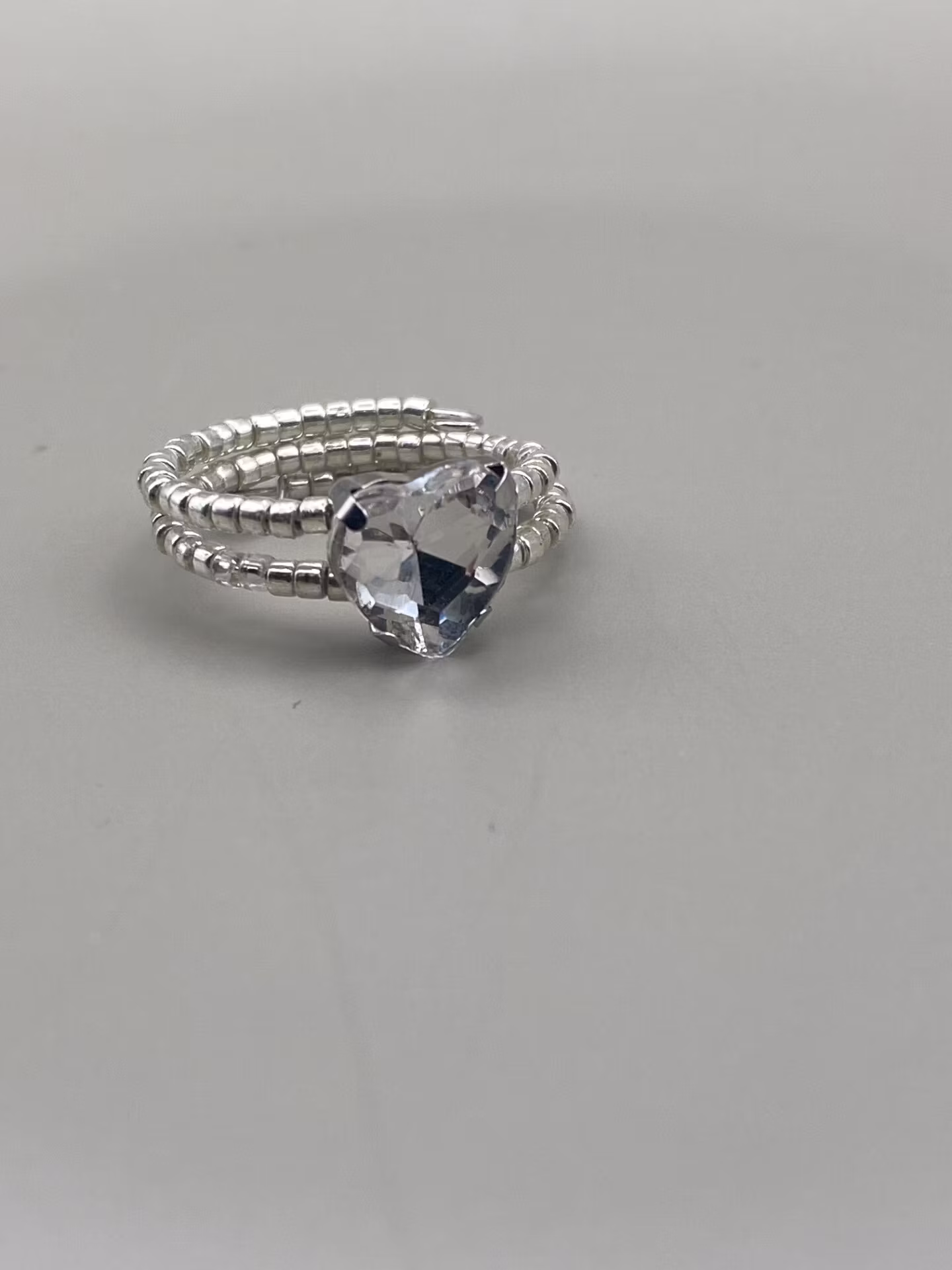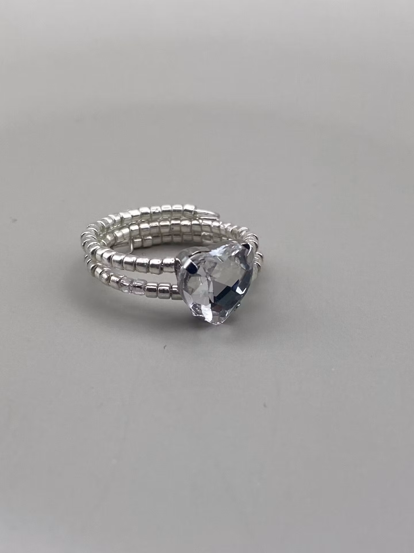 Vacker ring i treradigt mönster av små silverfärgade glaspärlor. Stor hjärtformad strasssten i blickfånget.