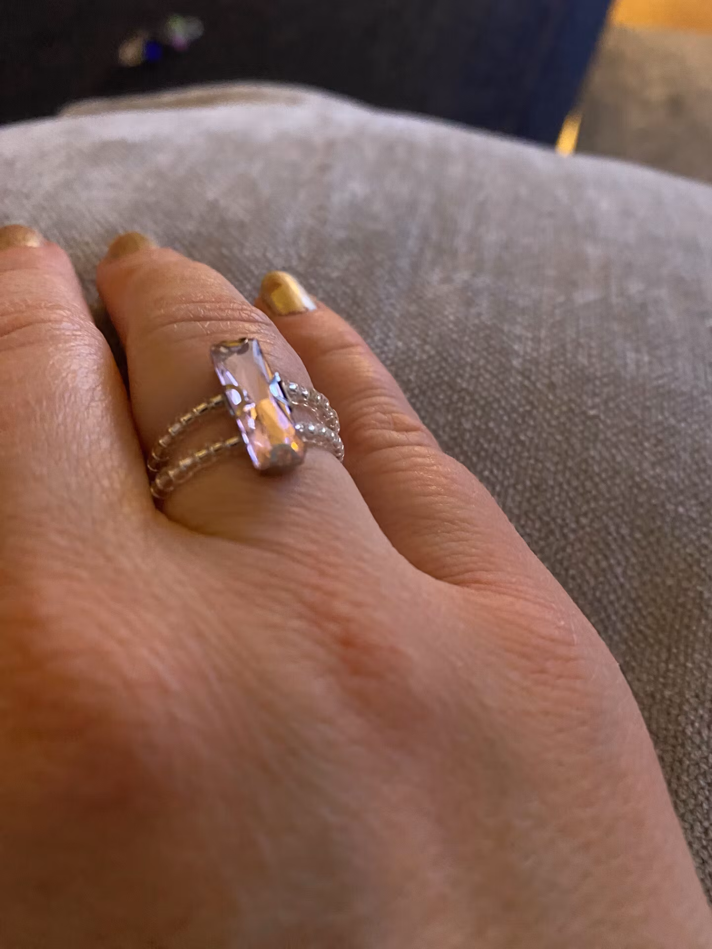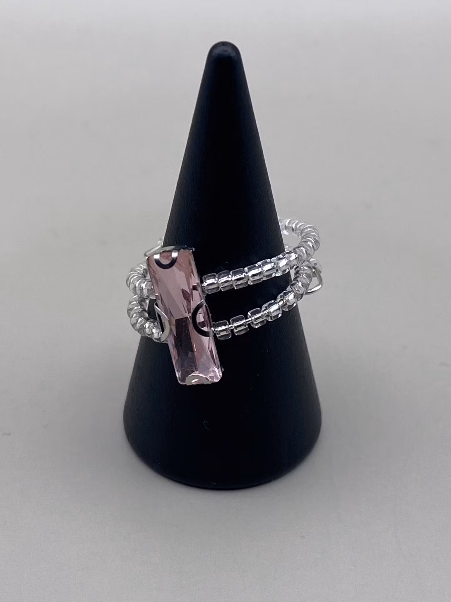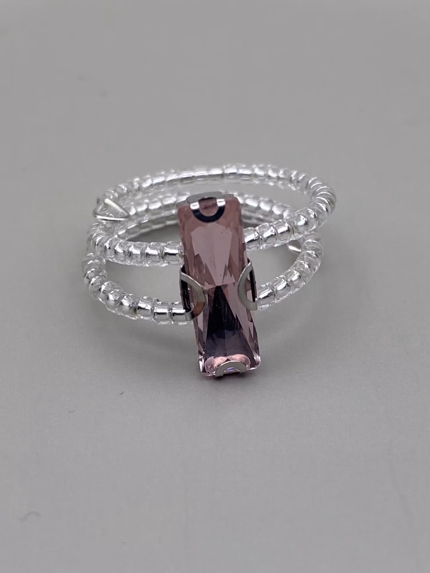 Vacker ring i treradigt mönster av små genomskinliga svagt silverfärgade glaspärlor. Stor rektangulär svagt rosa strassten i blickfånget