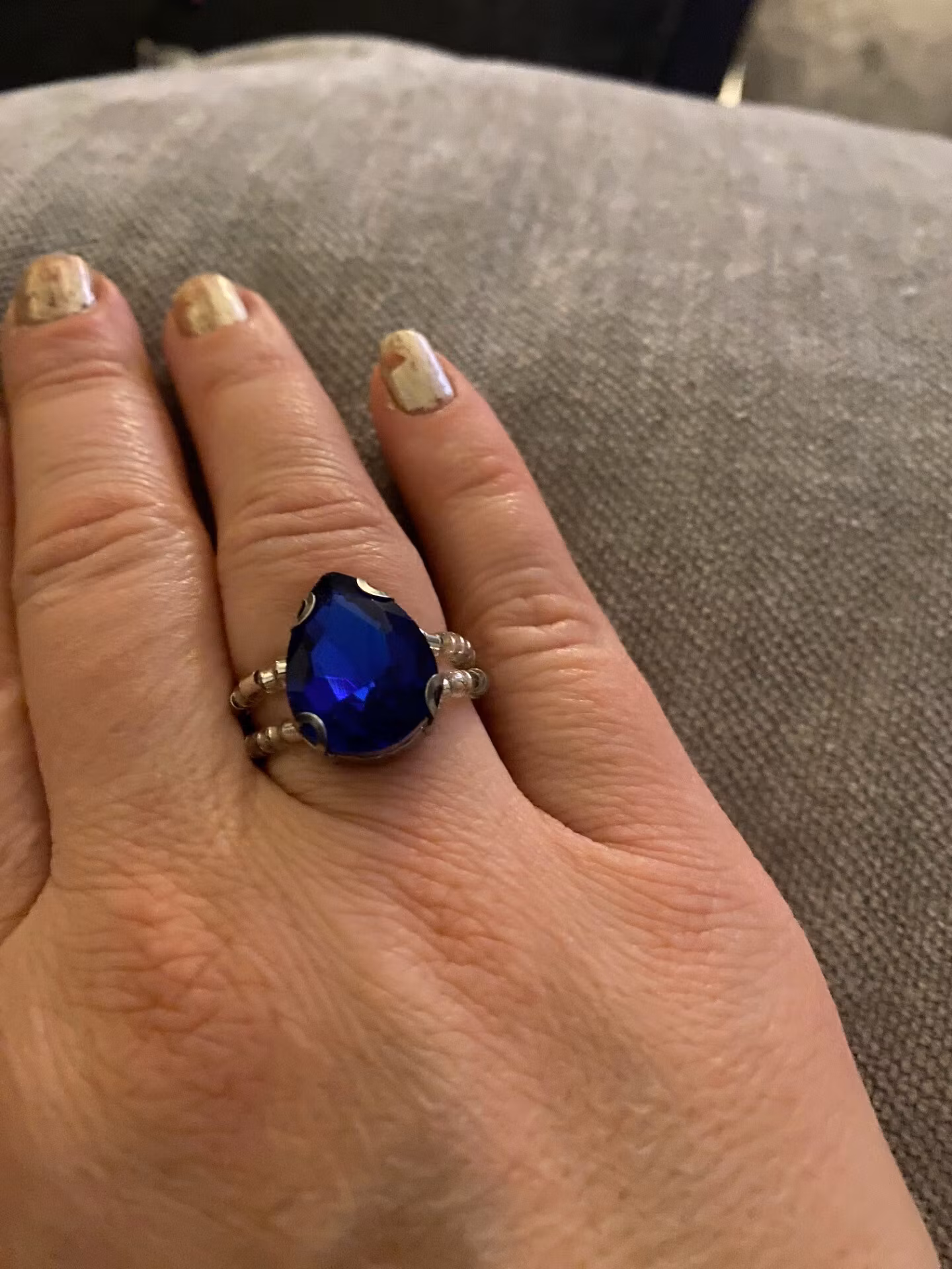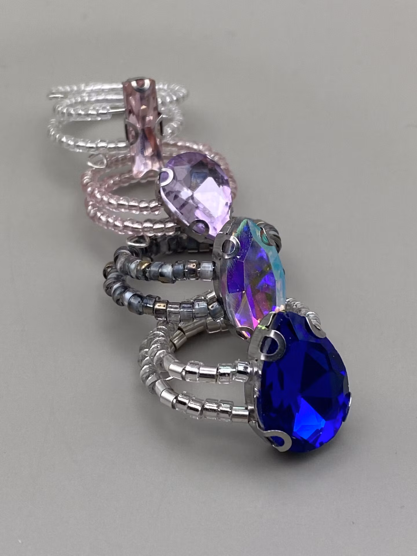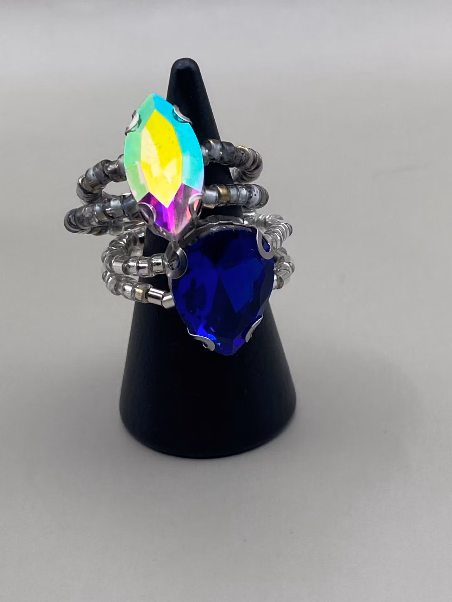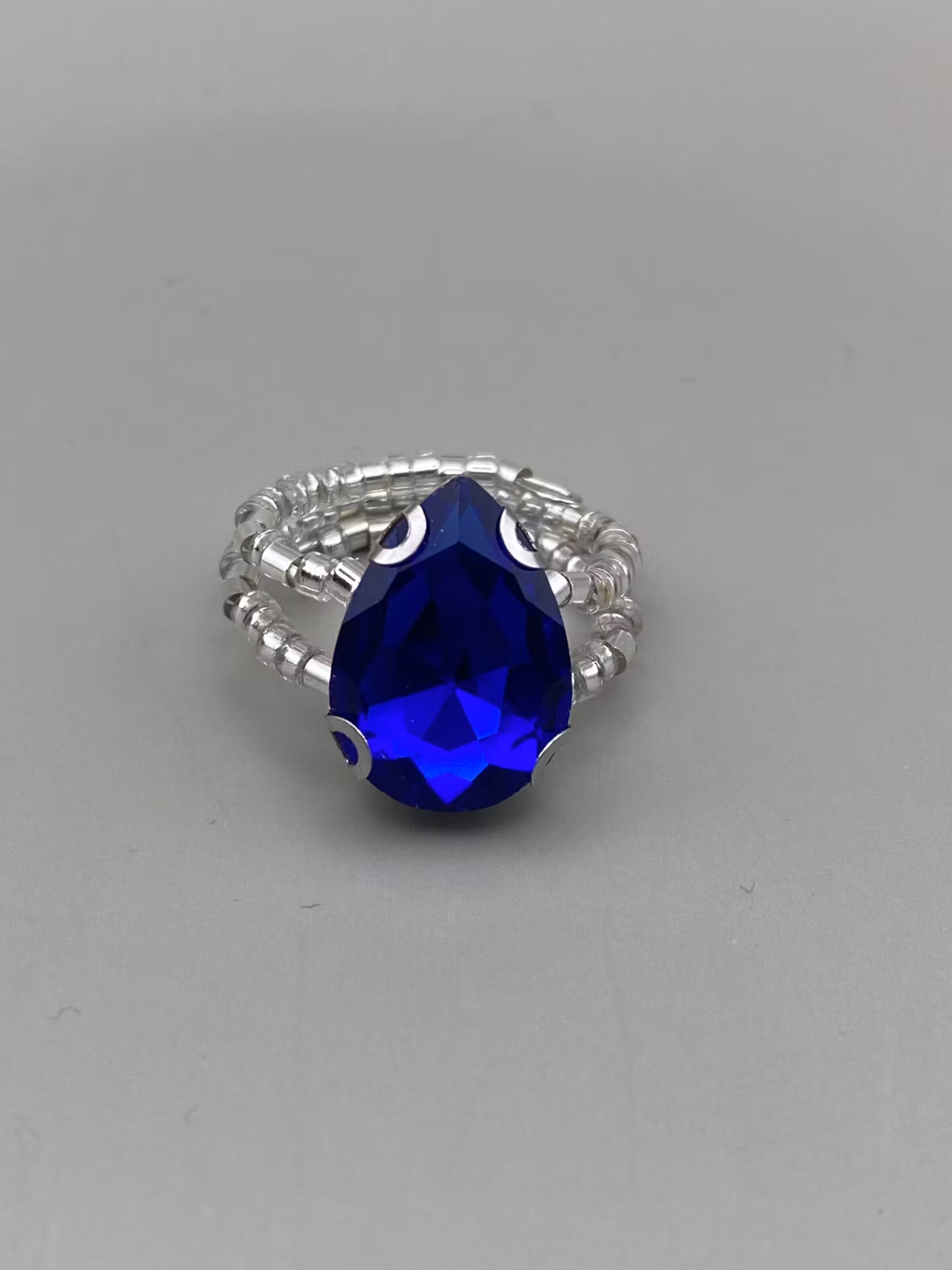 Vacker ring i tvåradigt mönster av små silverfärgade glaspärlor. Stor droppformad koboltblå strassten i blickfånget.