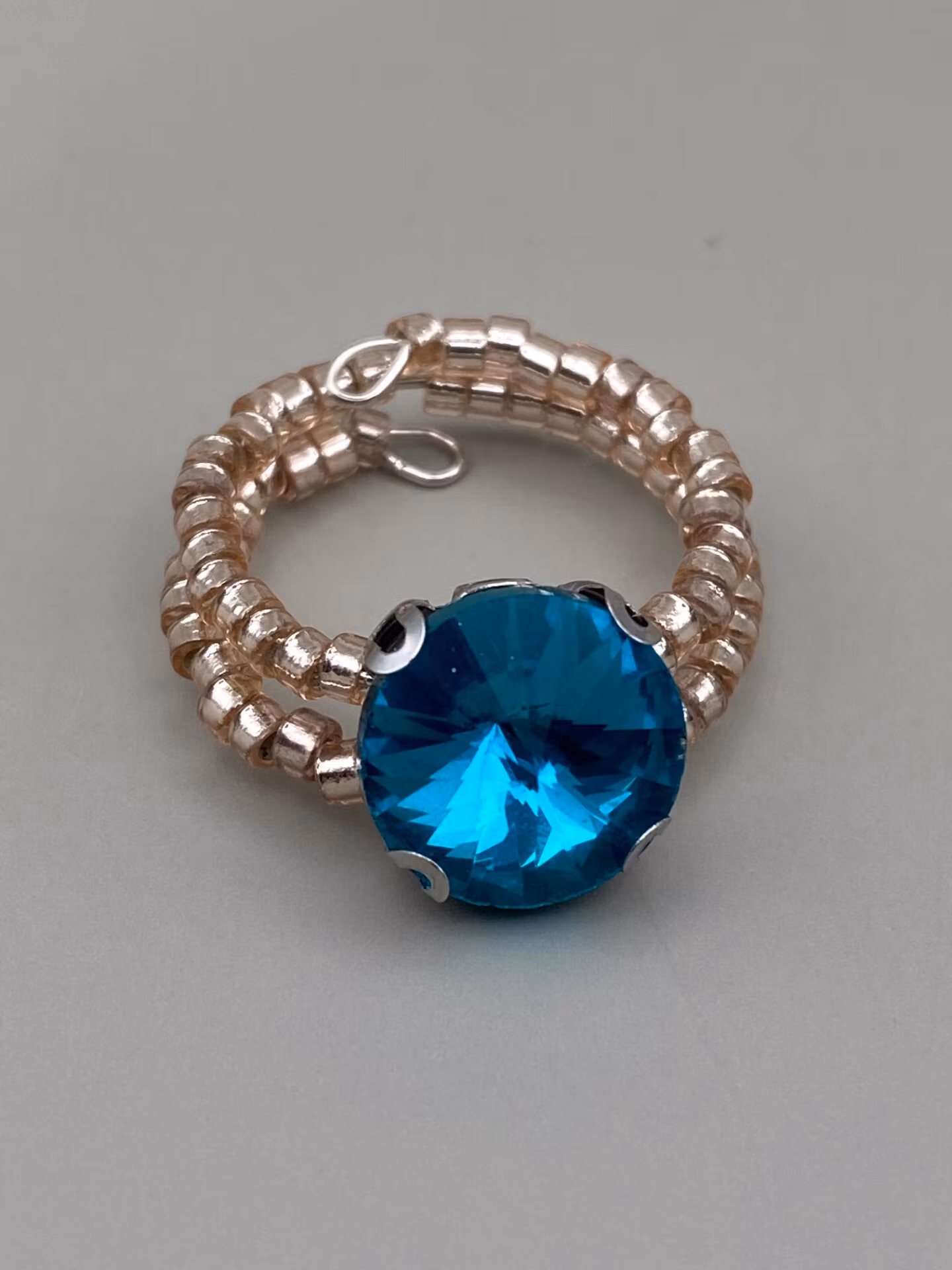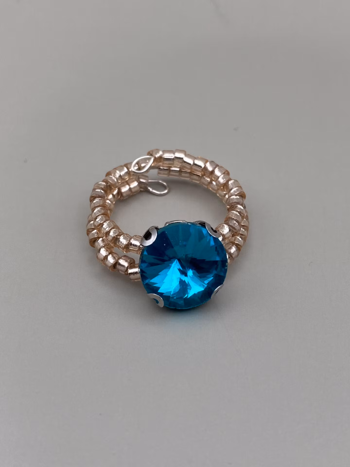 Vacker ring i tvåradigt mönster av små roséfärgade glaspärlor. Stor rund skimrande havsblå strassten i blickfånget.