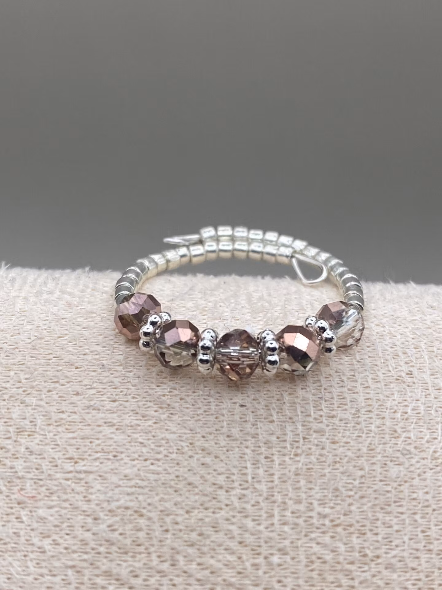 Vacker ring i enkelradigt mönster av små silverfärgade glaspärlor runt om, facetterade aprikos- och silvermelerade glaspärlor. Skimrar otroligt vackert på fingret.