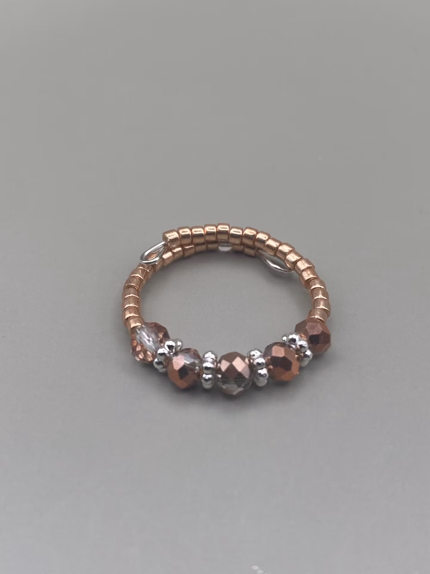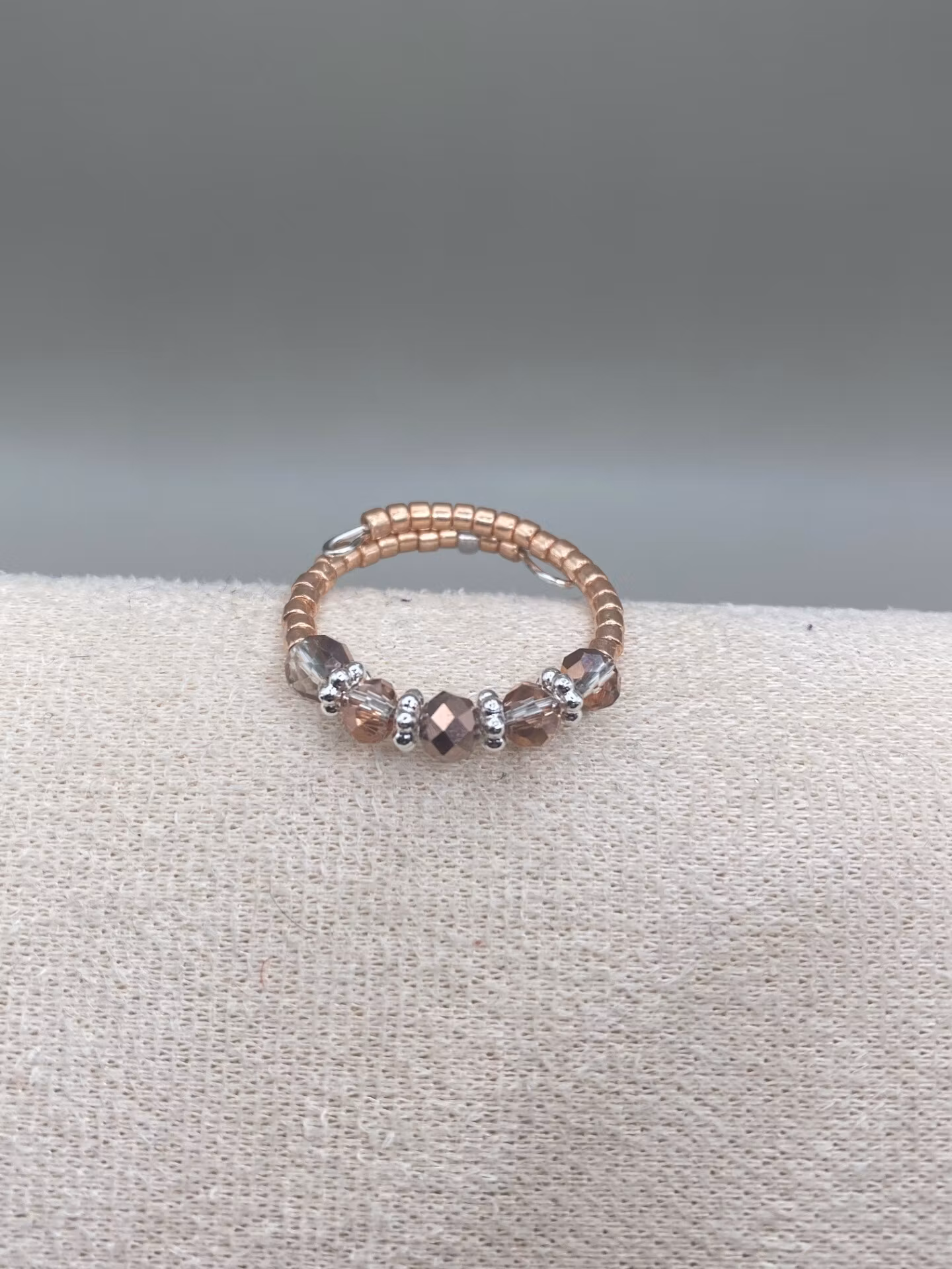 Vacker ring i enkelradigt mönster av små roséfärgade glaspärlor runt om, facetterade aprikos- och silvermellerade glaspärlor. Skimrar otroligt vackert på fingret.