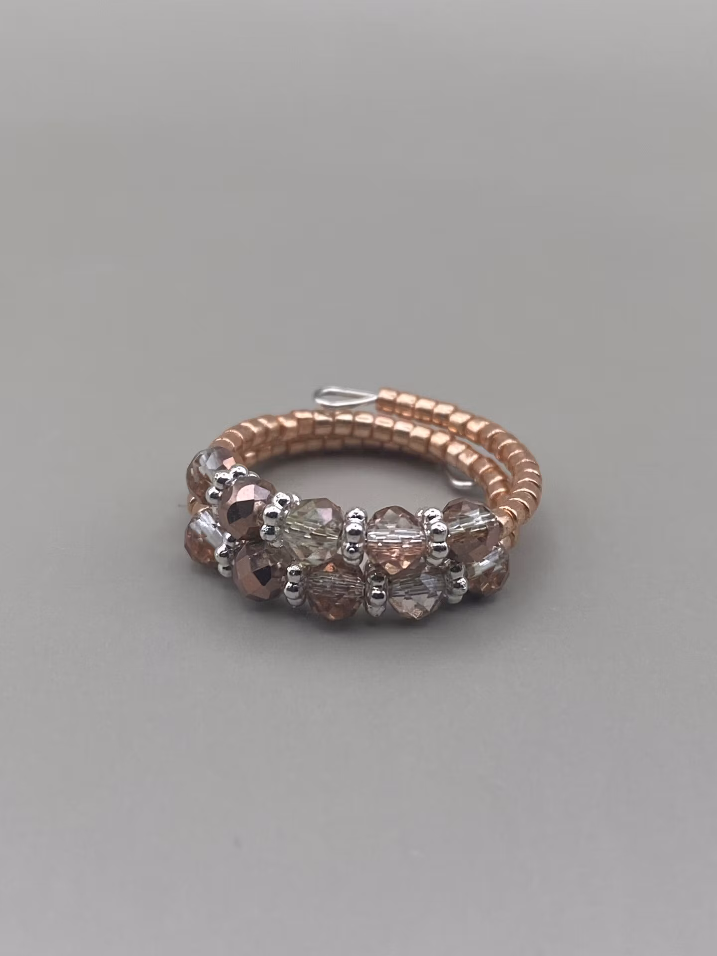 Vacker ring i tvåradigt mönster av små roséfärgade glaspärlor runt om, facetterade aprikos- och silvermellerade glaspärlor. Skimrar otroligt vackert på fingret.