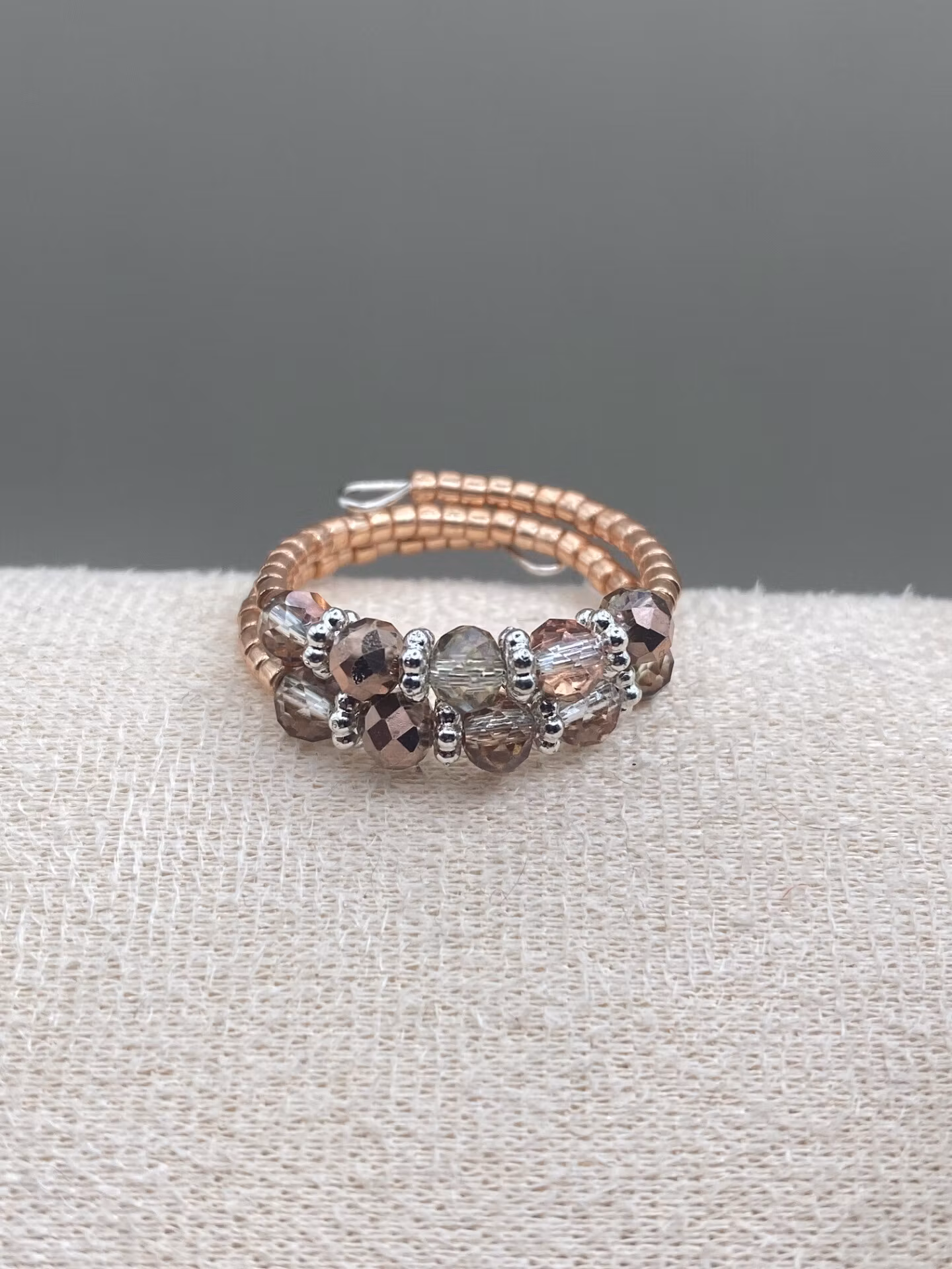 Handgjord ring i flexibel smyckestråd. Ringen har små glaspärlor runt om och vackra pärlor och detaljer i blickfånget. Ringen kan med fördel användas som stres