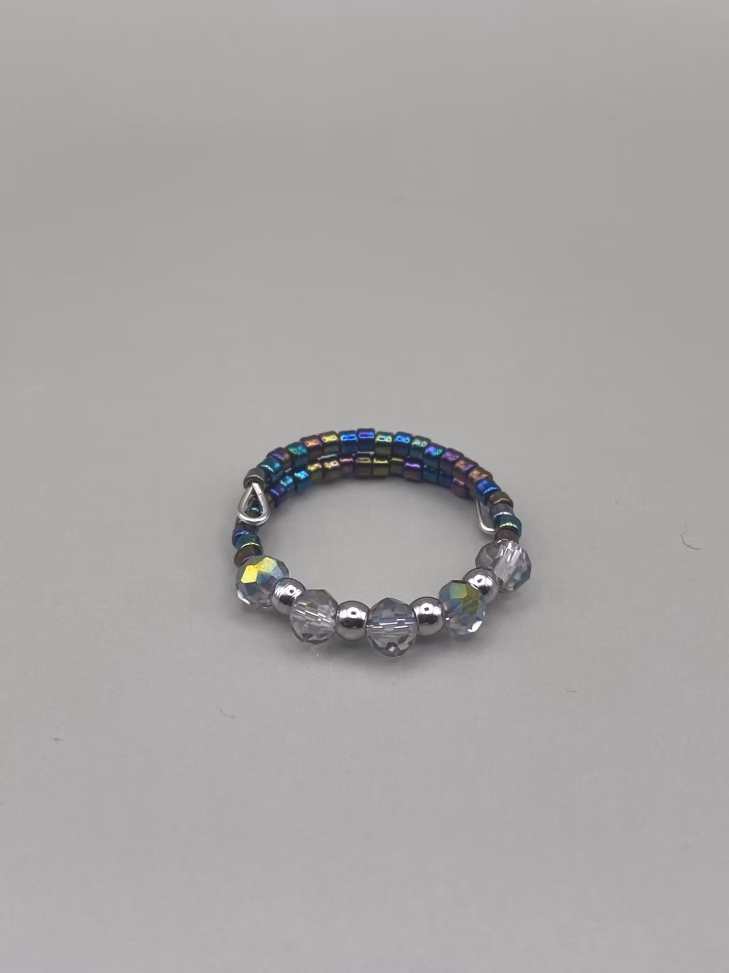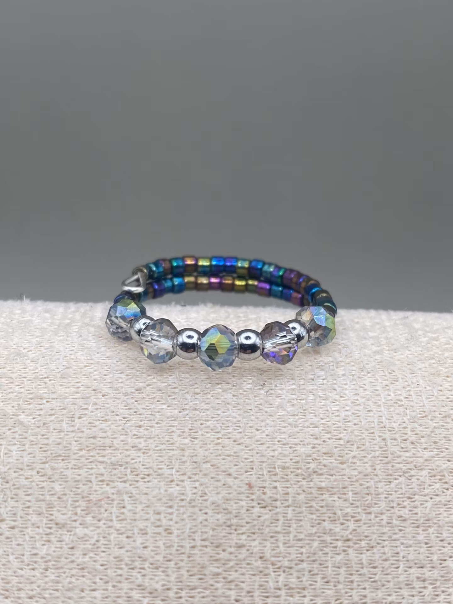 Vacker ring i enkelradigt mönster av små blandfärgade glaspärlor runt om, facetterade grågröna mellerade glaspärlor i blickfånget. Skimrar otroligt vackert på fingret.