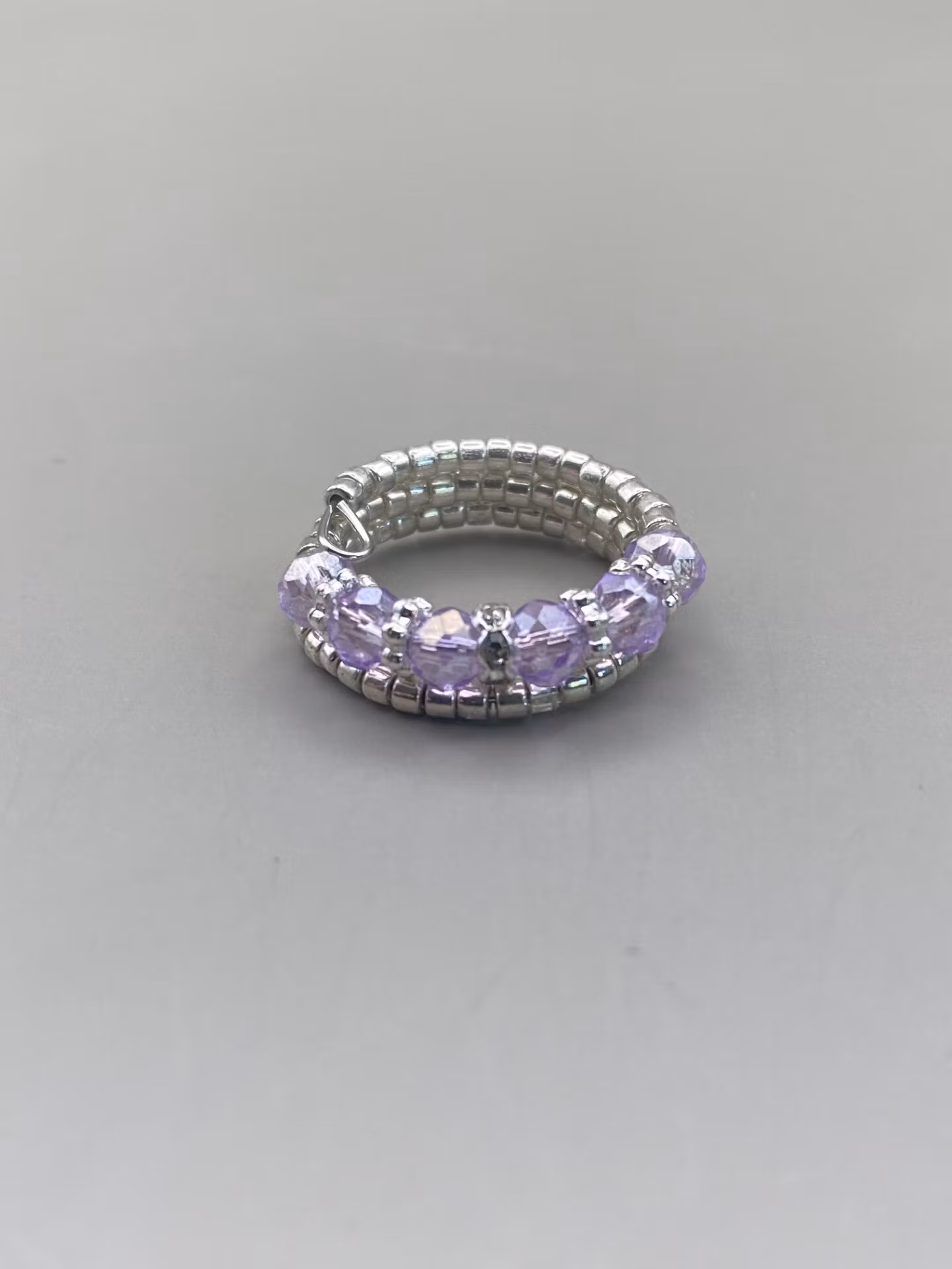 Vackert skimrande ring i tvåradigt mönster av små silverfärgade glaspärlor runt om, facetterade ljuslila glaskristallpärlor varvat med silverfärgade distanser.