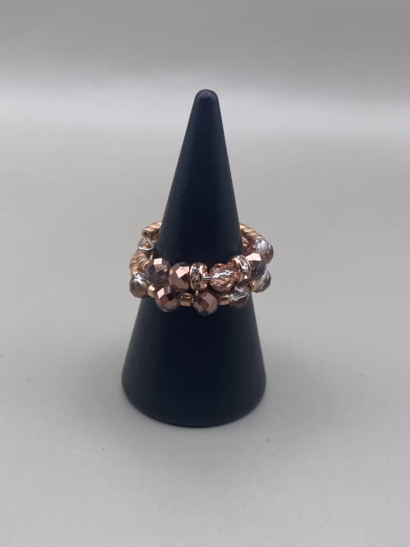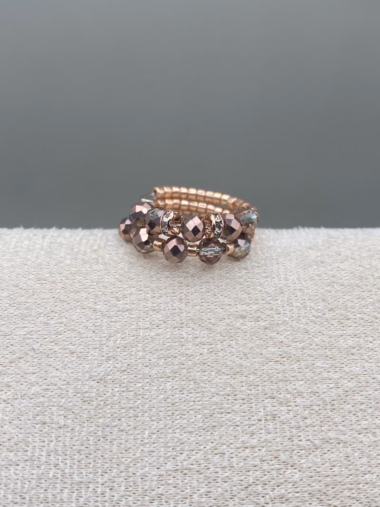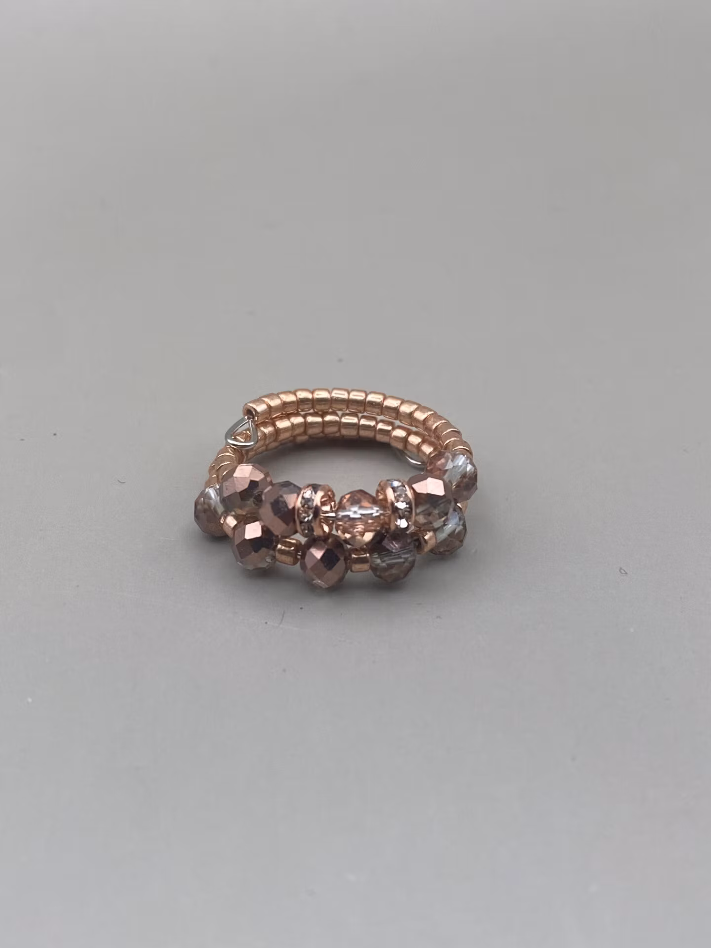 Vackert skimrande ring i tvåradigt mönster av små rośefärgade glaspärlor runt om, facetterade aprikos-rosémellerade glaskristallpärlor varvat med rósefärgad strass.
