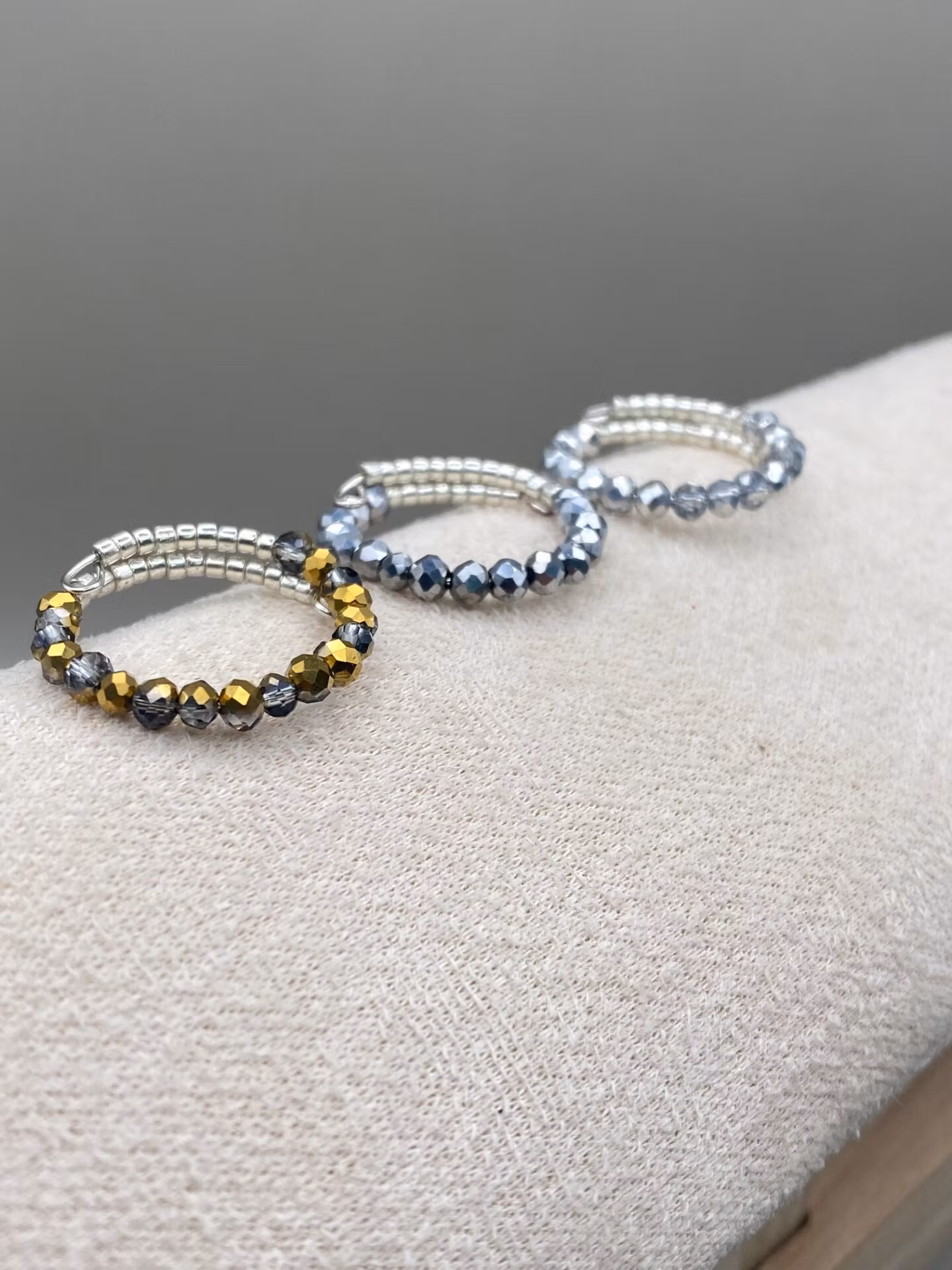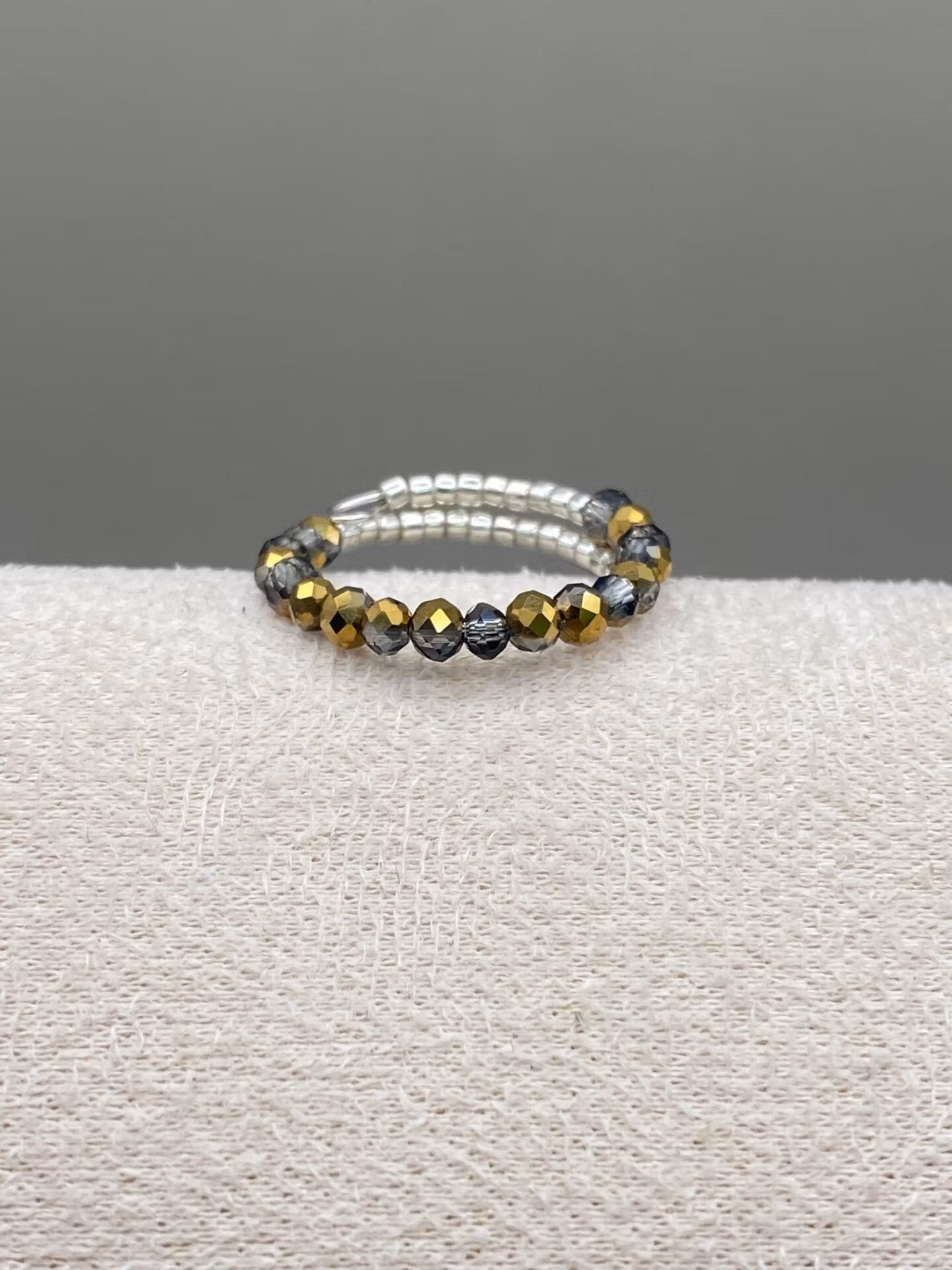 Vacker ring i enkelradigt mönster av små silverfärgadeglaspärlor runt om, facetterade grå- och guldmellerade spegelblanka glaskristallpärlor i blickfånget. Skimrar otroligt vackert på fingret.