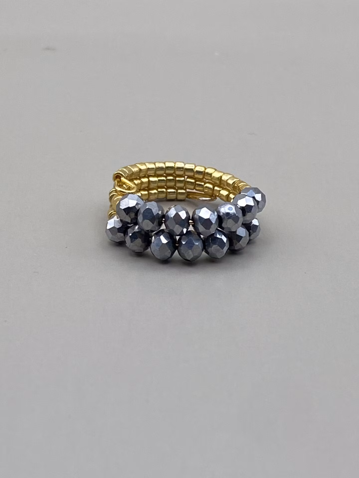 Stilig ring i tvåradigt mönster av små guldfärgade glaspärlor runt om och två rader med stålgråsilverfärgade spegelblanka facetterade glaskristallpärlor. Superfin.