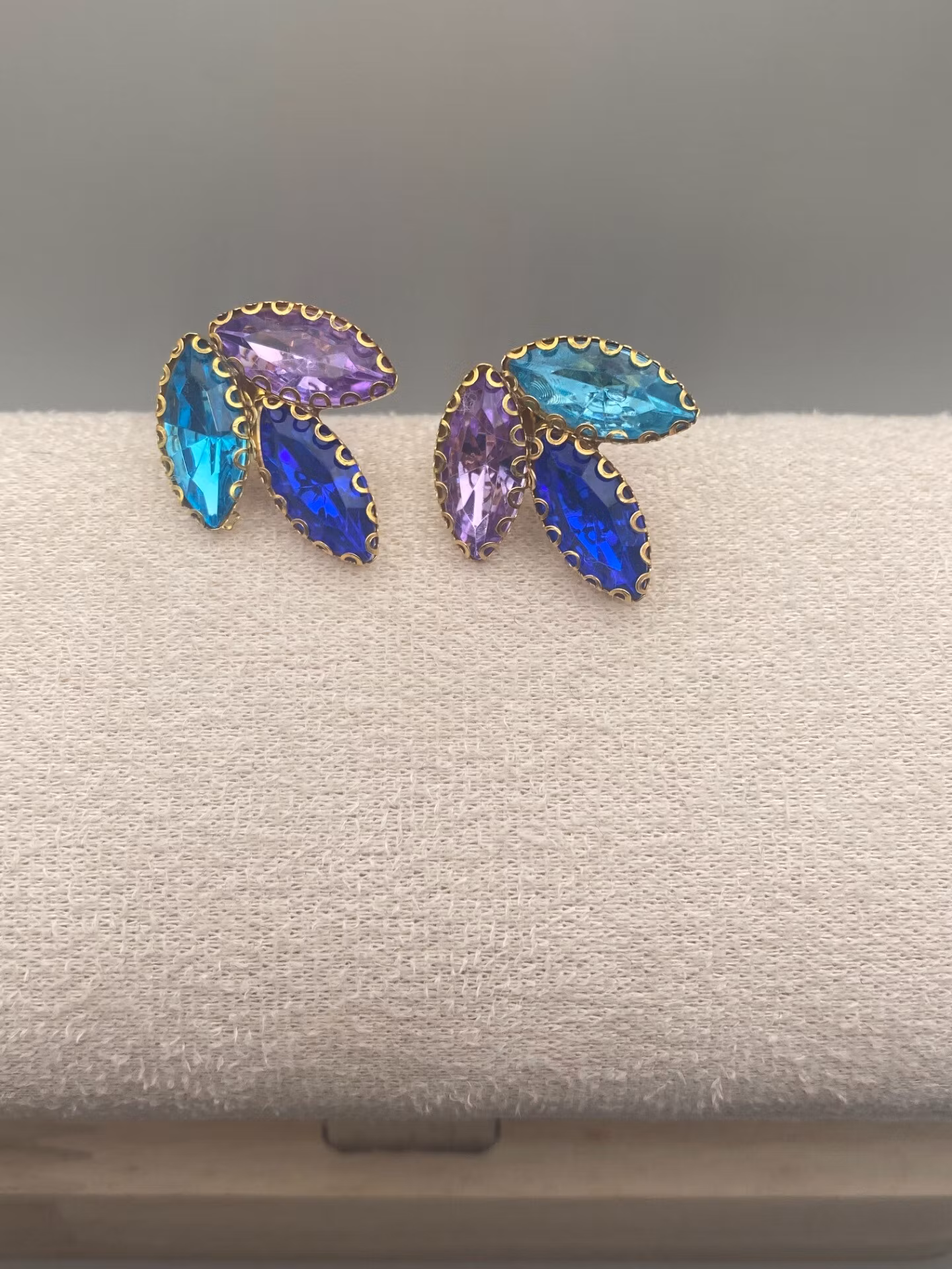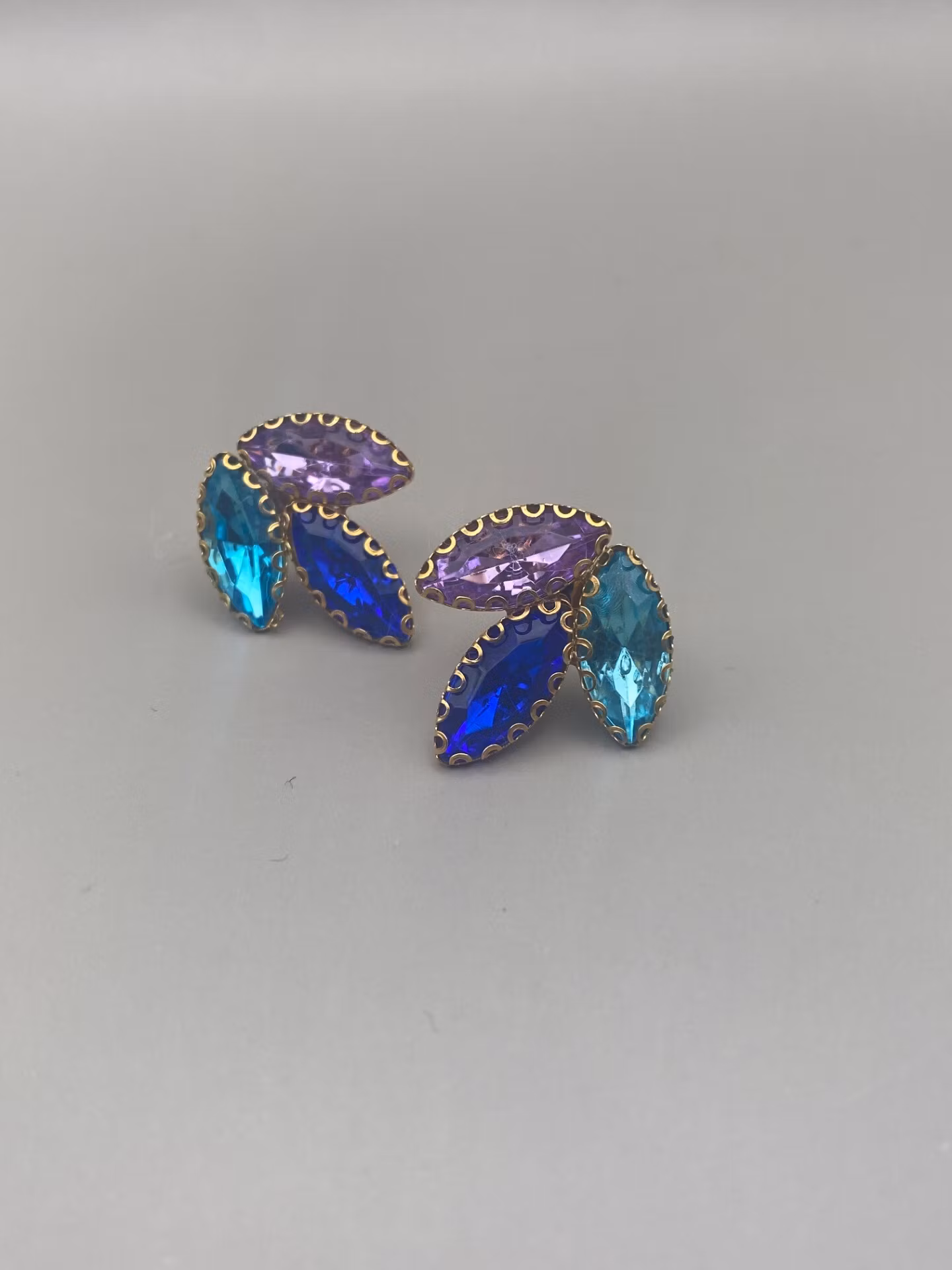 Lekfulla örhängen i tre stycken tårformade strass i färgerna turkos, blå och rosa. Dessa formar tillsammans tre blad eller löv.