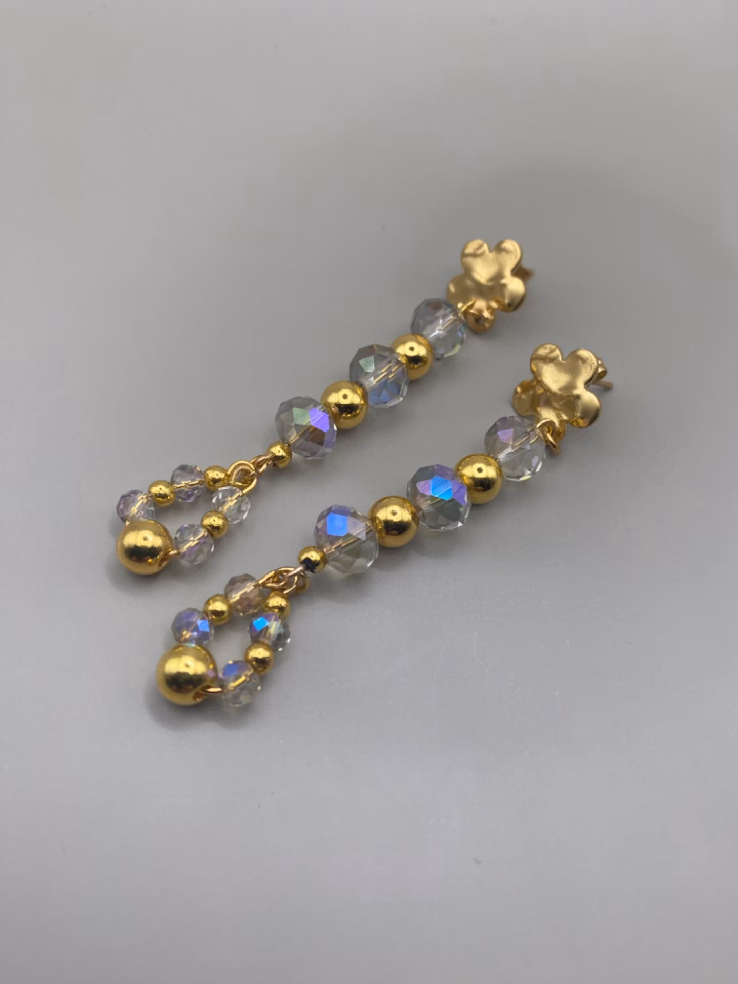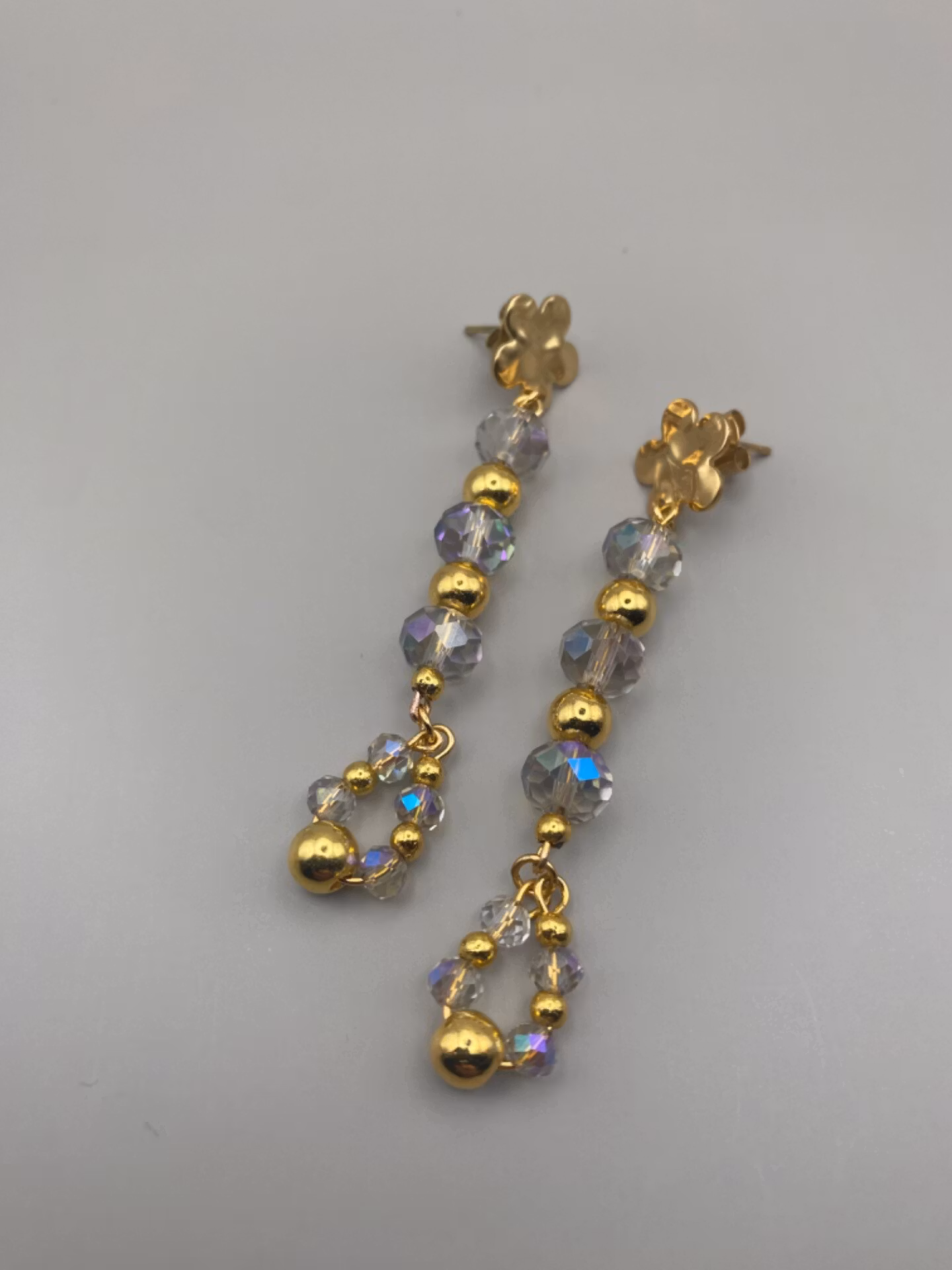 Örhängen med guldfärgade blomma upptill, hängen av guldfärgade pärlor och svagt svagt lila fasetterade glaspärlor.