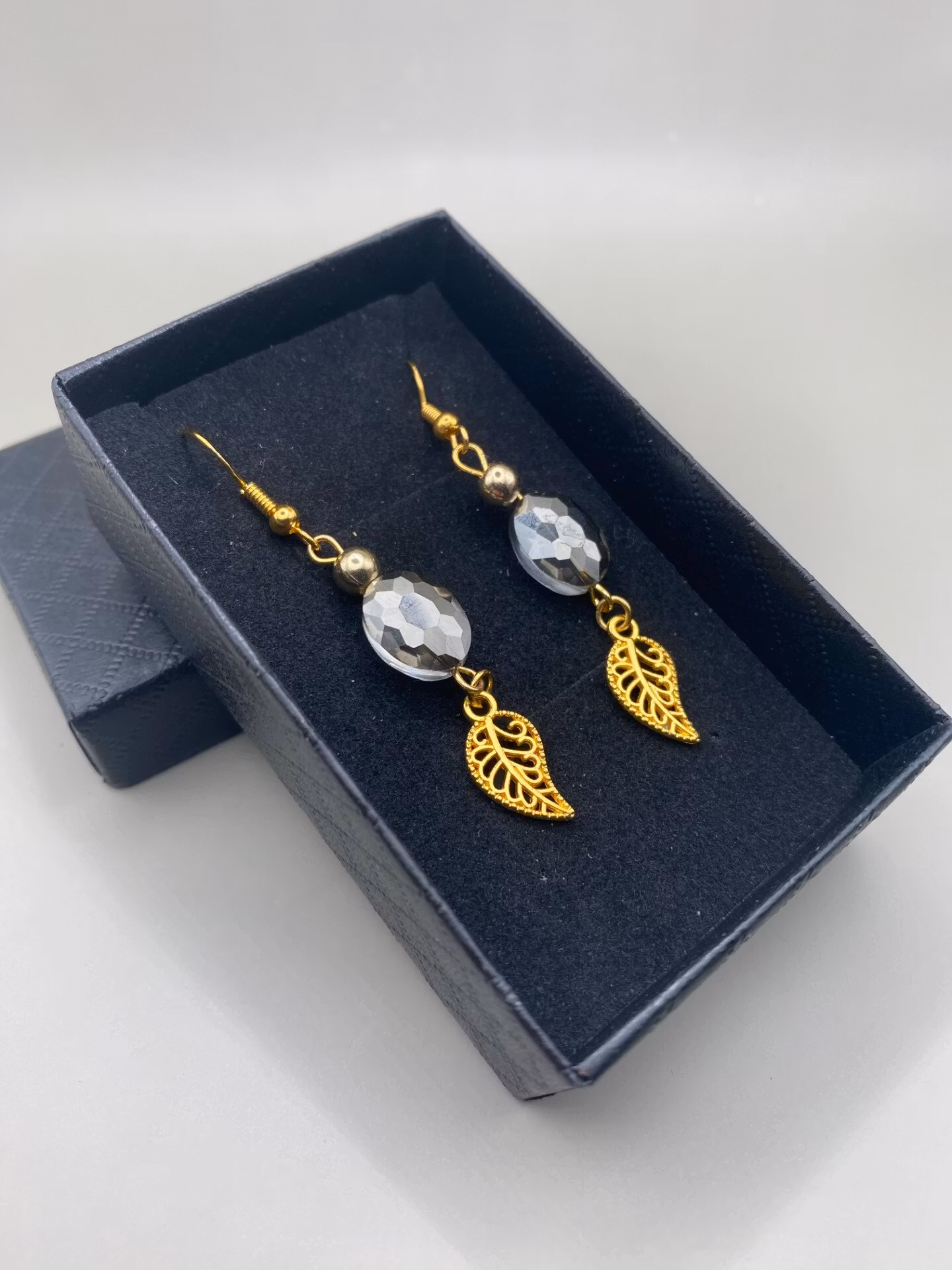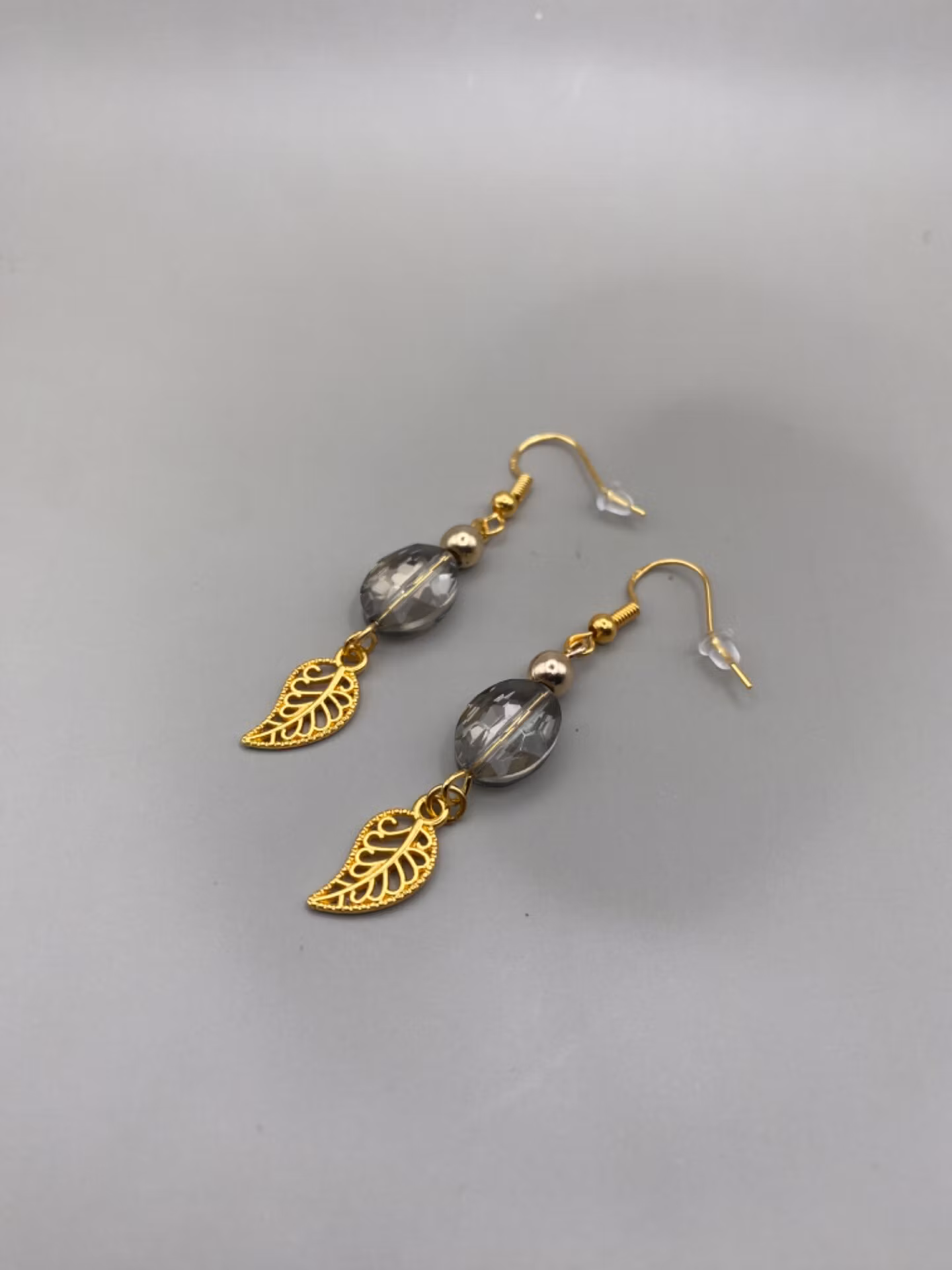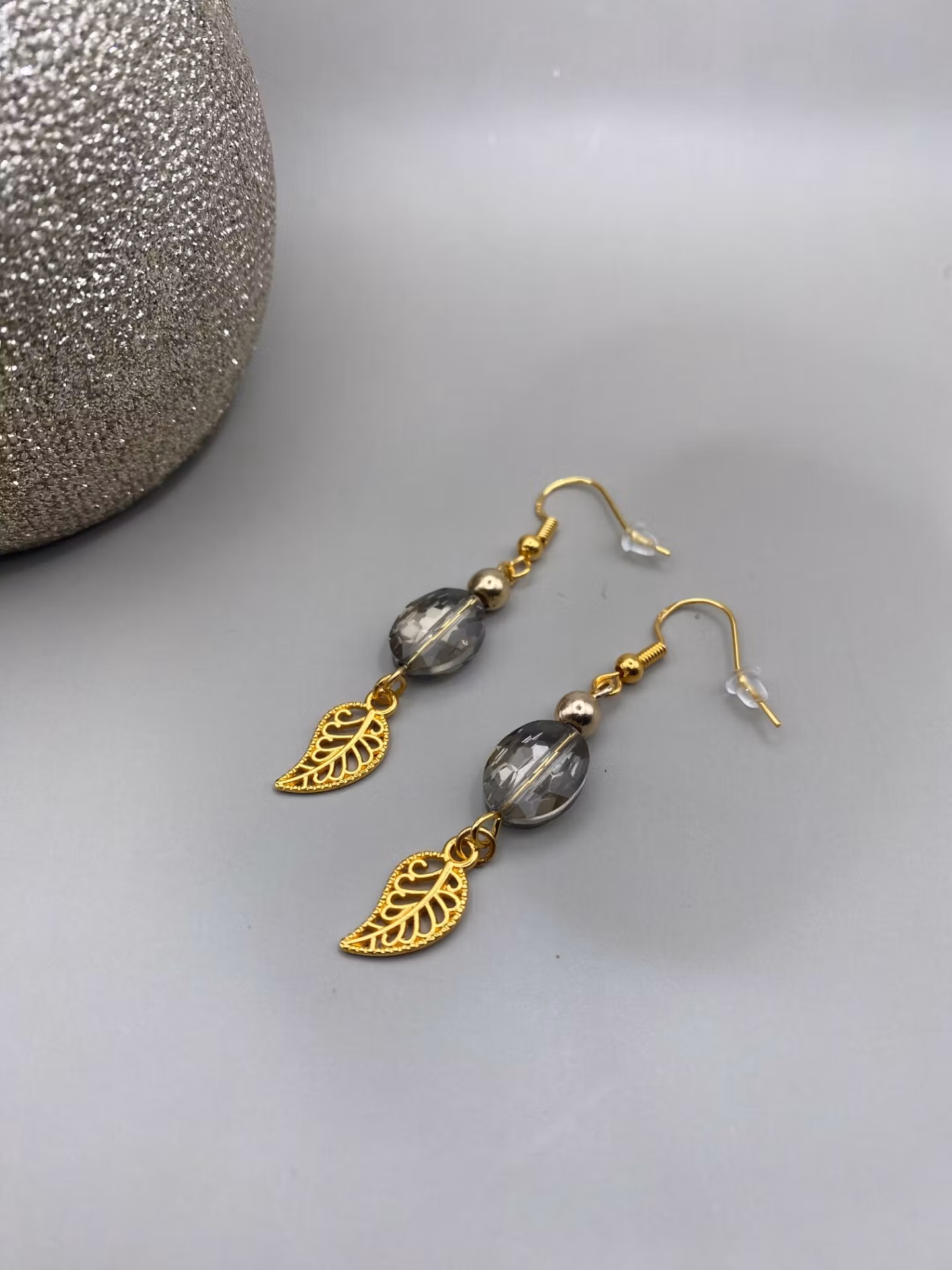 Örhängen med guldfärgad öronkrok, hängen av en guldfärgad pärla och en vackert skimrande rökfärgad fasseterad oval glaspärla. Fin guldfärgat löv som end-hänge.