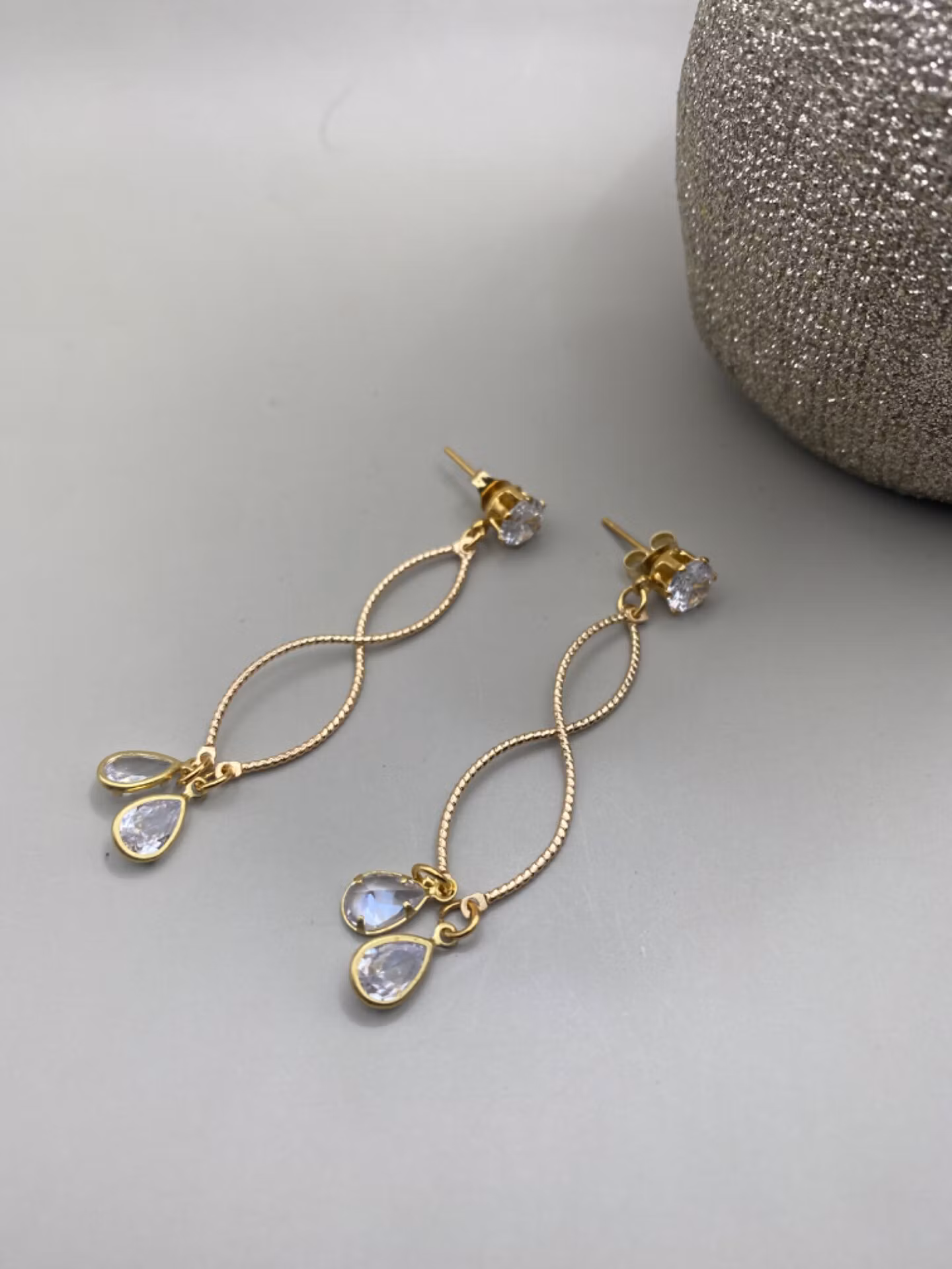 Eleganta guldfärgade örhängen med cubic zirconia sten upptill och två dinglande snirkliga mönstrade hängen med fint hänge med gnistrande glassten nedtill. Gnistrar vackert.