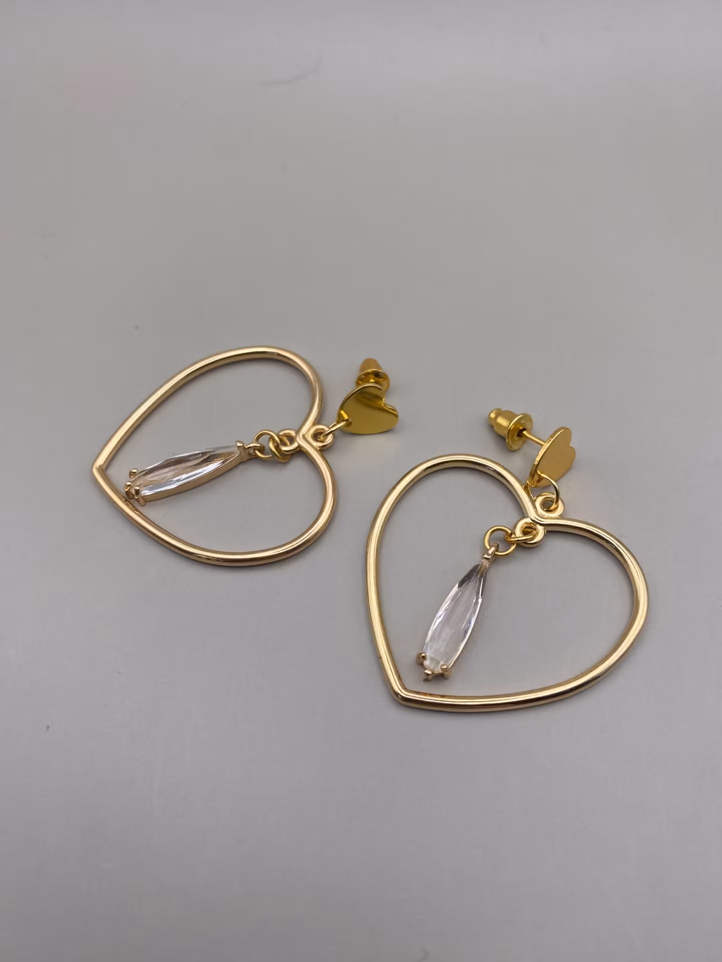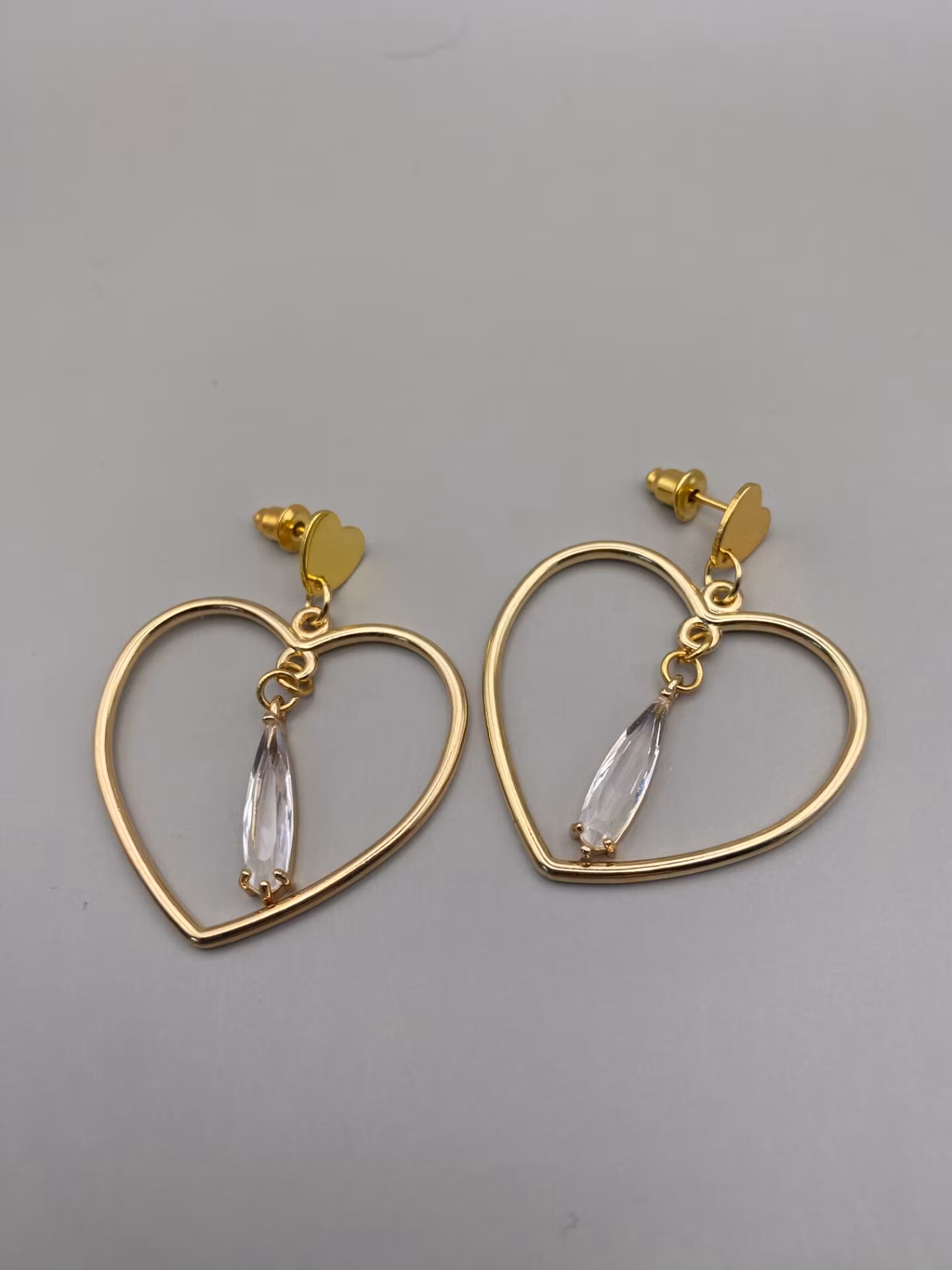 Örhängen i form av guldfärgat hjärta och stort guldformat hänge, också det i form av hjärta och med fint hänge inuti med avlång dekorativ glaspärla. Öronkrok i rostfritt stål.