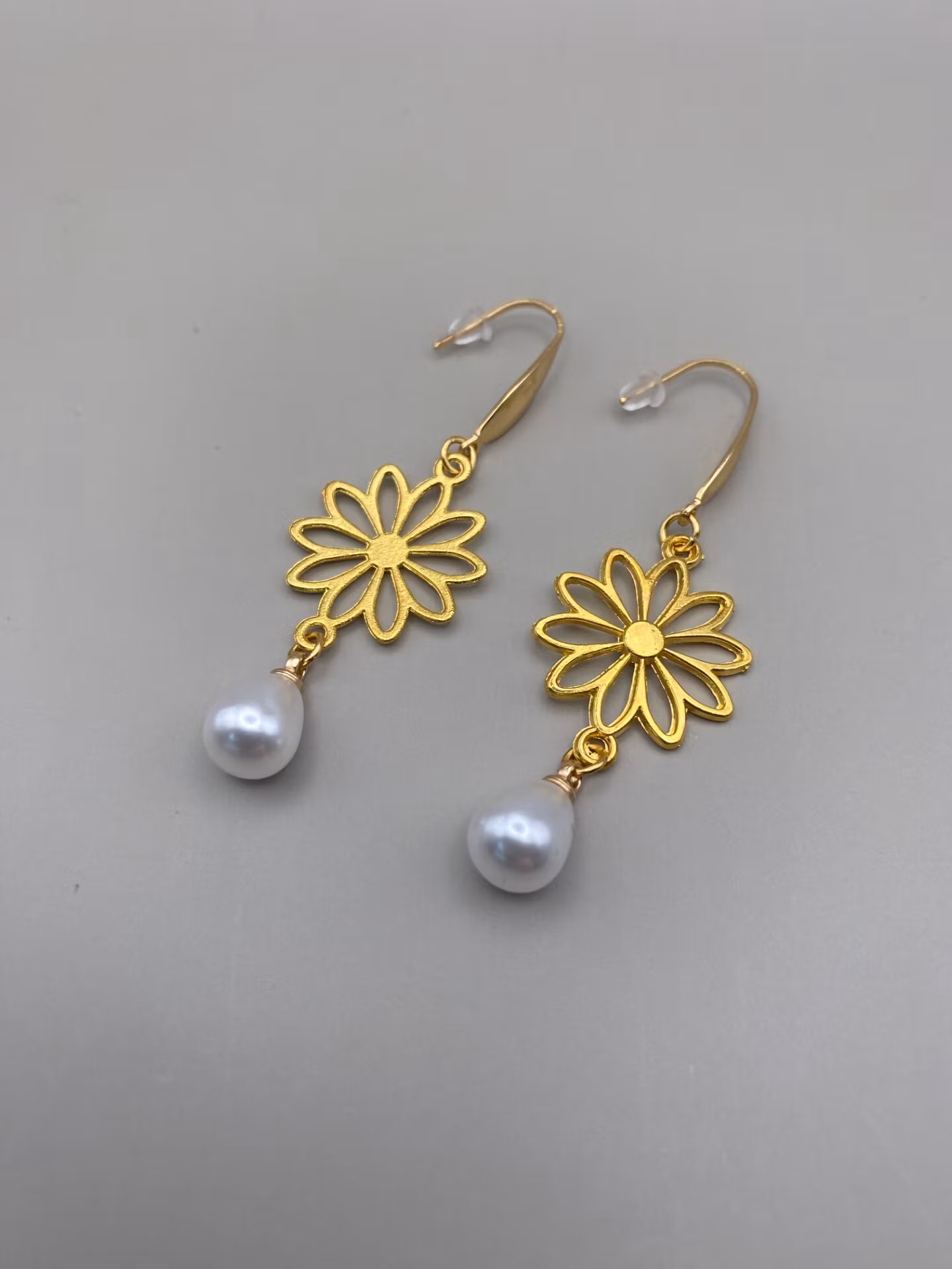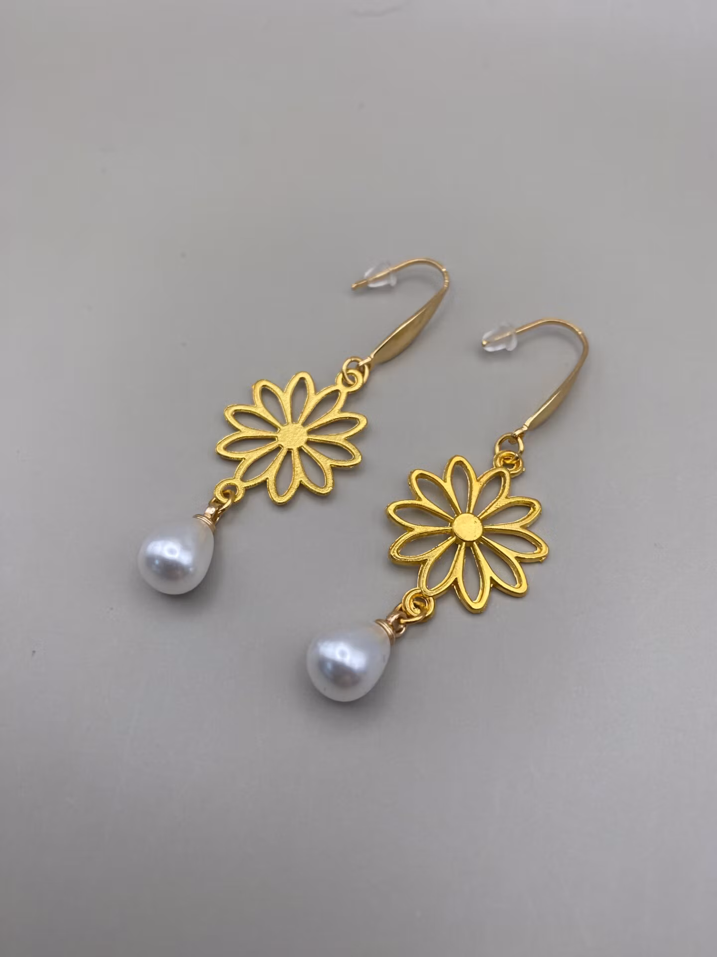 Örhängen med guldfärgad blomma och droppformad vit pärla. Dekorativa öronkrokar i guldfärgat rostfritt stål.