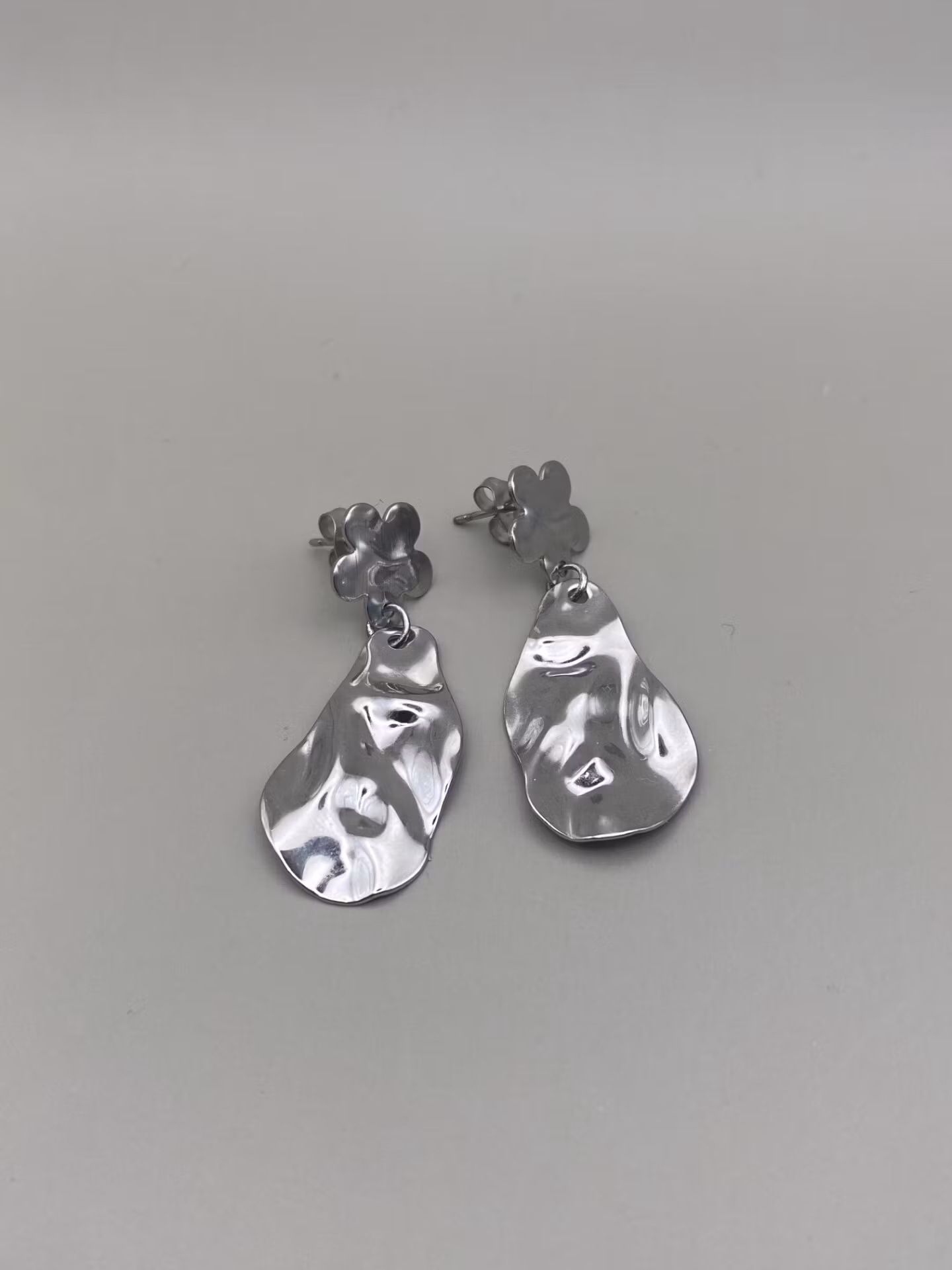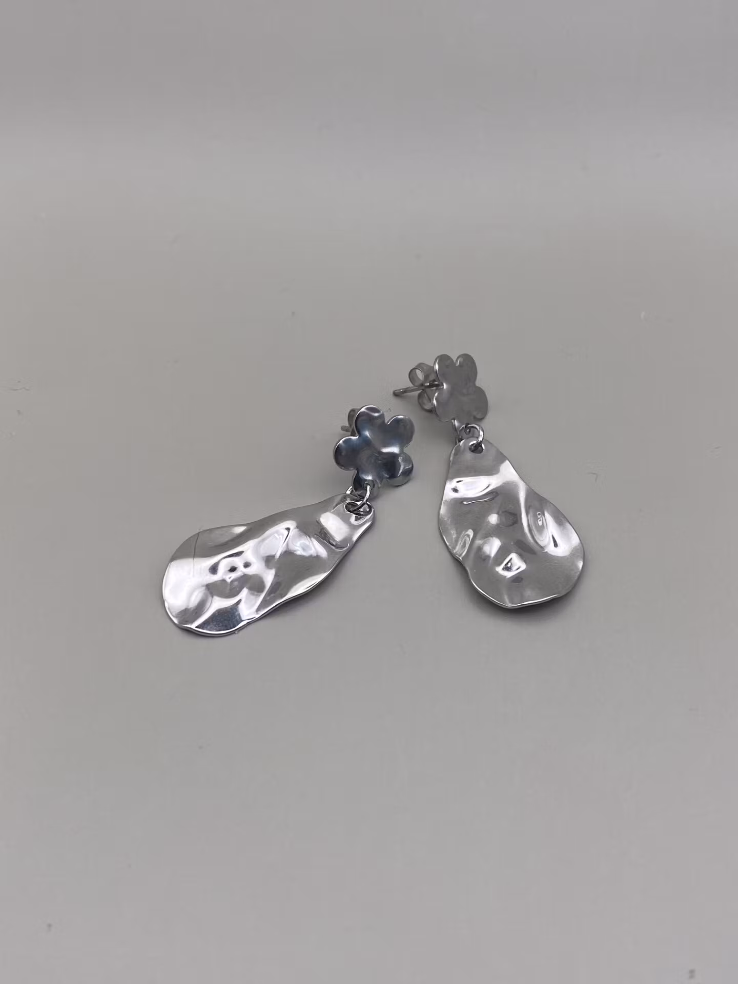 Örhängen i dekorativt silverfärgat ”knackat” hänge och öronkrok i form av blomma. Öronkrok i rostfritt stål.