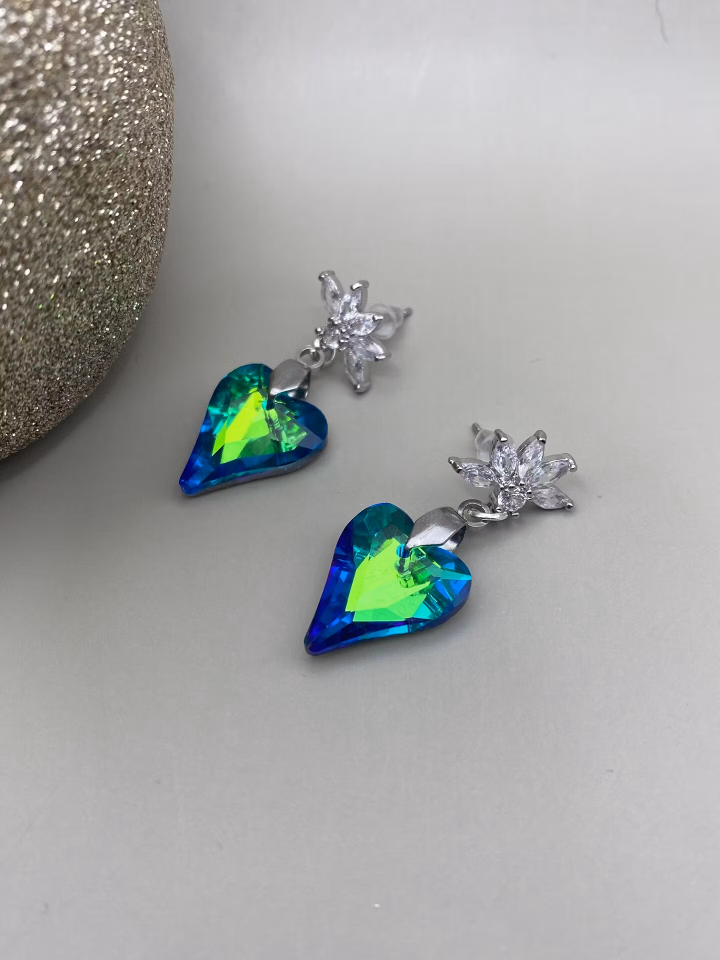 Örhängen i rostfritt stål med cubic zirconia stenar i form av fem blad och vackert hänge i grönskimrande glashjärta.