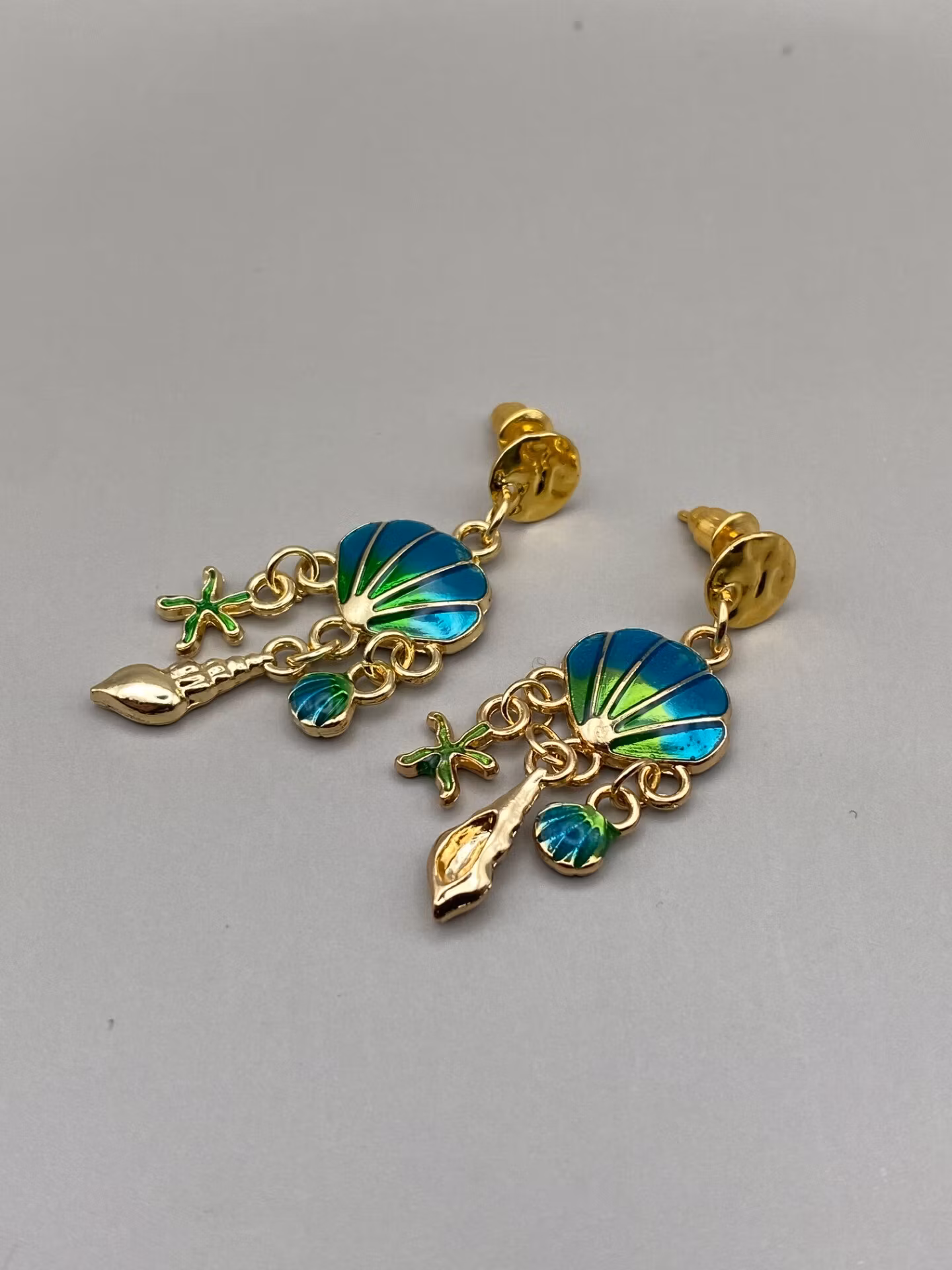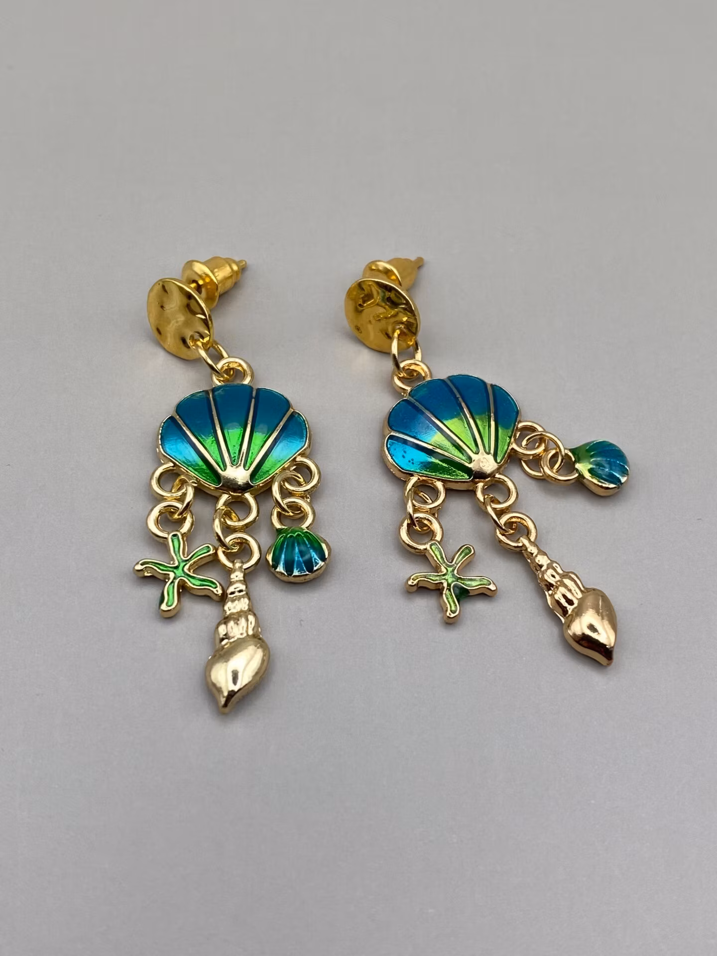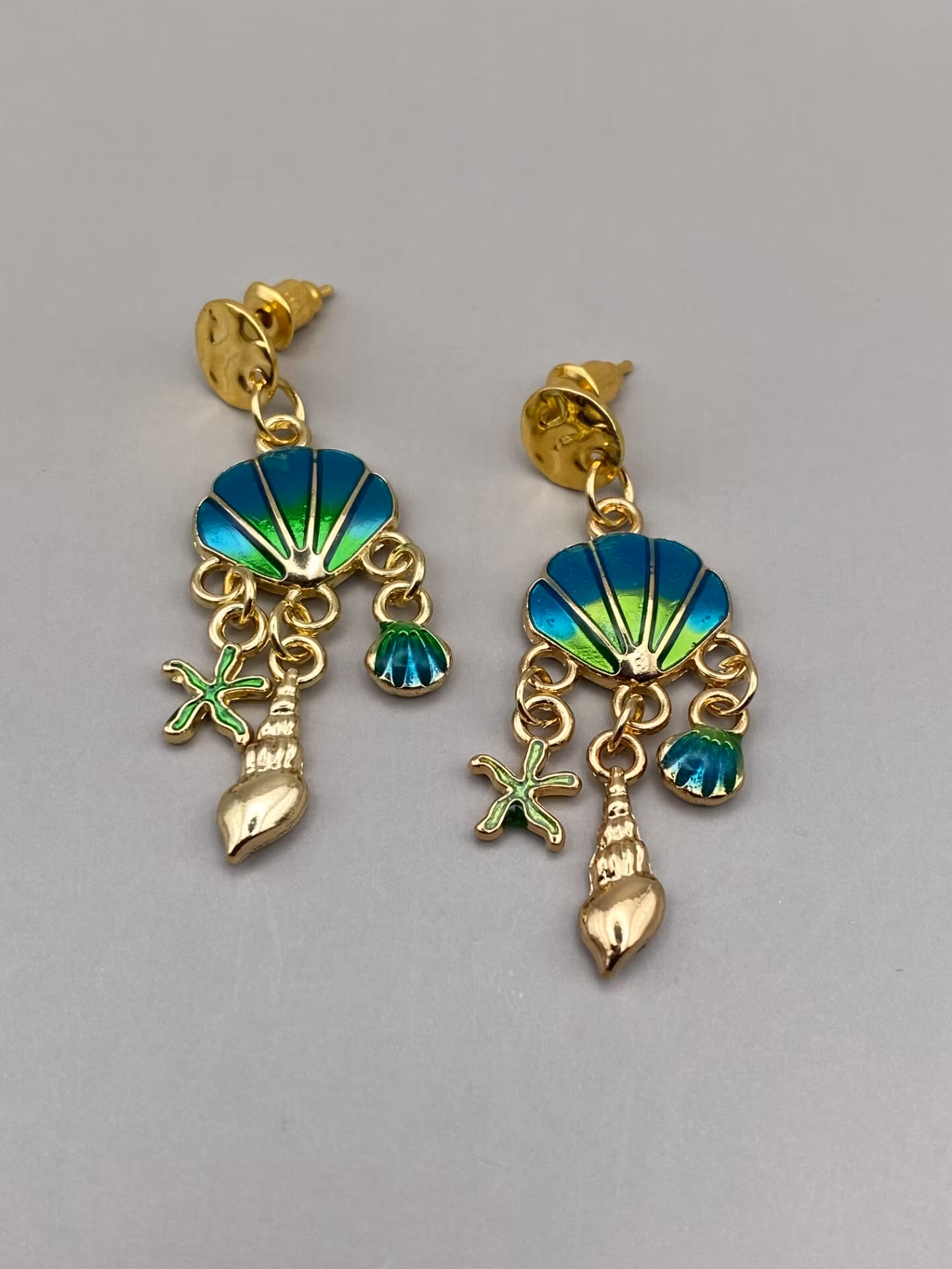 Örhängen i guldfärgat rostfritt stål med hänge i havets tema, turkos snäckor och sjöstjärna.