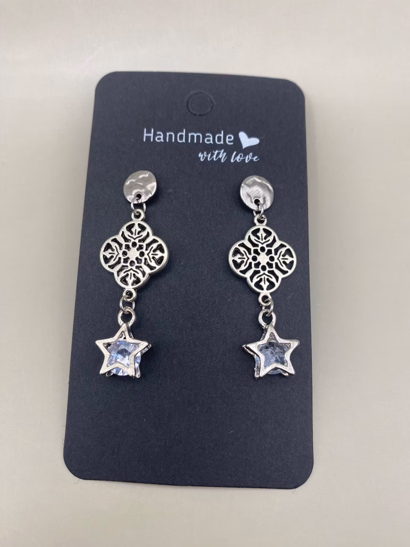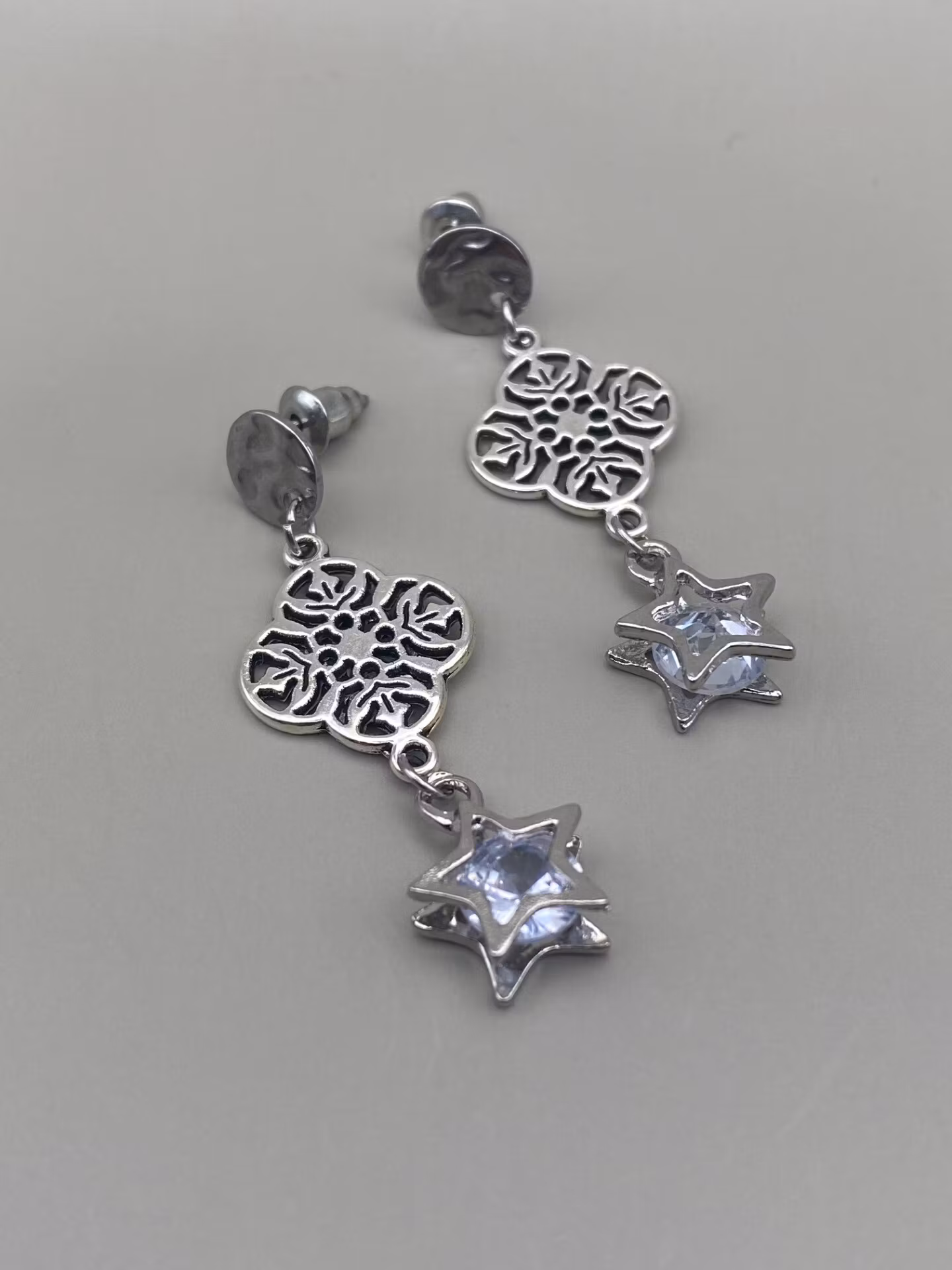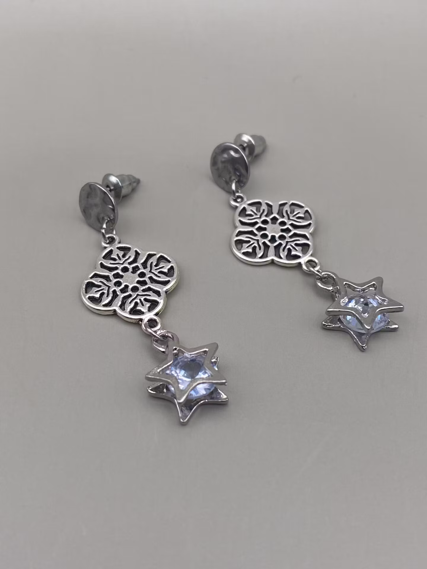 Örhängen i silverfärgad bankad liten platta mot örsnibben med vackert hänge i form av silverfärgat fyrklöver och hängande stjärnta med cubic zirconia.