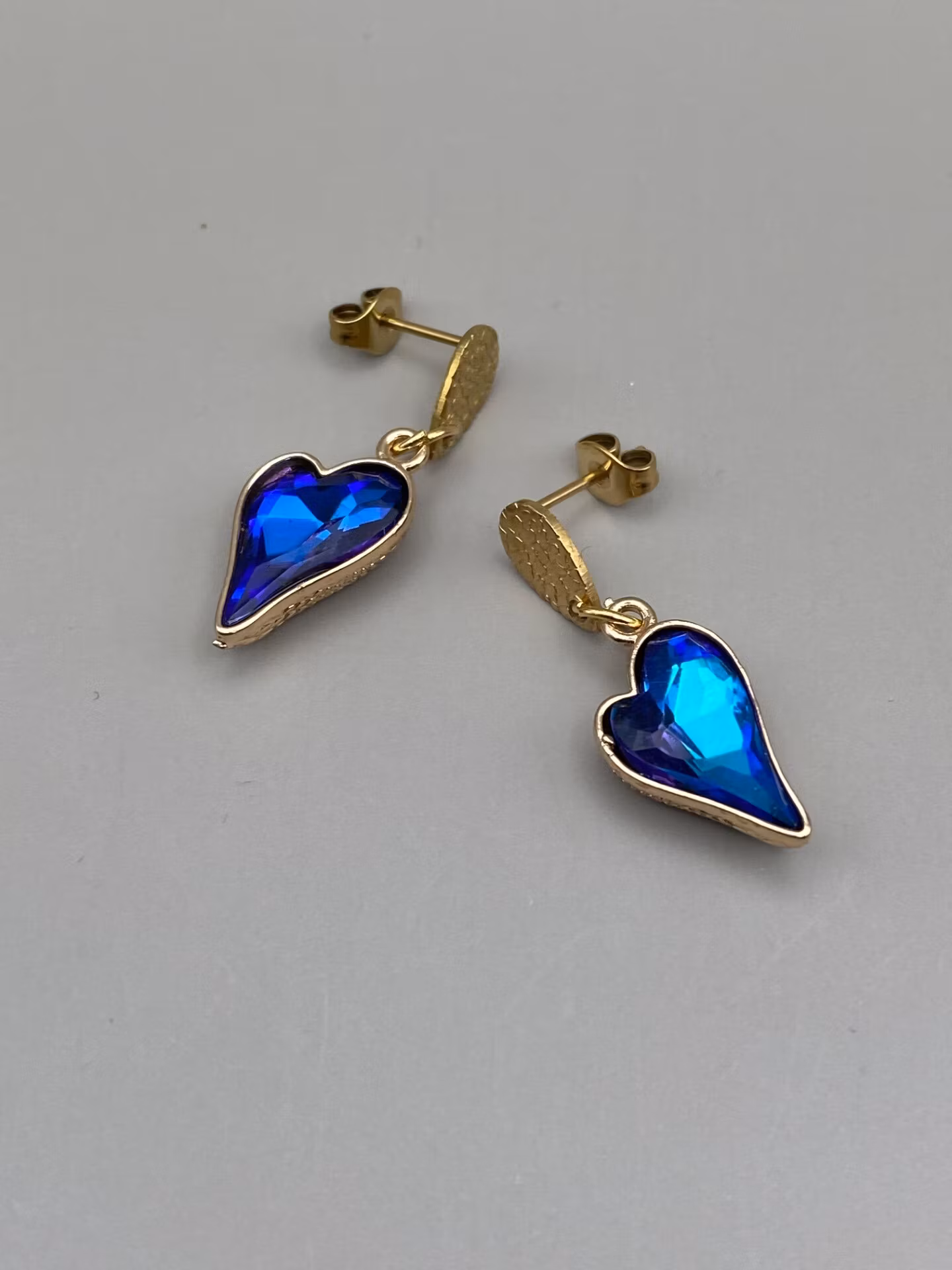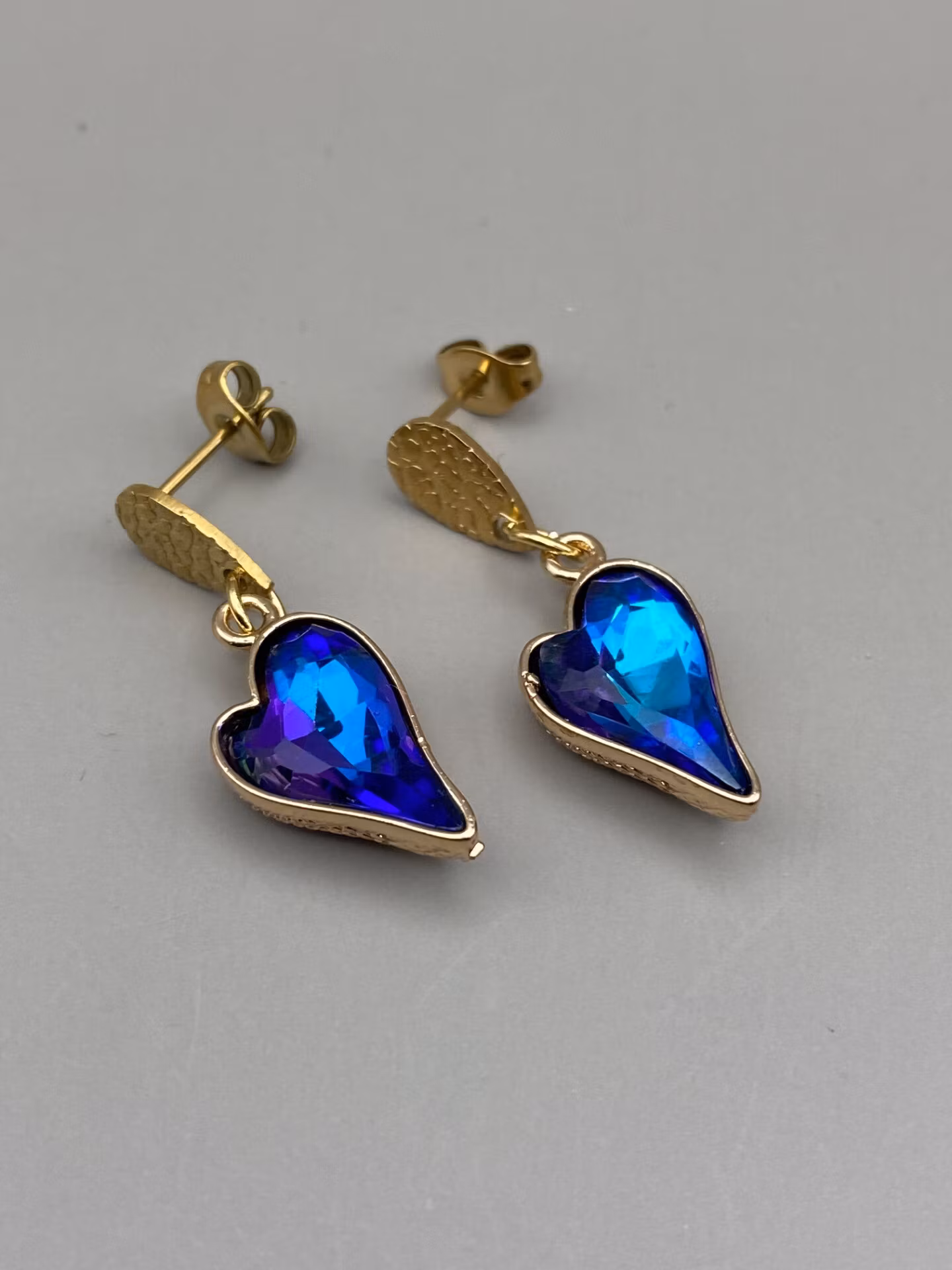 Örhängen i guldfärgat rostfritt stål, en bankad droppformad bricka mot örsnibben och vackert hänge i form av oregelbundet blått skimrande glashjärta.
