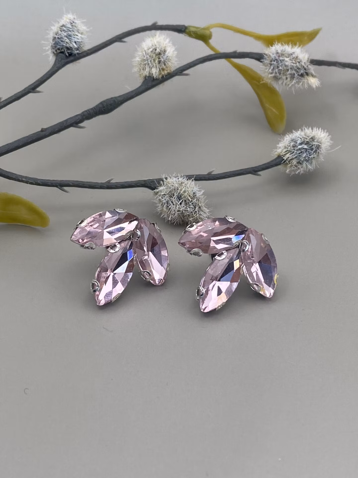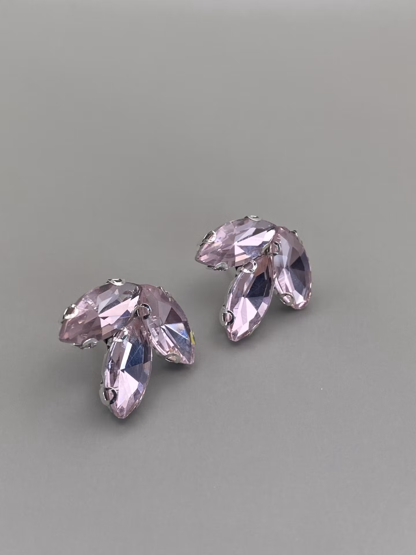 Tjusiga örhängen format som tre blad av ljusrosafärgad glaskristall