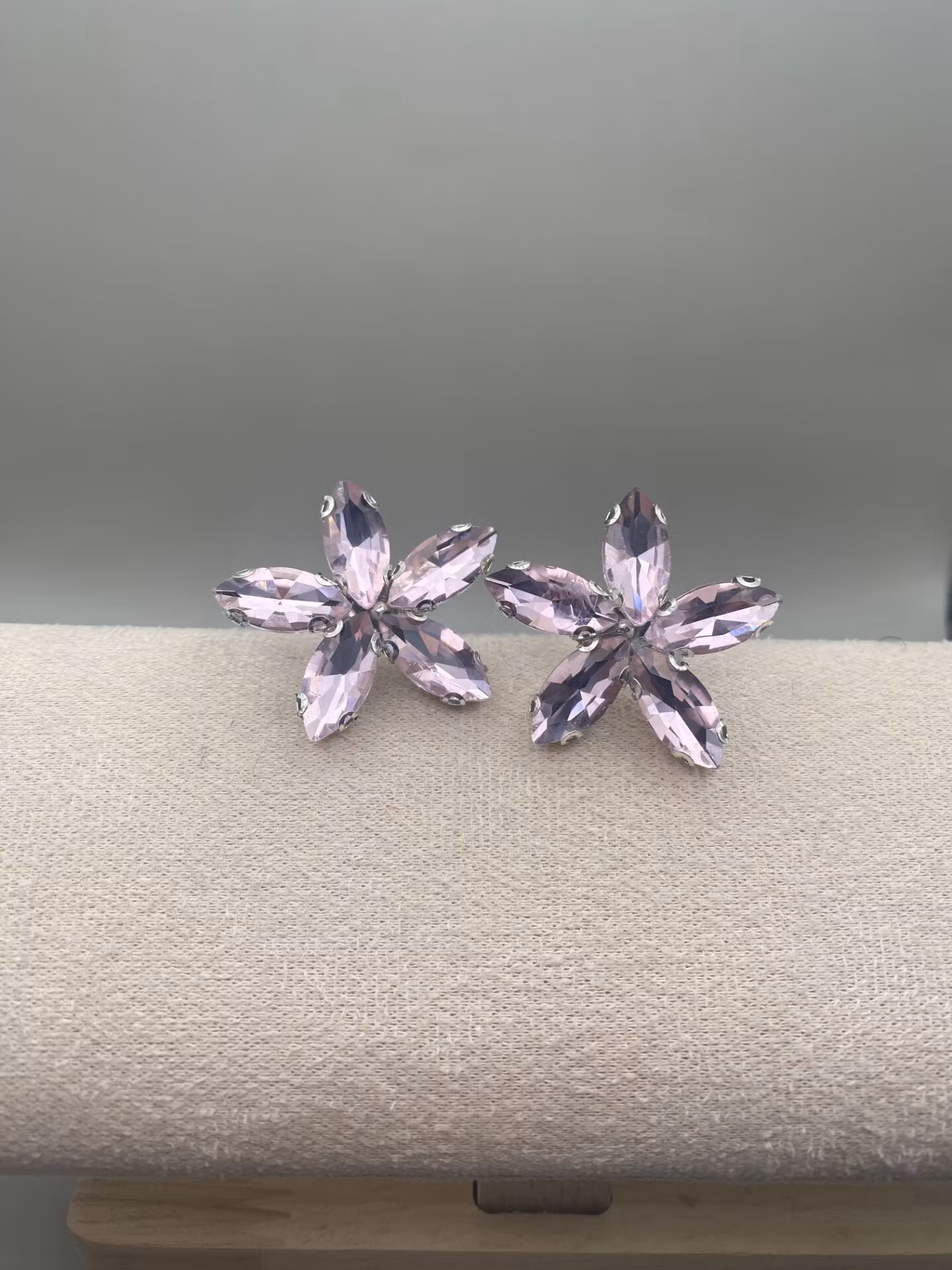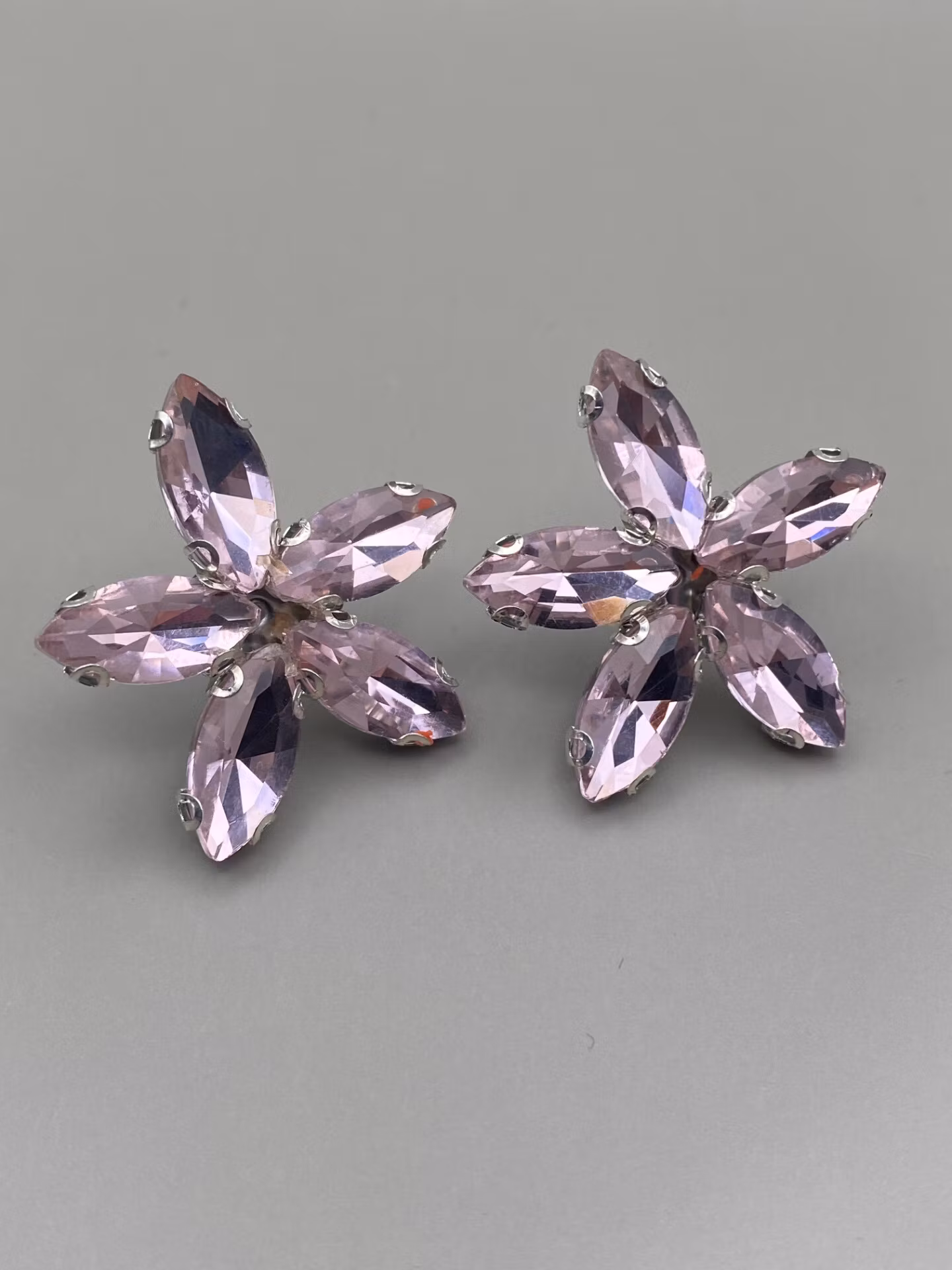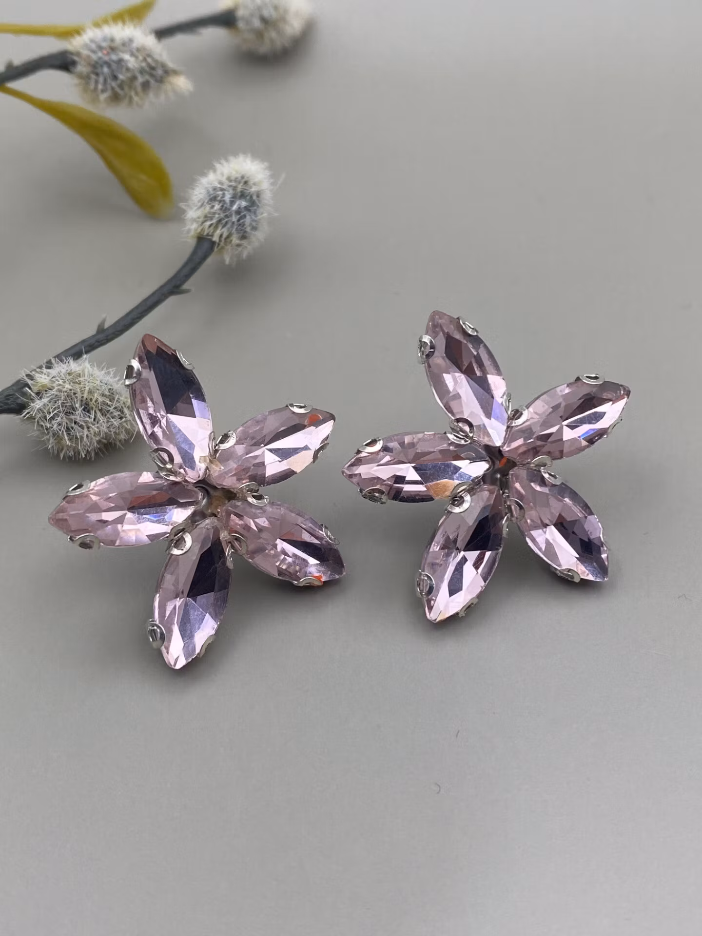 Tjusiga stora örhängen format som en blomma av ljusrosa glaskristaller.