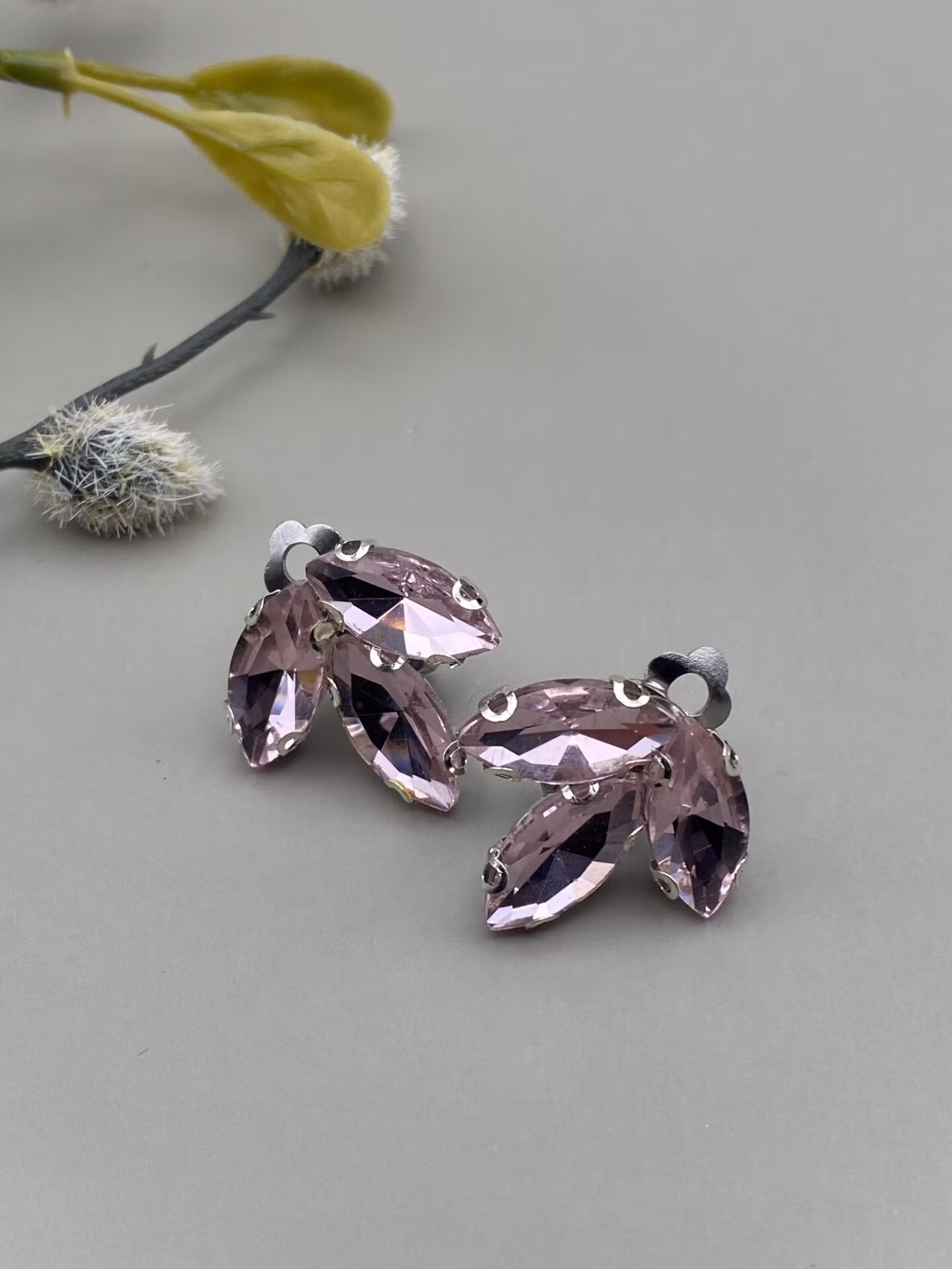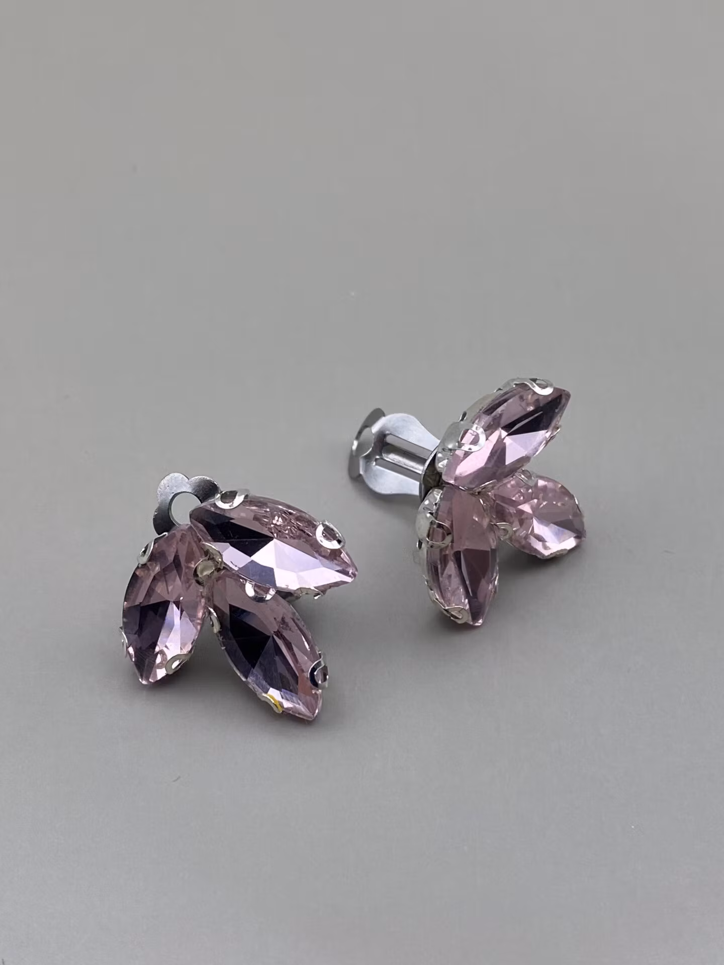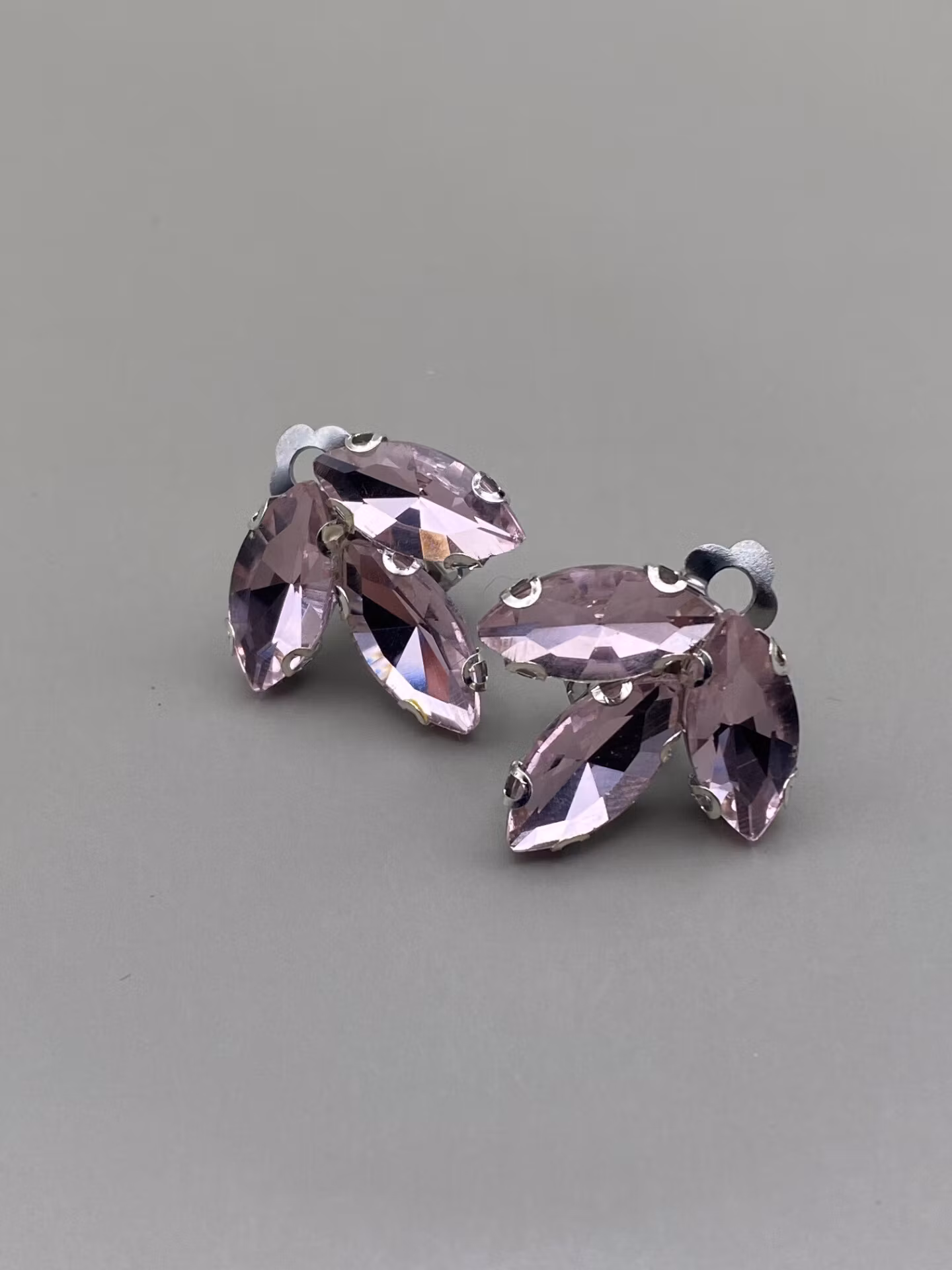 Tjusiga örhängen format som tre blad av ljusrosafärgad glaskristall och clips för den som inte har hål i öronen