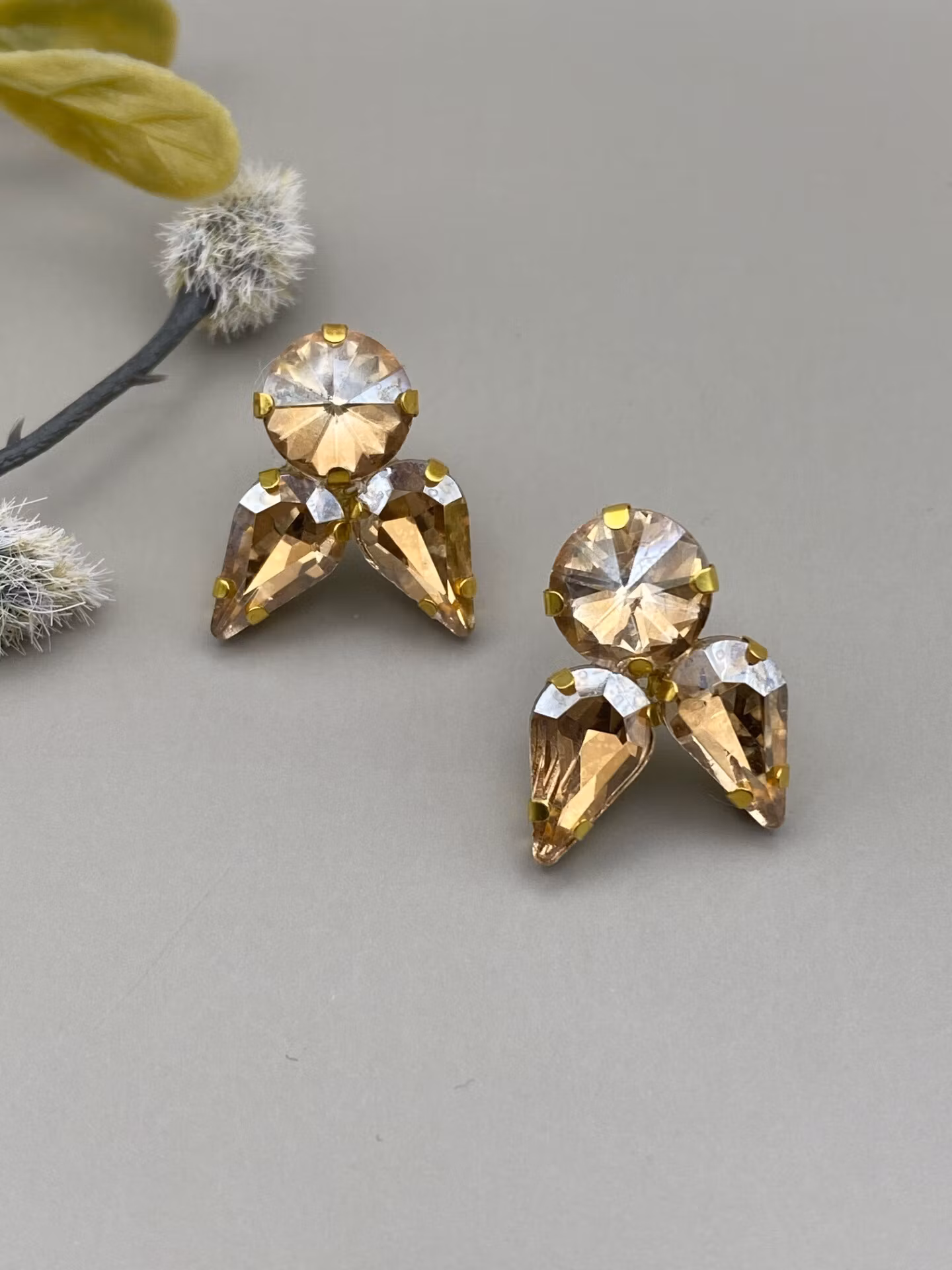 Tjusiga örhängen med vacker stor rund champagnefärgad glaskristall följt av två droppformade champagnefärgade stenar.