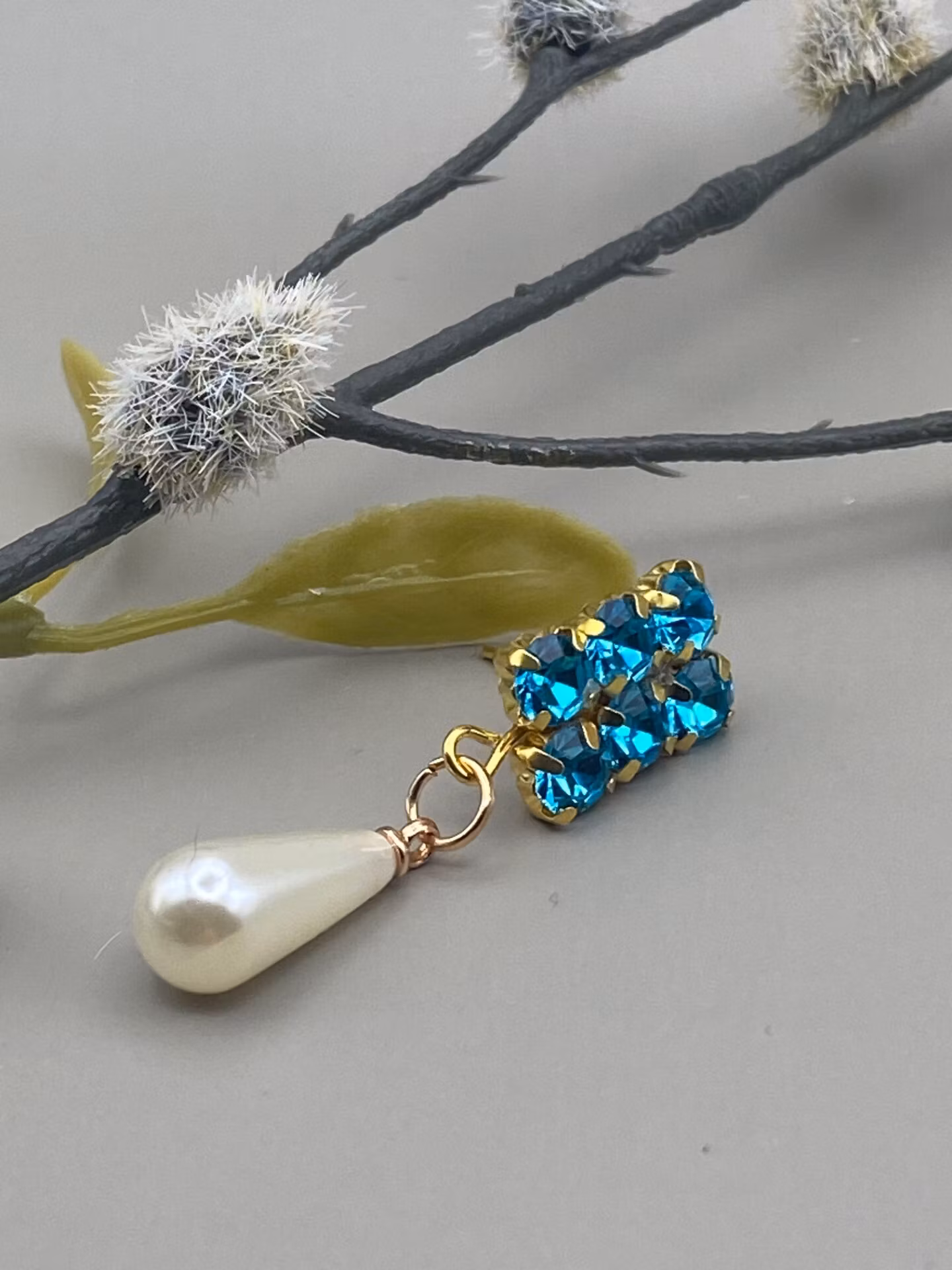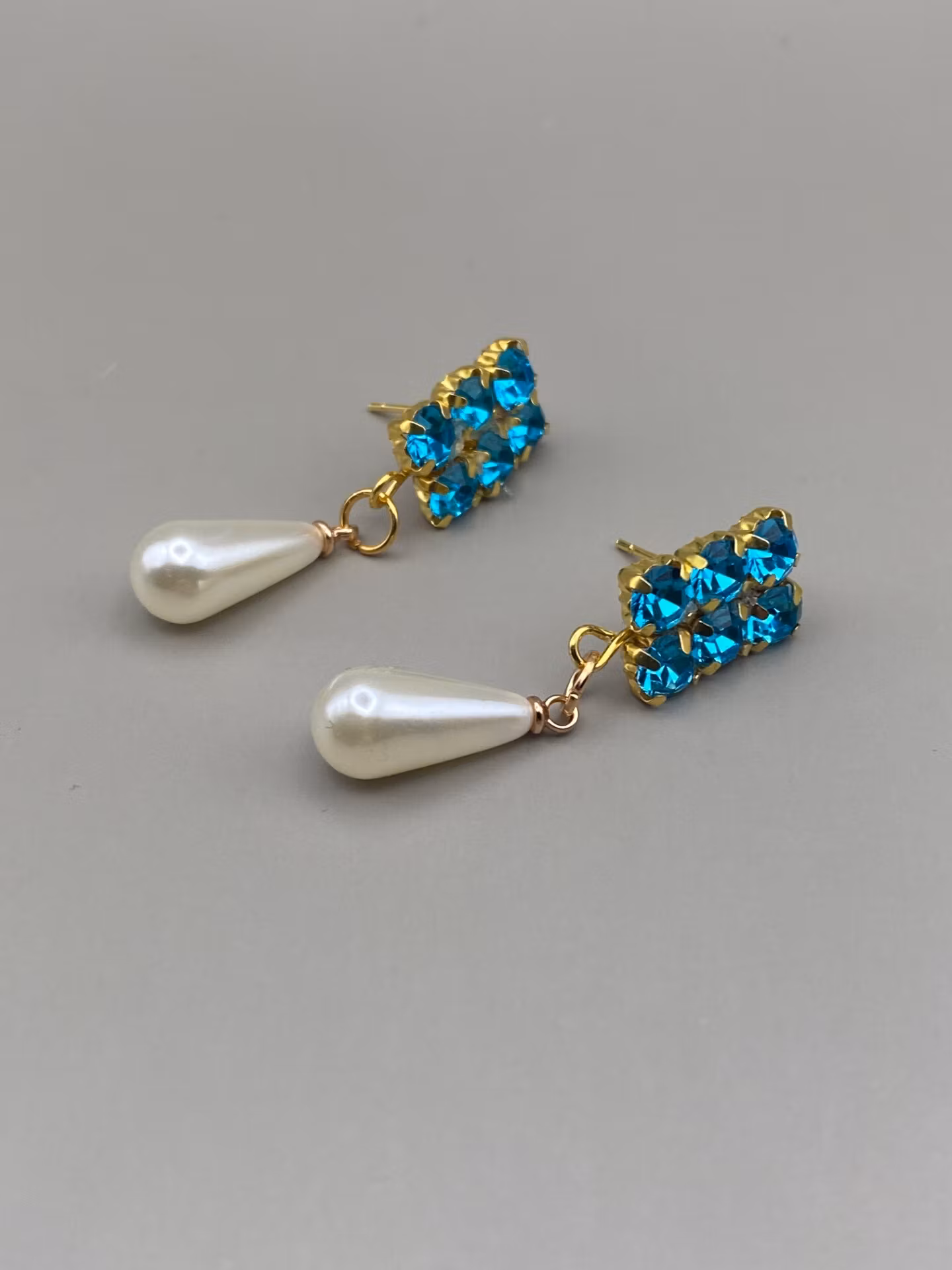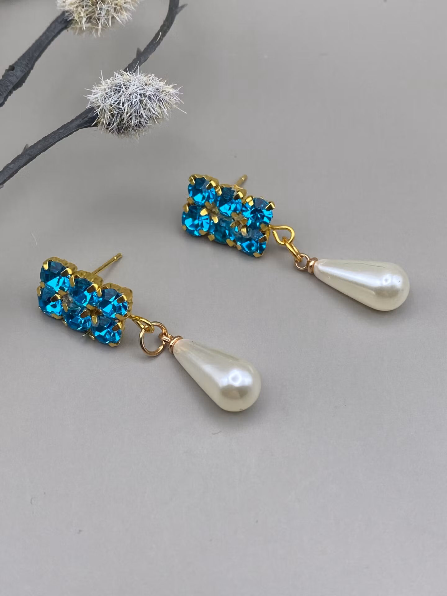 Lekfullt vackra örhängen i turkos glaskristall strass och en avlång benvit pärla.