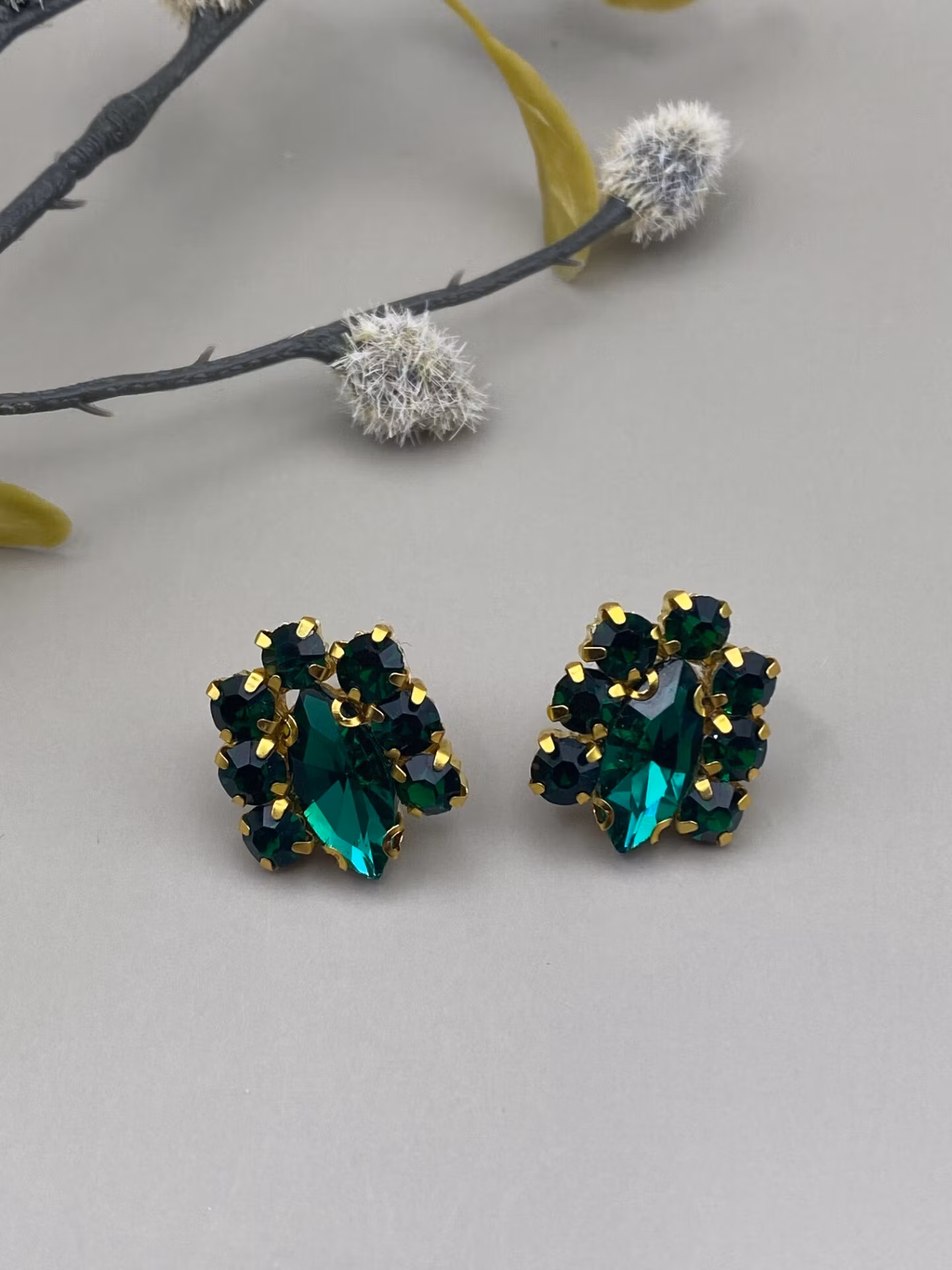 Tjusiga örhängen i mörkgrön glaskristall, en stor tårformad glaskristall och sex små runda strass i fint mönster runtom.