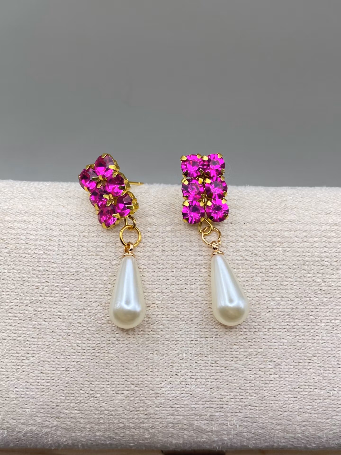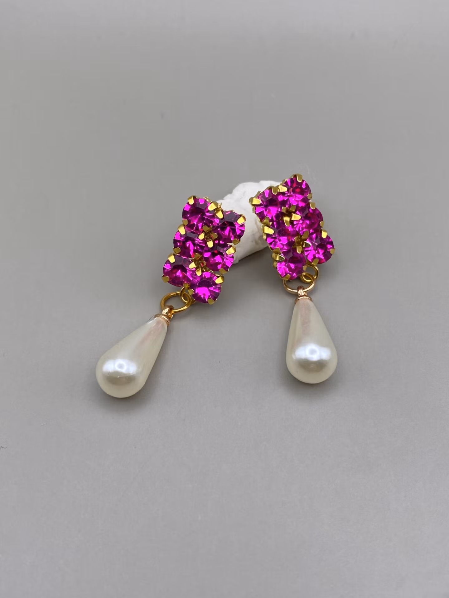 Lekfullt vackra örhängen i rosa glaskristall strass och en avlång benvit pärla.