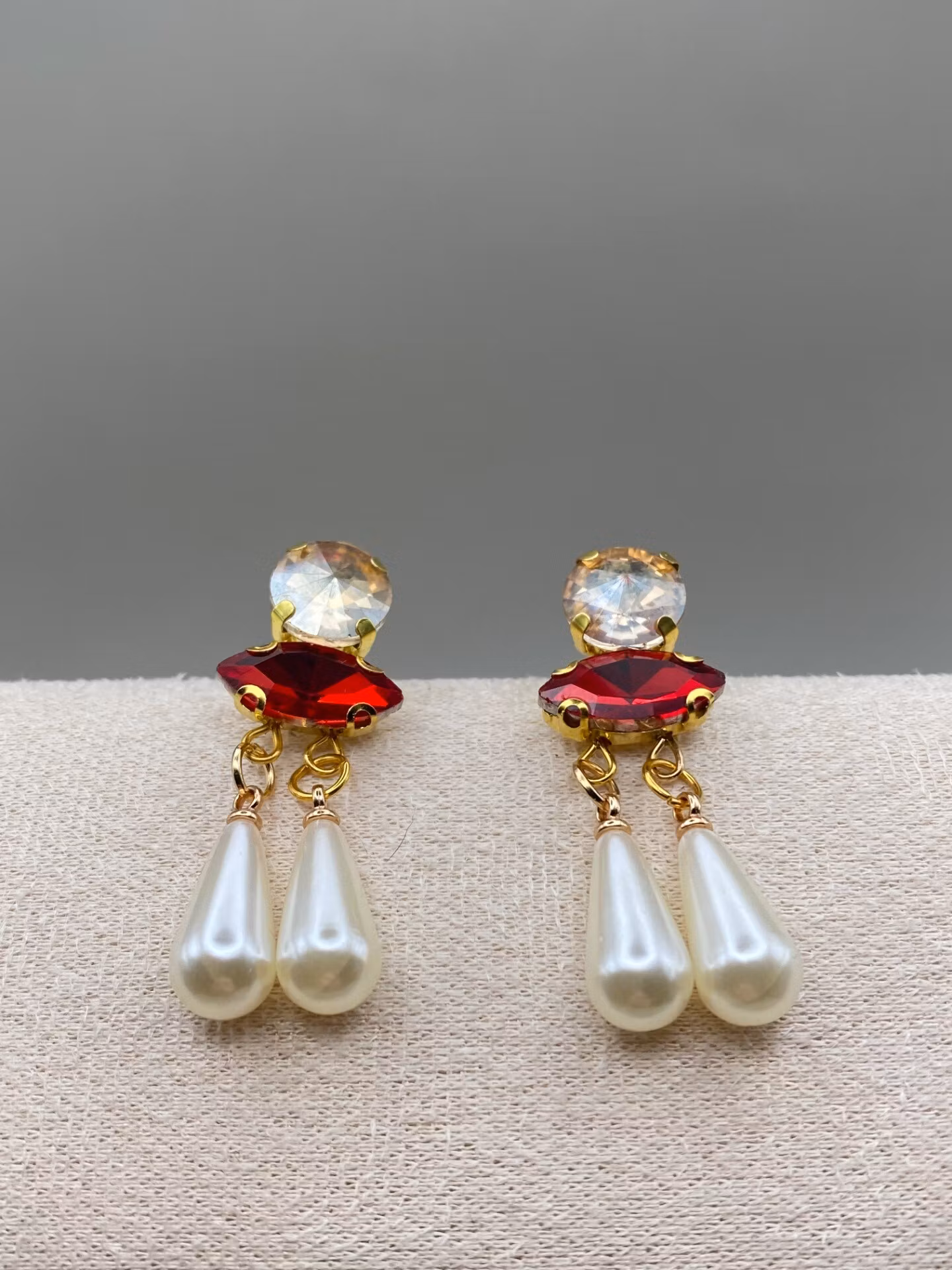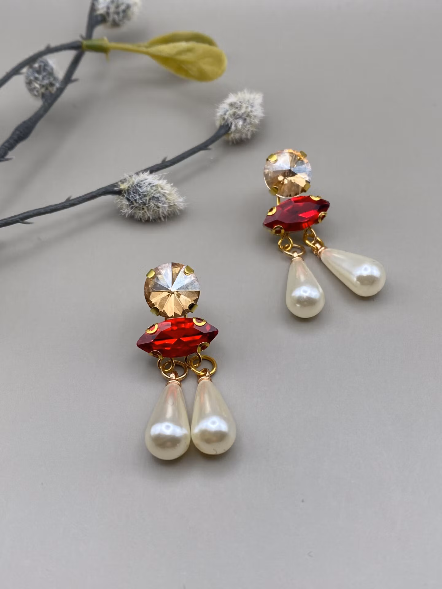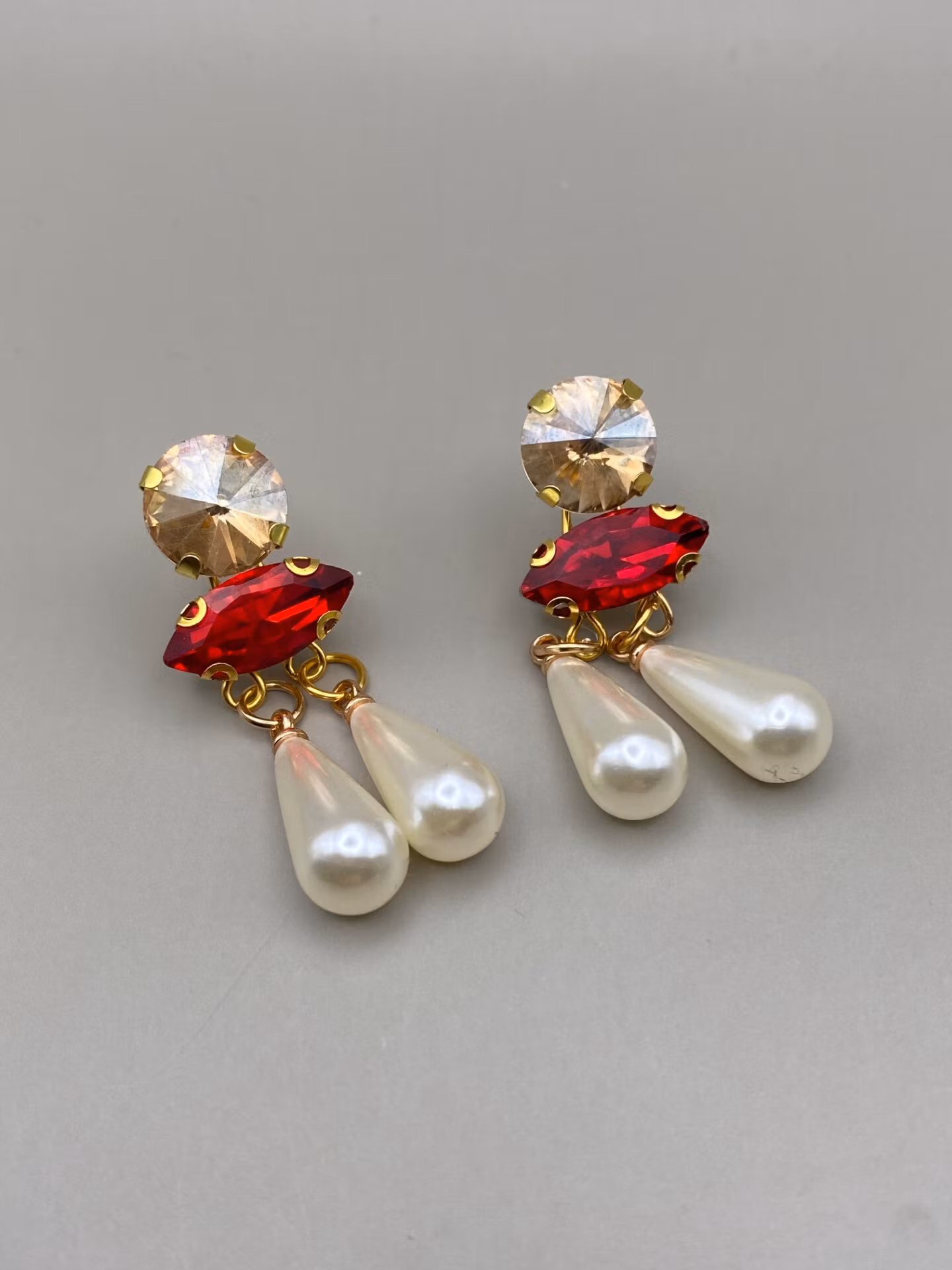 Lekfulla örhängen i varvat champagnefärgad och rödglaskristall strass och två hängade avlånga benvita pärlor.