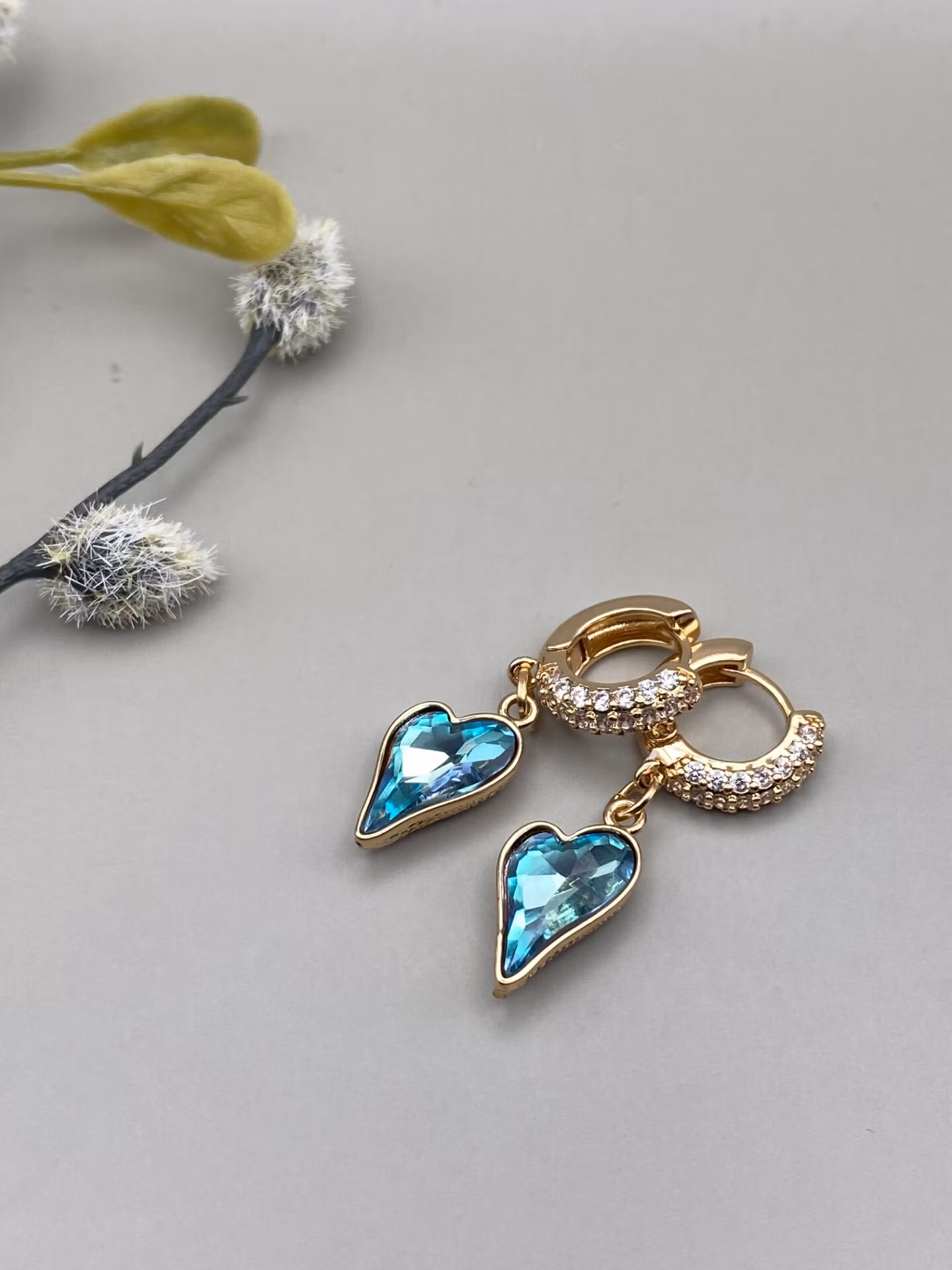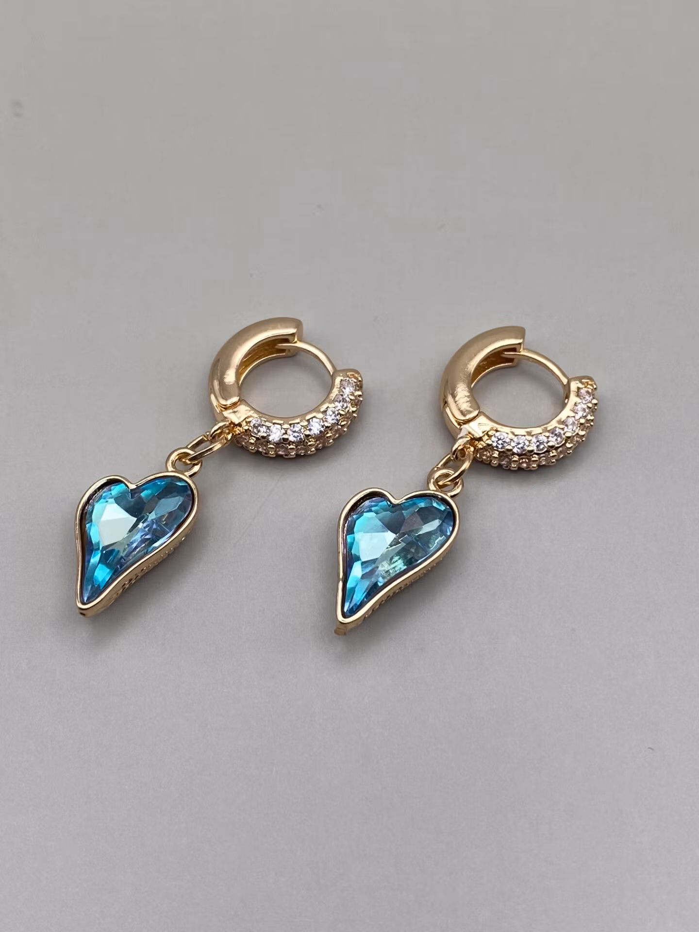 Örhängen i guldfärgat rostfritt stål med strass (rhinestones) och vackert hänge i form av oregelbundet blåskimrande hjärta.