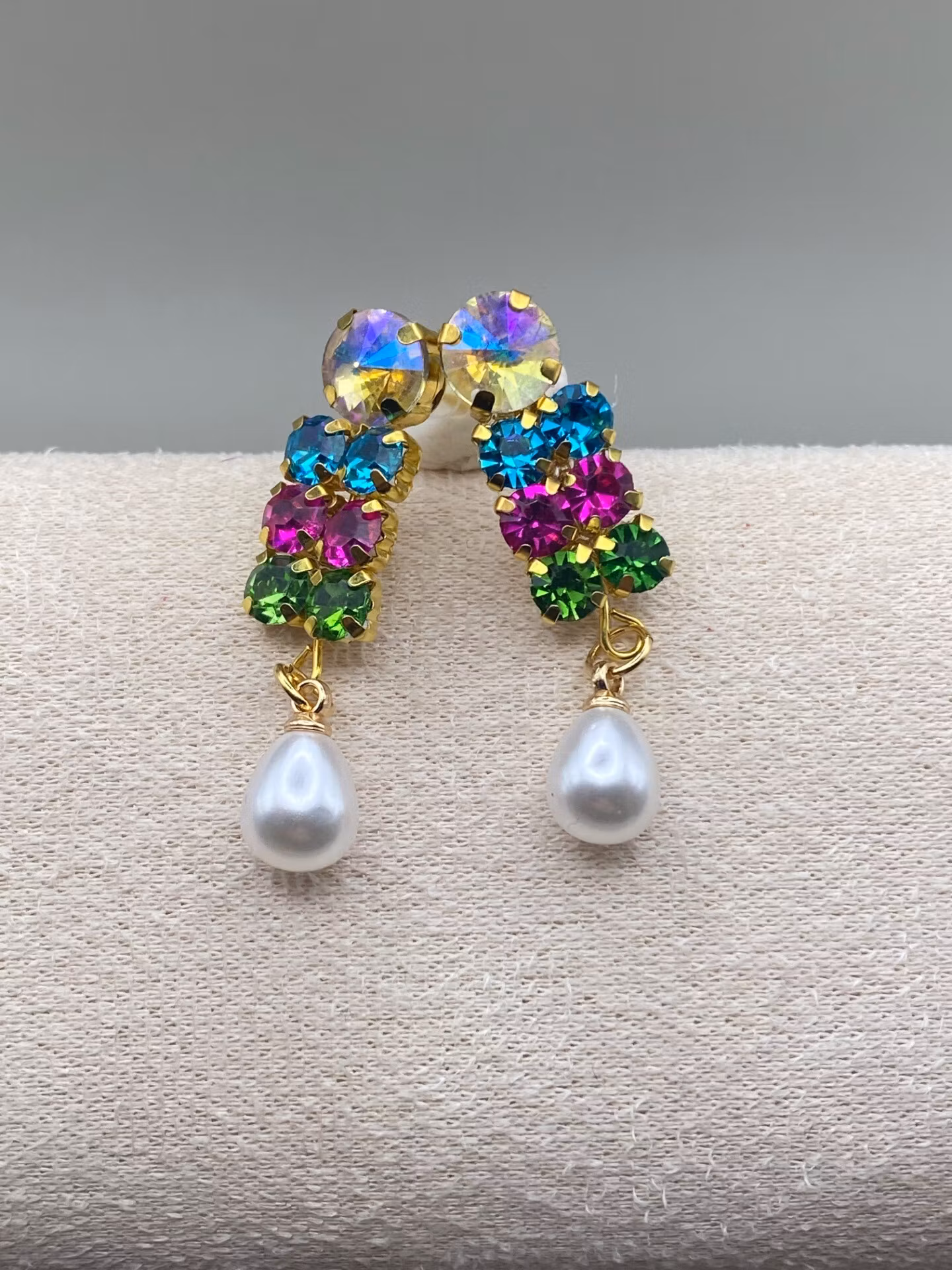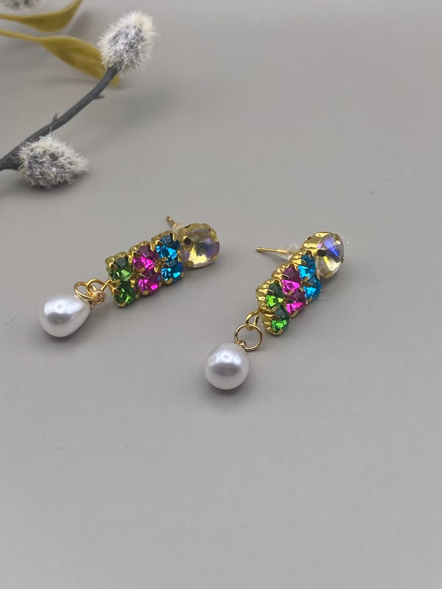 Lekfullt vackra örhängen i rosa, turkos och ljusgrön och champagnefärgad glaskristall strass och två droppformade benvita pärlor.