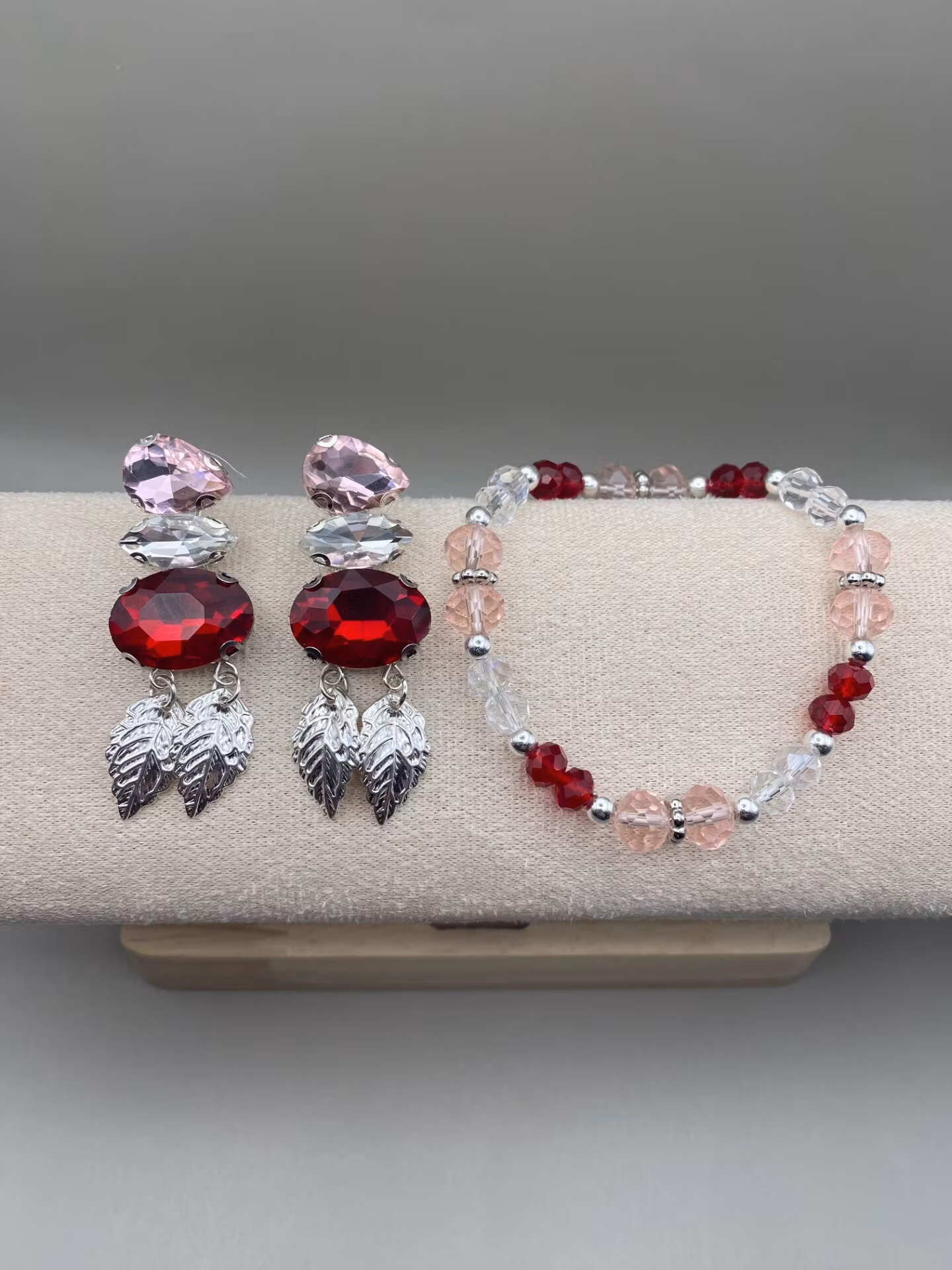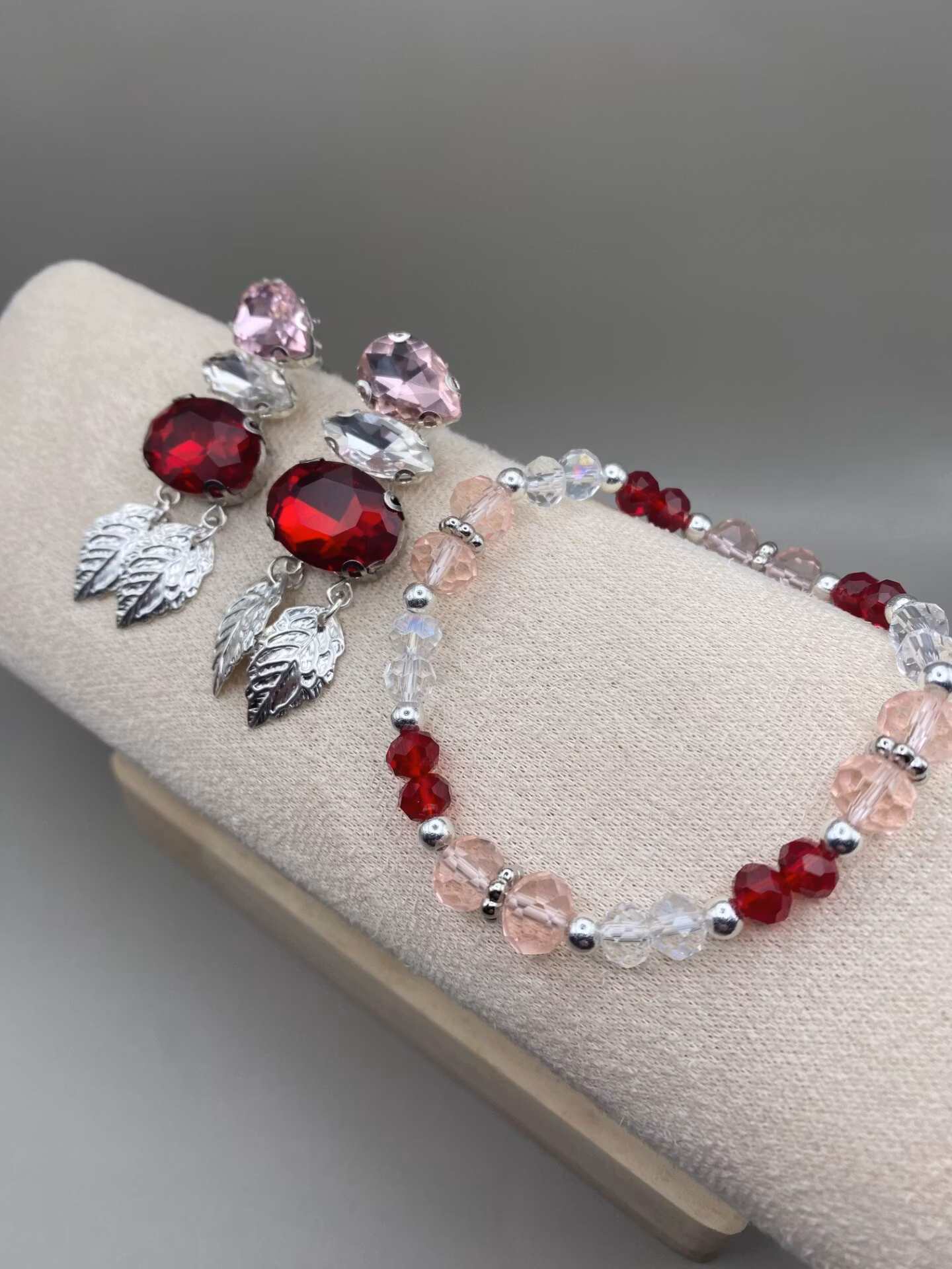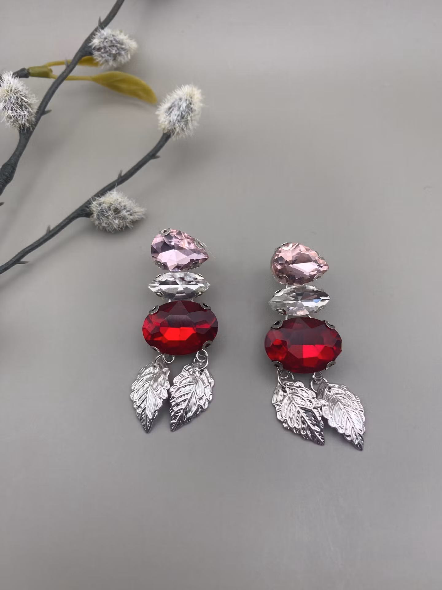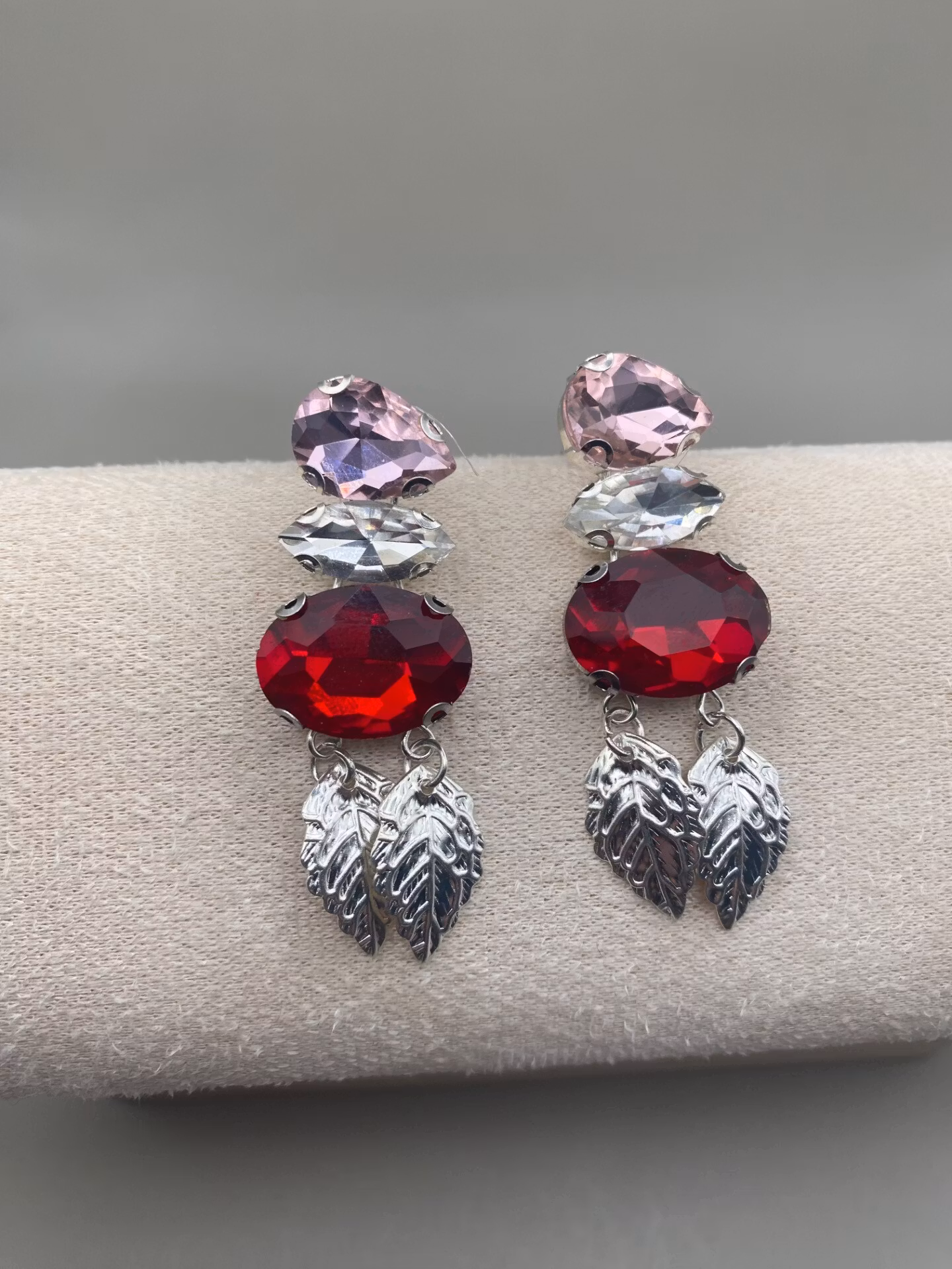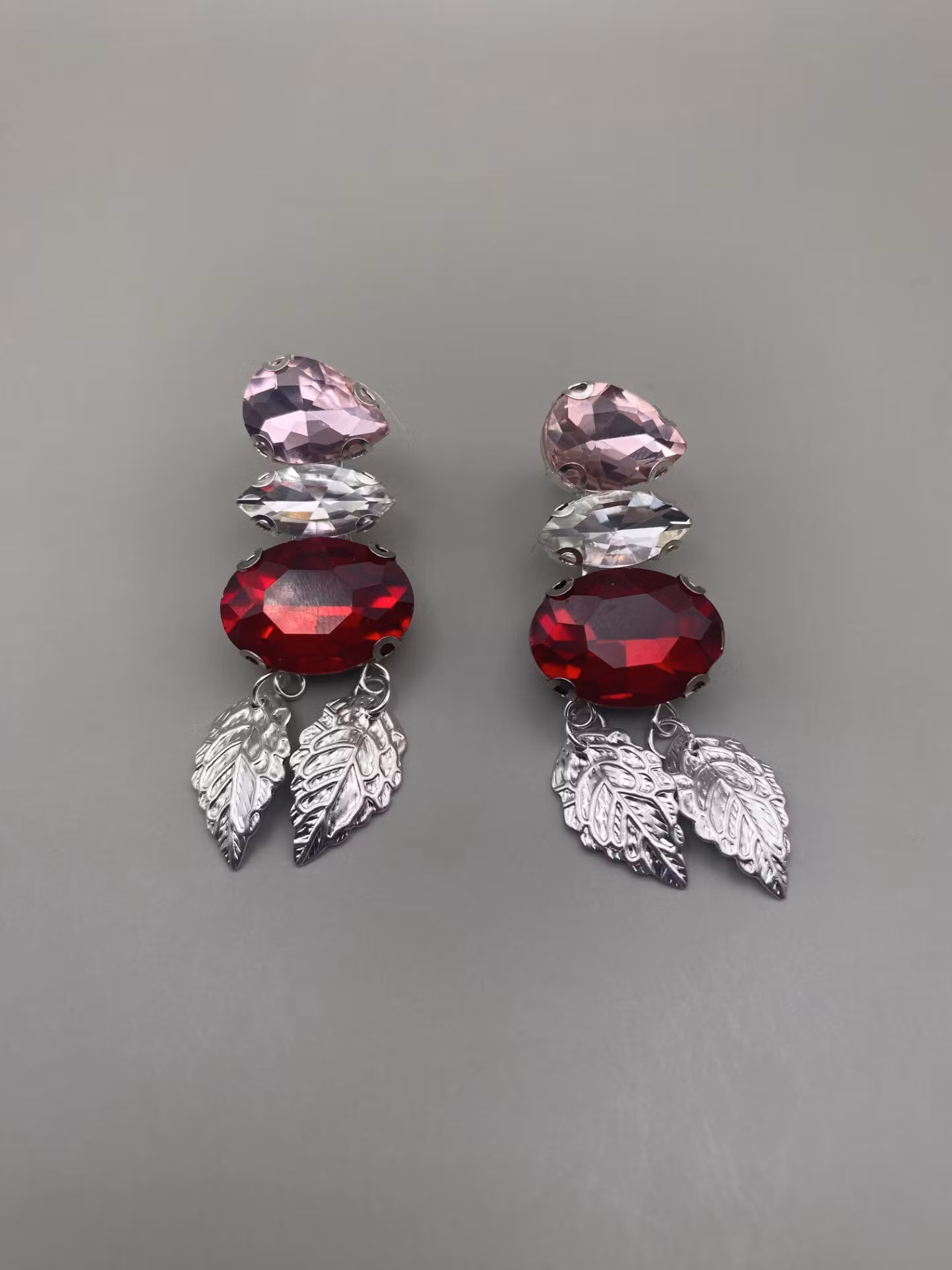 Lekfulla örhängen i varvat röd, vit och rosa glaskristall strass och två hängade silverfärgade tunna löv.