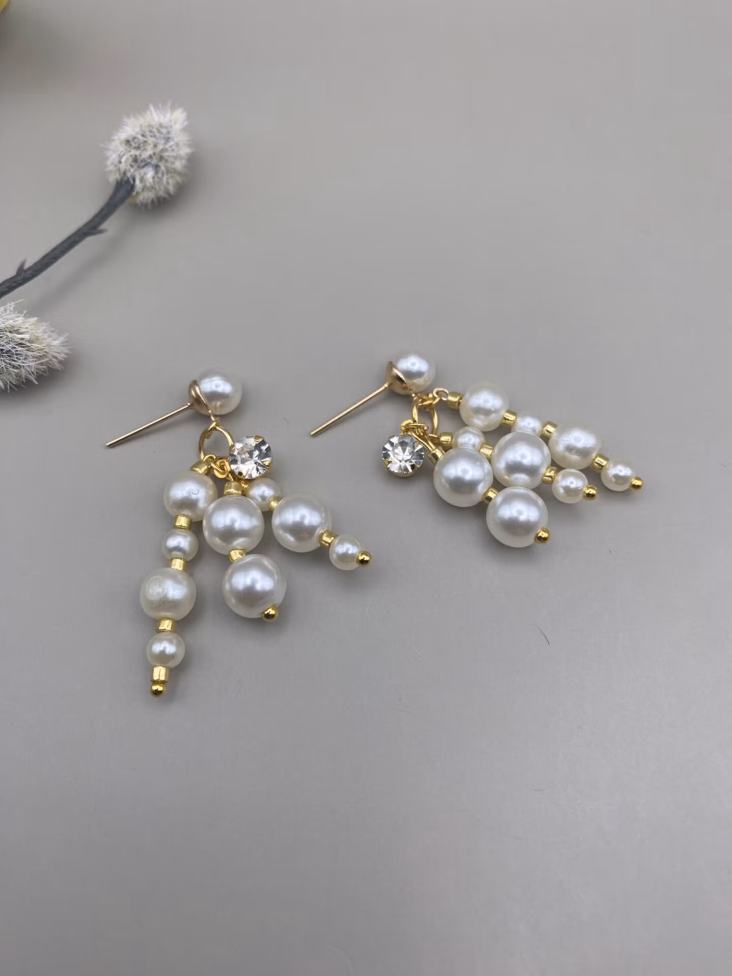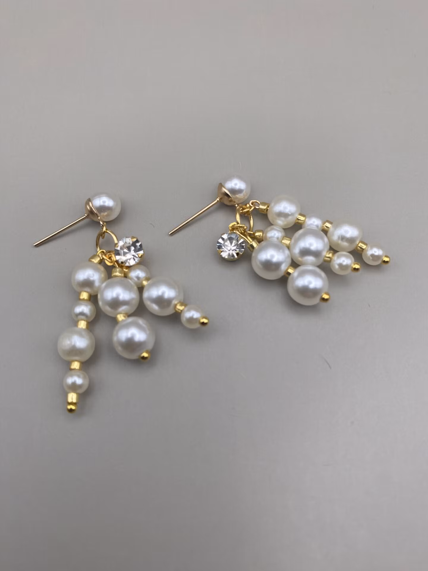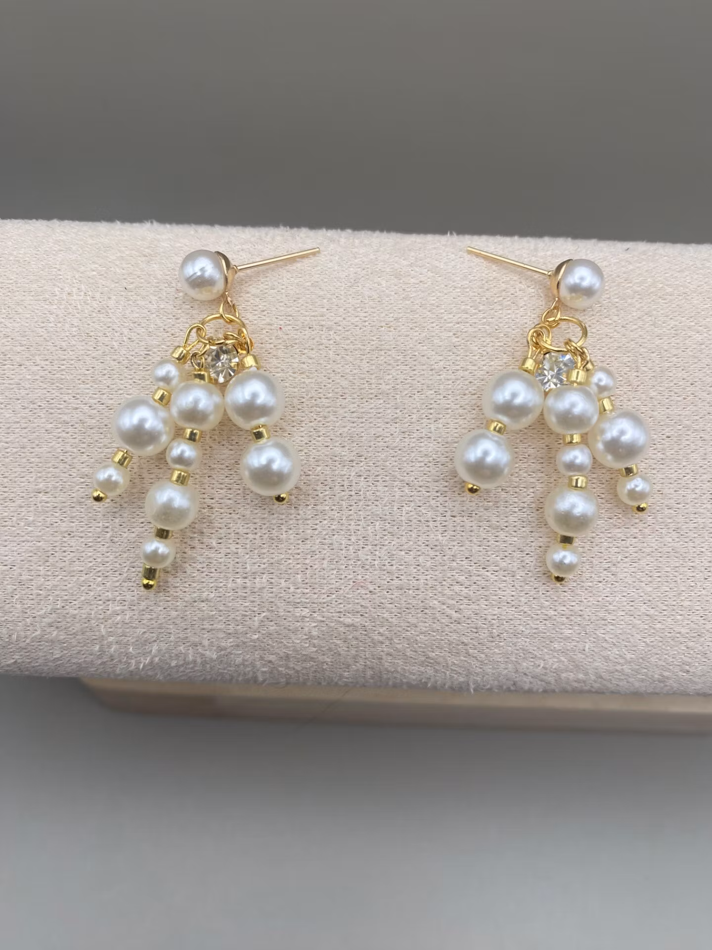 Örhängen med elfenbensvit högblank mindre pärla och hänge med tre stänger blandade olika storlekar av enfenbensfärgade högblanka pärlor och guldfärgade små glaspärlor samt en hängande cubic zirconia sten i blickfånget.